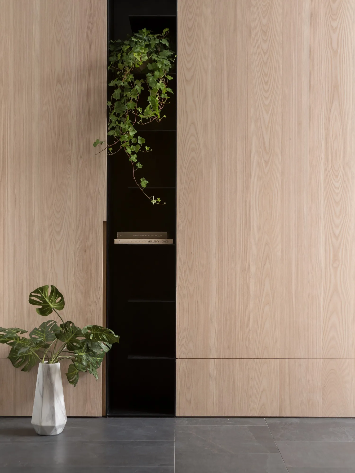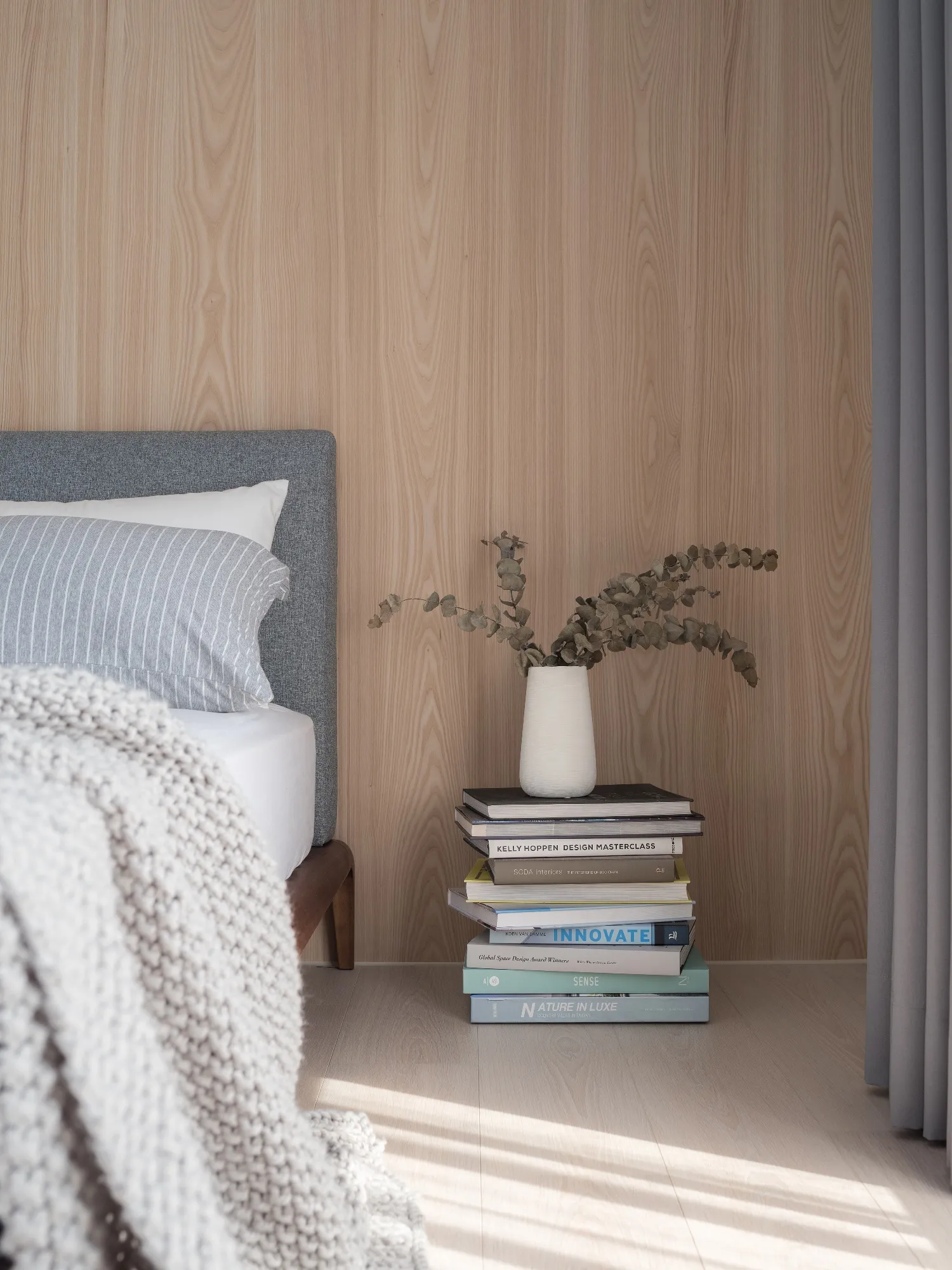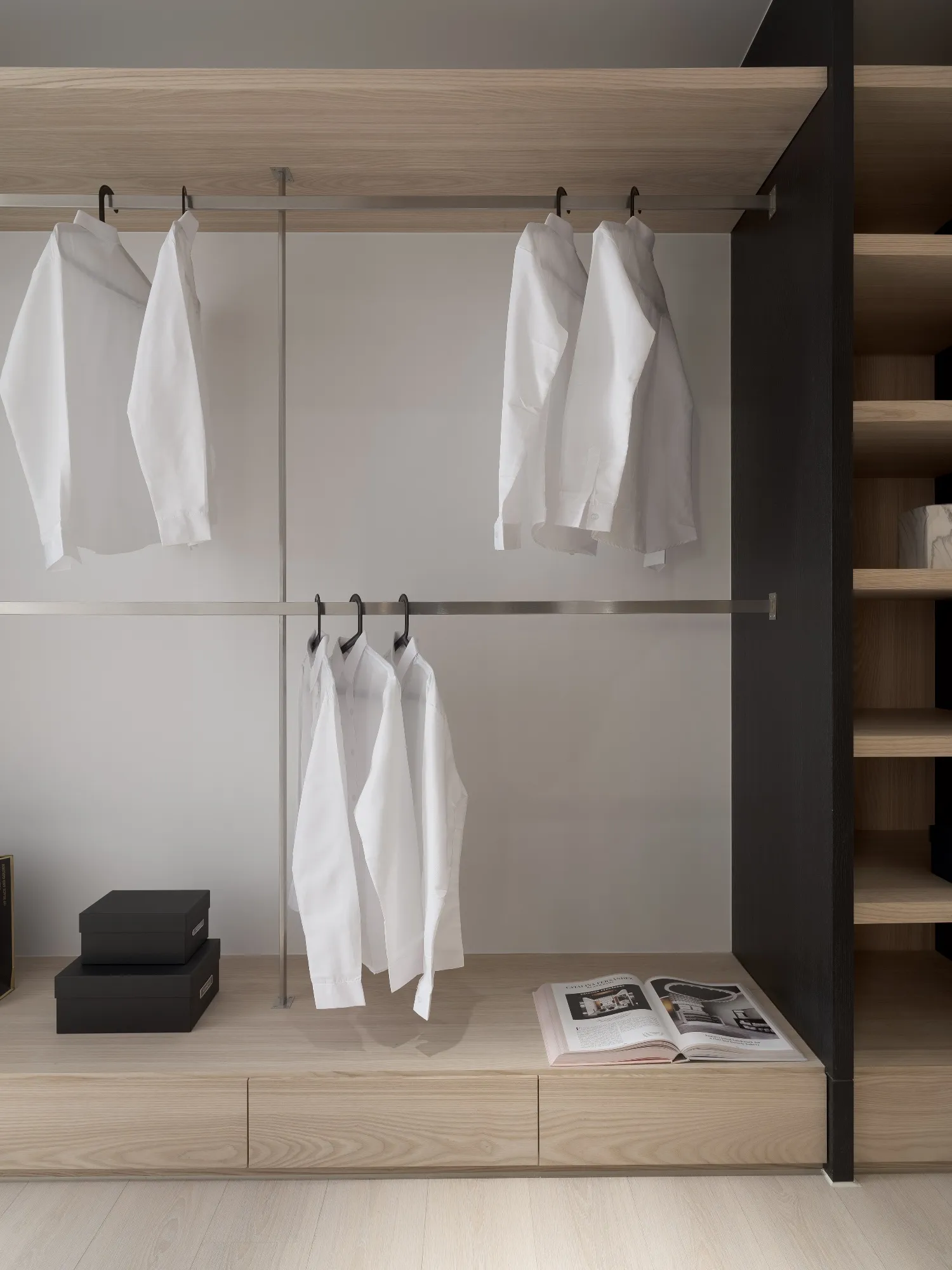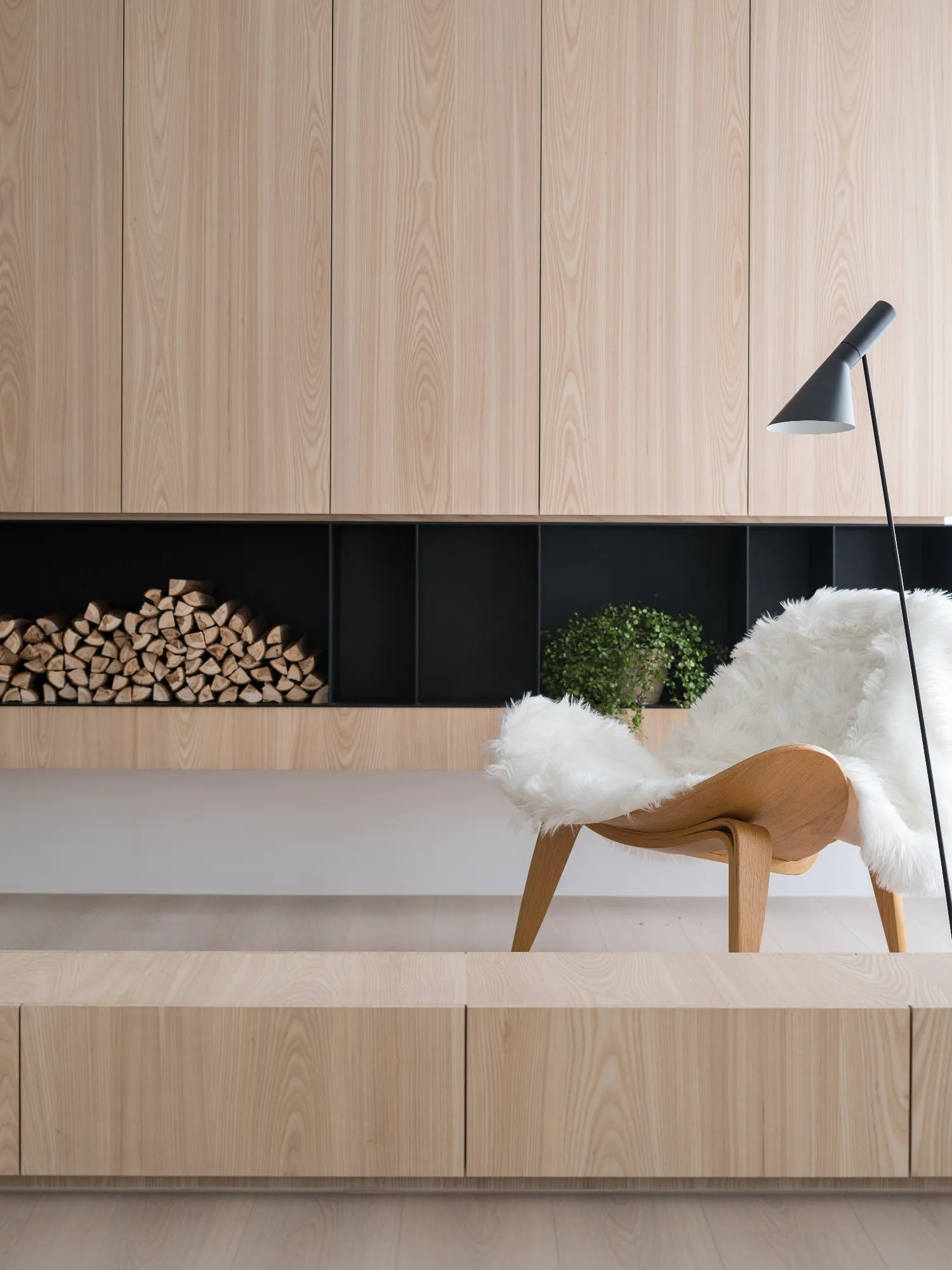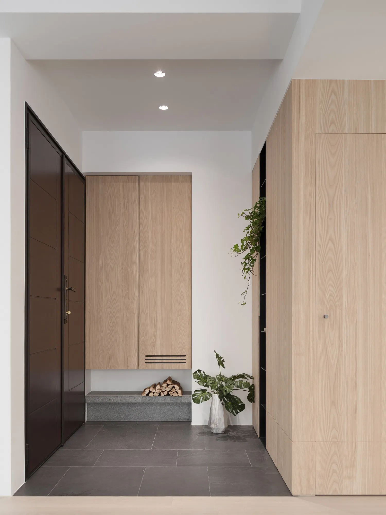 Benefiting from an abundance of natural light, this project emphasizes a design language built on warm wood veneer paired with pure white tiled walls. The natural warmth of wood replaces the coldness of stone, bringing out the material’s textures and grain, allowing the space to return to its essence. This thoughtful material selection reshapes the spatial atmosphere, allowing sunlight to softly cling to surfaces and infuse the home with a gentle and welcoming warmth. The result is a pressure-free, relaxed living environment that integrates design seamlessly into everyday life.In terms of color palette, the homeowners preferred a warm and soft visual tone, while also prioritizing home safety and open sightlines. The design avoids sharp corners and vivid colors to a safer living room environment for their child, further enhancing the spacious and comfortable quality of the shared living space.The designer focused on spatial functionality by employing a subtractive design approach—reducing mass and visual weight—tailoring the space to the clients’ lifestyle while creating fluid circulation. The warmth of the wood veneer, combined with clean white tiled walls, fosters a sense of ease and effortlessness—this design has been shaped to become their future daily reality.Stylistically, the materials and colors are soft and understated. The clean white interior pairs naturally with wood tones, creating a bright, simple, and unembellished living environment. Functional elements are blended into the overall space, while preserving its minimalist and essential character.The bedroom continues the visual and emotional tone set by the living room. Rounded furniture edges replace harsh angles to a more peaceful and balanced environment. Pale natural wood tones are highlighted throughout, evoking an unrefined, organic warmth. The tranquil atmosphere merges with sunlight and soft neutral tones, creating a space that is harmonious and serene.Spatial zoning is subtly delineated through changes in flooring material: the entrance and private zones are finished with stone tiles, while the living room, study, and dining area feature continuous solid wood flooring. To integrate the public areas into a unified whole, the designer implemented a rotating TV wall—a non-traditional yet highly functional solution. This not only emphasizes clean lines but also allows for effortless movement throughout the space, visually expanding the public area. The large floor-to-ceiling windows in the living room channel sunlight deep into the interior, bringing natural light even into the kitchen, which lacks direct exposure. This allows light and views to flow seamlessly, creating an infinite and immersive sense of openness.Situated in the heart of the city near a metro station, the residence offers both urban convenience and a peaceful retreat. The apartment’s spacious layout and exceptional natural lighting imbue the space with a relaxed and leisurely ambiance, allowing its occupants to enjoy a slower, more intentional pace of life.Furniture is curated with a neutral color scheme, complemented by light wood finishes. Built-in cabinetry is finished in white lacquer, with soft wood textures adding a sense of warmth. Linear divisions outline the architectural massing and enhance the three-dimensional feel of the space, resulting in a minimal yet impactful spatial presence.In the guest room, a curved ceiling was designed to soften the visual impact of structural beams, creating a sculptural and flowing form. This feature also extends the visual lines of the space. A single wall finished with concrete-effect plaster serves as a muted backdrop, echoing the natural tones of the wood and further enhanced by streaming sunlight. The effect is one of understated tranquility and ease.Taking advantage of the expansive natural lighting, warm off-white floor-to-ceiling sheers diffuse the sunlight, while accent lighting is strategically placed throughout the home. The designer also uses point lighting to reveal the subtle textures and expressions of various materials, adding layers of visual depth to the living room. With the interplay between natural daylight and multiple points of illumination, the visual rhythm of the space becomes rich and varied.Furniture pieces are selected for both simplicity and character, standing out as distinctive elements that enrich the overall composition. This creates a cohesive and harmonious visual narrative—one that is clean, elegant, and effortless.