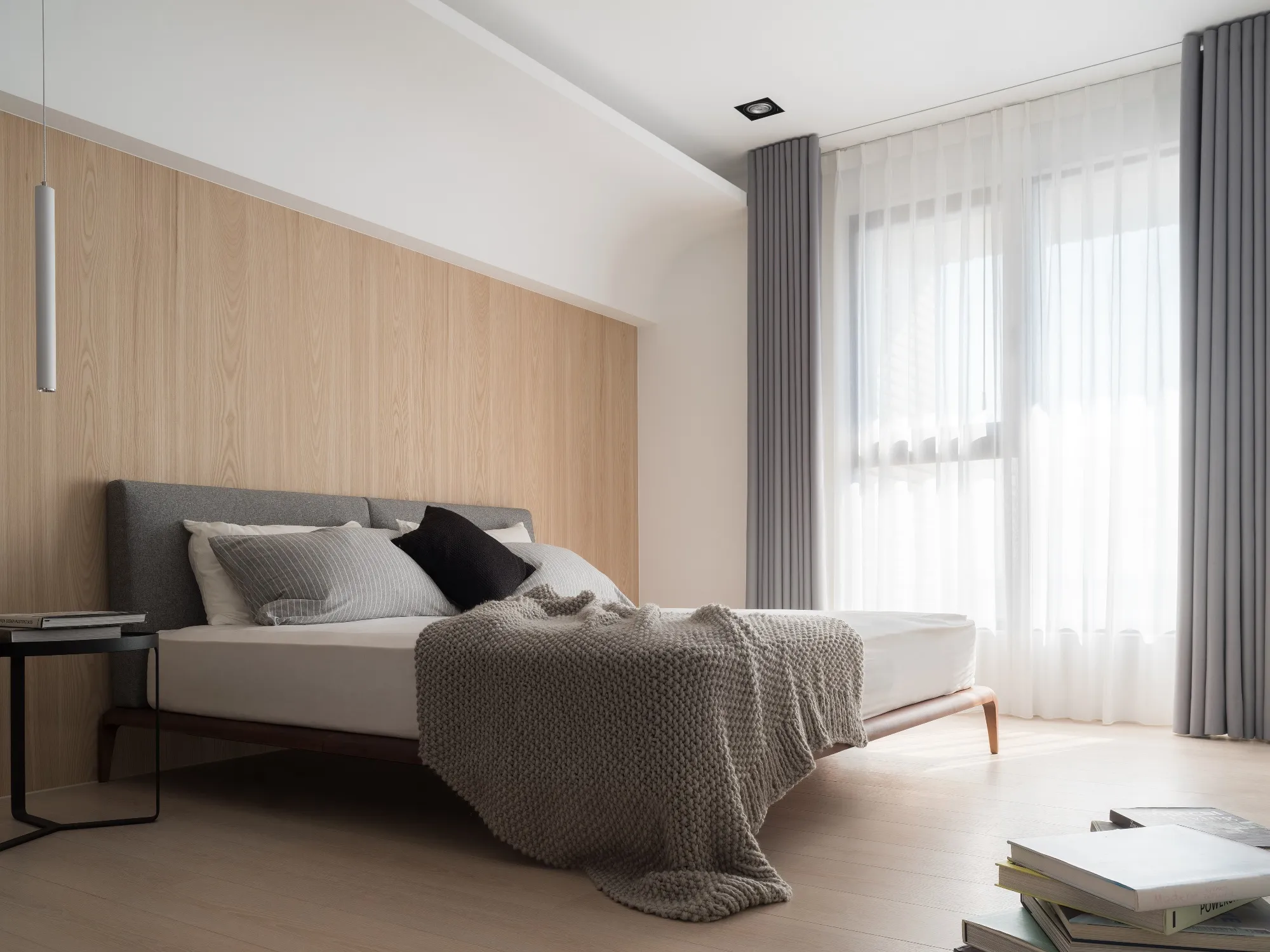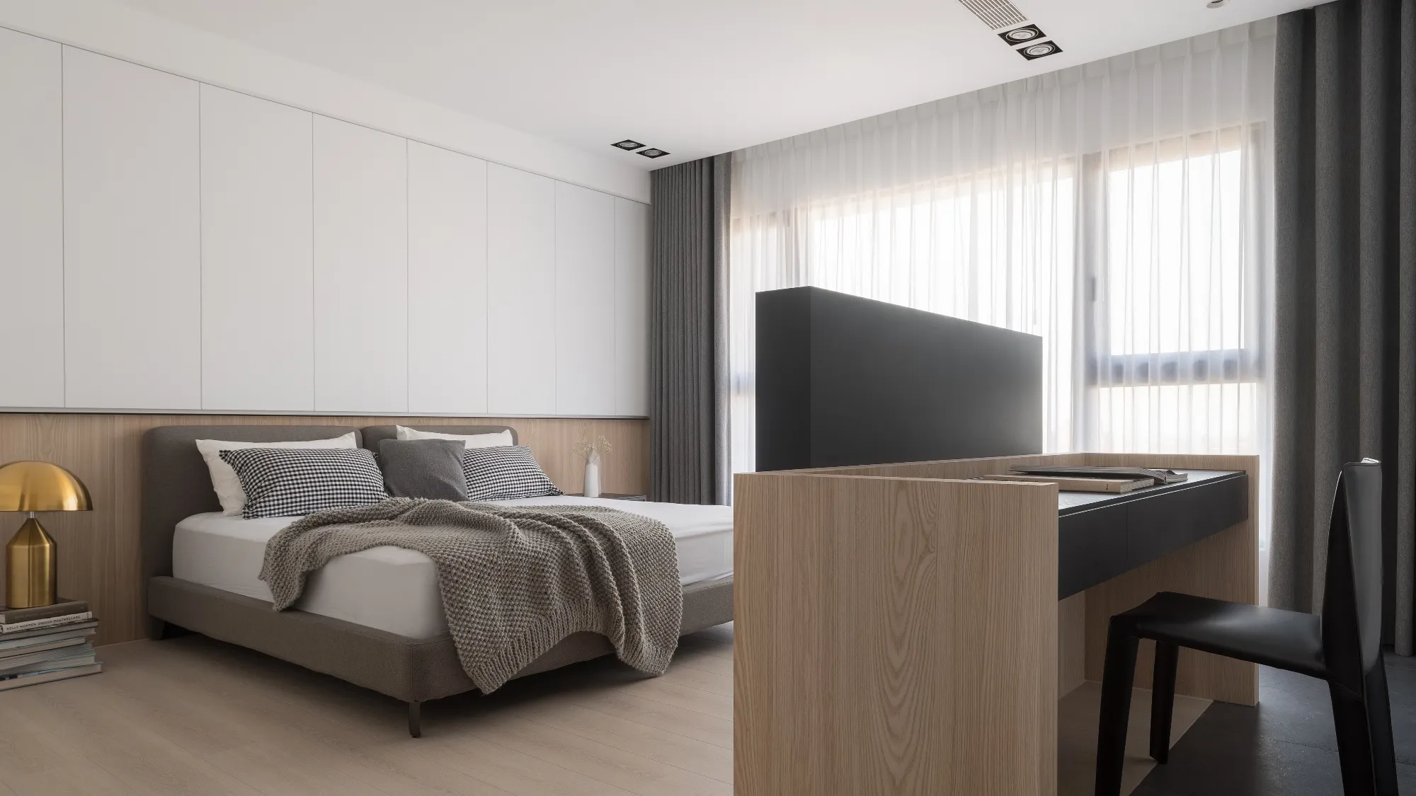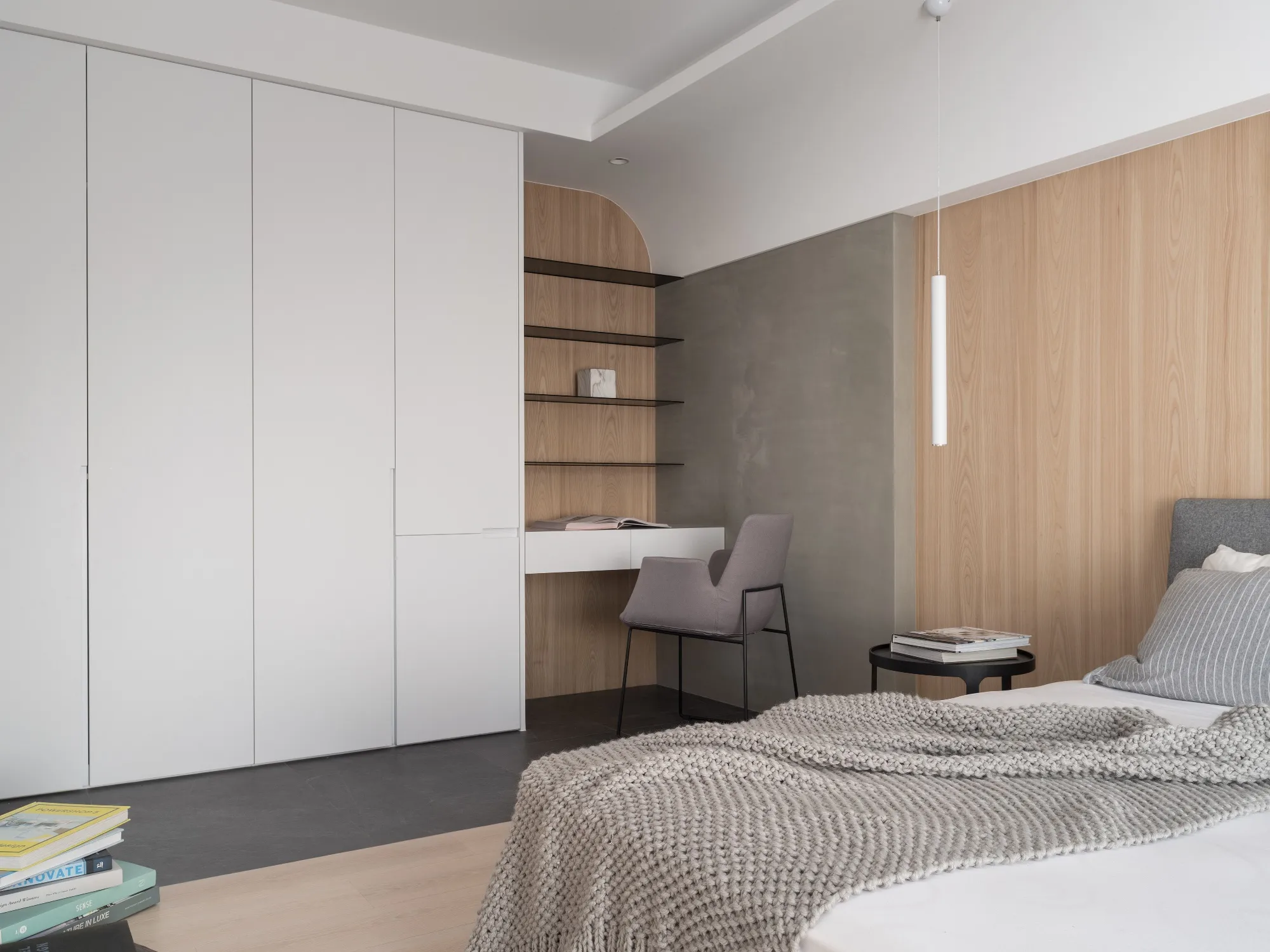 由於本案擁有先天優異的大面積採光,設計上以溫潤的木皮配合純白色的磁磚牆面,溫暖的木色取代冰冷的石材,材質與肌理紋路的顯現,使得空間回歸本質,將原空間氛圍重新塑造,使日光稍然攀附於空間之中,形塑柔和溫馨的居家氛圍。更顯無壓愜意,讓居家設計更貼近日常生活。在空間色彩上,業主喜愛溫潤柔和的視覺感受,同時注重居家環境安全與視野更為設計重點,以避免鮮豔及銳角,強化孩子在客廳玩耍的安全空間,進而使公共區域更加寬闊自在。設計師在空間的規劃上,著重於空間的功能性,透過減去量體的思維手法,不僅更能符合屋主的生活習慣,更多了視覺及動線的流暢,配合溫潤的木皮及純白色的磁磚牆面,更顯無壓愜意。成了未來的日常。於風格形塑上,用材用色柔和素雅,白淨空間搭佐木質語彙,簡單明亮無過多綴飾,以求機能合併卻依然擁有單純簡約的空間本質。臥室整體風格色調與客廳亦相輔相成,減去家具的稜角,更顯圓潤平和。將淺色系的自然木質感襯托展顯出來,那一絲絲自然最原始的風味, 呈現靜謐的空間氛圍,與日光簡約明亮的溫暖色系交融,勻淨美好。設計師藉由地坪的轉換,將空間屬性界線簡單的分割,將公共空間一分為二,其一為玄關延伸至私領域的石材地磚;其二為客廳、書房與餐廳相連的實木木質地板,為了讓公共空間整合為一體,以旋轉式電視牆打破傳統,除了突顯整體線條感,也方便居住者可以輕而易舉的通往各空間,進而使公共區域更加遼闊自在,也讓位於室內較無採光的廚房透過客廳大面積的落地窗感受到陽光的溫暖,更讓視線與日光無盡延伸,久久看來卻無處不美好。建築物旁坐落城市最核心,位於捷運站旁,機能之餘,喬立雍容也瀰漫著與世無爭,室內大坪數及大面積採光,也讓空間染上一點悠閒的氛圍,讓居住者於空間之中亦能享受生活的慢步調。家具整體色系上以無色彩的配色搭配些許淺色木皮呈現,櫃體以白色烤漆搭配清新溫潤的木紋質感,最後利用線性分割勾勒出空間的輪廓增加其整體的立體感,塑造簡而有力的空間量感。位於客房獨有的弧型天花設計,修飾生硬樑柱造成的壓迫感,交織出獨特的視覺造型,也做為視覺的延伸,搭配一抹仿清水模塗料牆面,做為空間的染劑,樸實自然的材質增添了木質的溫暖,搭配陽光的灑下,為空間注入一絲溫暖悠然的氣息。因擁有大面積自然採光的優勢,搭佐全幅落地的暖白色紗簾,再選擇重點式的燈光照明,適度分散的在空間中。設計師更利用點光源,演繹材質肌理與空間的不同表情,為客廳塑造更多層次的光度變化。從客廳湧入的自然光及多點光源混合運用下,展現出層次多變的視覺豐富感。家具選擇簡單兼具品味之單品,易凸顯自身之特色, 使空間逐漸相容構成無違和感且簡單大方俐落的畫面。