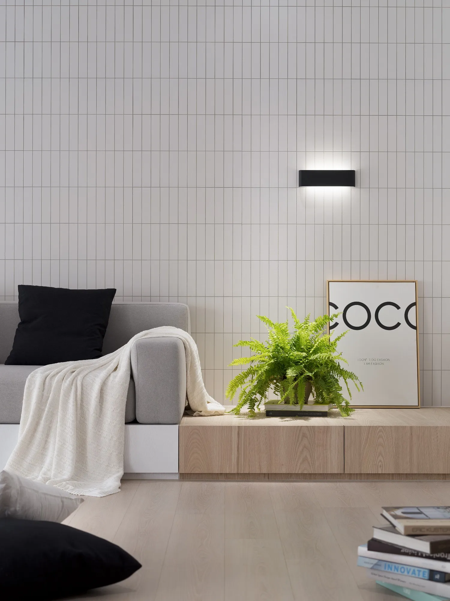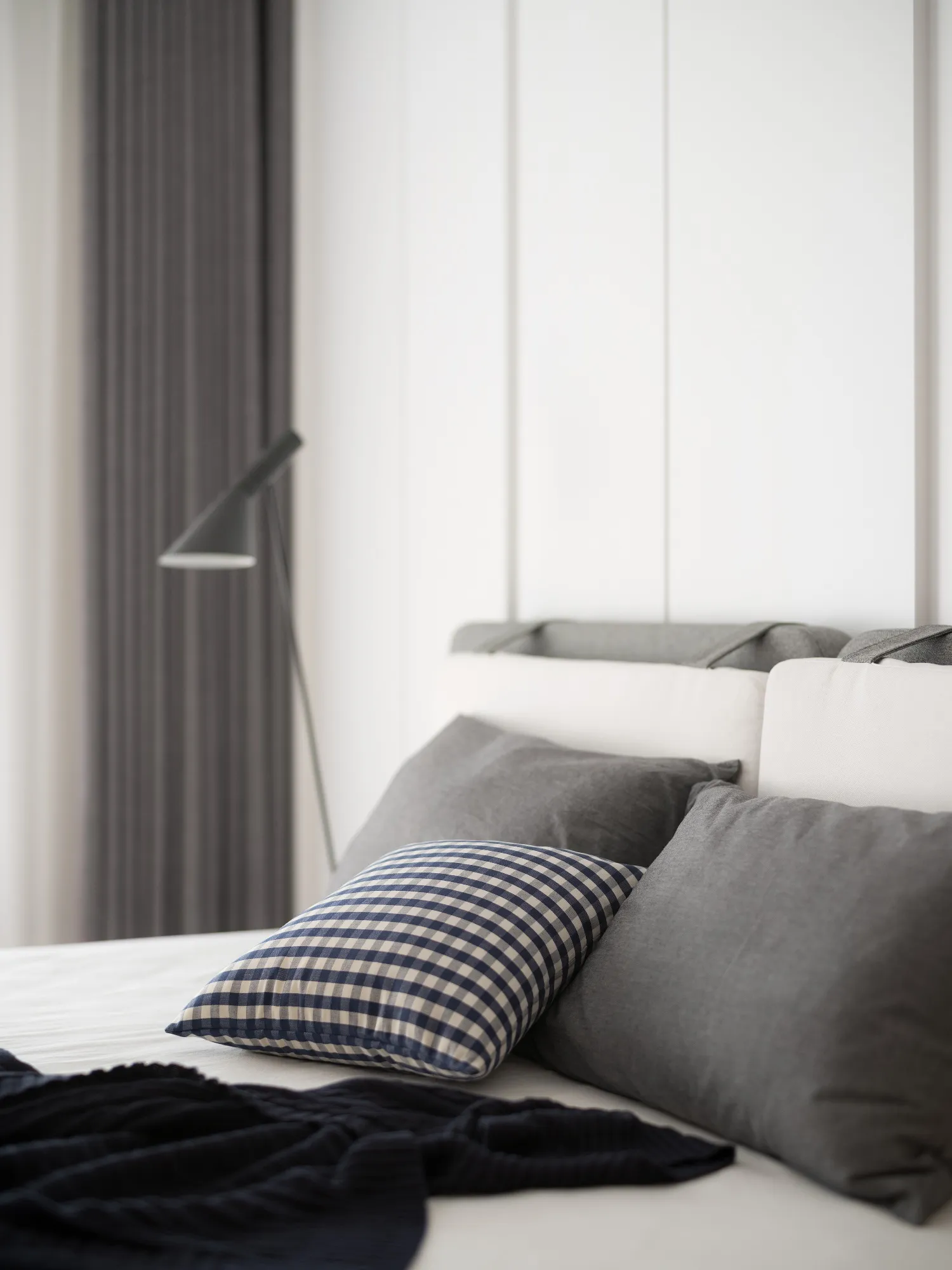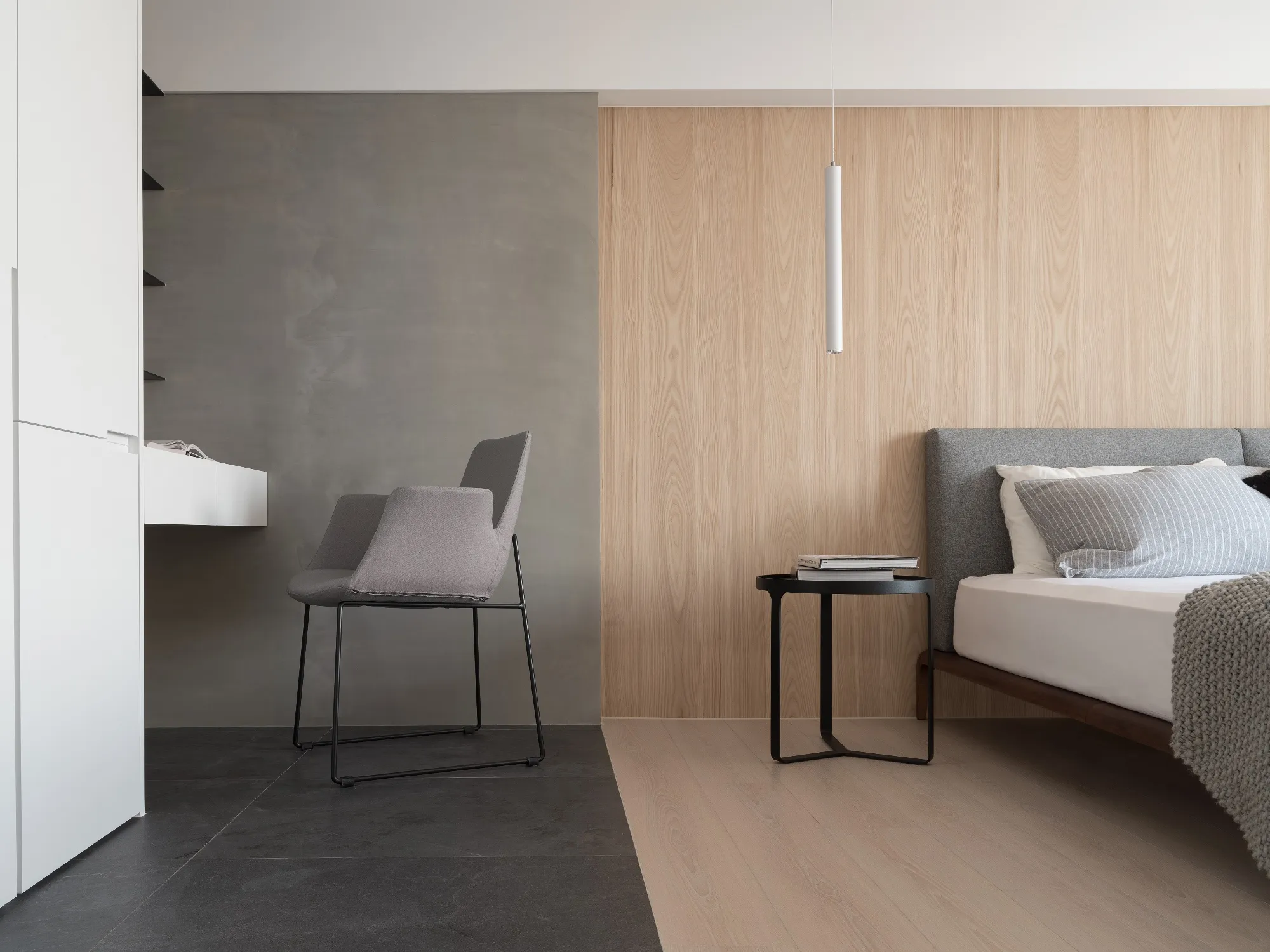 由於本案擁有先天優異的大面積採光,設計上以溫潤的木皮配合純白色的磁磚牆面,溫暖的木色取代冰冷的石材,材質與肌理紋路的顯現,使得空間回歸本質,將原空間氛圍重新塑造,使日光稍然攀附於空間之中,形塑柔和溫馨的居家氛圍。更顯無壓愜意,讓居家設計更貼近日常生活。在空間色彩上,業主喜愛溫潤柔和的視覺感受,同時注重居家環境安全與視野更為設計重點,以避免鮮豔及銳角,強化孩子在客廳玩耍的安全空間,進而使公共區域更加寬闊自在。設計師在空間的規劃上,著重於空間的功能性,透過減去量體的思維手法,不僅更能符合屋主的生活習慣,更多了視覺及動線的流暢,配合溫潤的木皮及純白色的磁磚牆面,更顯無壓愜意。成了未來的日常。於風格形塑上,用材用色柔和素雅,白淨空間搭佐木質語彙,簡單明亮無過多綴飾,以求機能合併卻依然擁有單純簡約的空間本質。臥室整體風格色調與客廳亦相輔相成,減去家具的稜角,更顯圓潤平和。將淺色系的自然木質感襯托展顯出來,那一絲絲自然最原始的風味, 呈現靜謐的空間氛圍,與日光簡約明亮的溫暖色系交融,勻淨美好。設計師藉由地坪的轉換,將空間屬性界線簡單的分割,將公共空間一分為二,其一為玄關延伸至私領域的石材地磚;其二為客廳、書房與餐廳相連的實木木質地板,為了讓公共空間整合為一體,以旋轉式電視牆打破傳統,除了突顯整體線條感,也方便居住者可以輕而易舉的通往各空間,進而使公共區域更加遼闊自在,也讓位於室內較無採光的廚房透過客廳大面積的落地窗感受到陽光的溫暖,更讓視線與日光無盡延伸,久久看來卻無處不美好。建築物旁坐落城市最核心,位於捷運站旁,機能之餘,喬立雍容也瀰漫著與世無爭,室內大坪數及大面積採光,也讓空間染上一點悠閒的氛圍,讓居住者於空間之中亦能享受生活的慢步調。家具整體色系上以無色彩的配色搭配些許淺色木皮呈現,櫃體以白色烤漆搭配清新溫潤的木紋質感,最後利用線性分割勾勒出空間的輪廓增加其整體的立體感,塑造簡而有力的空間量感。位於客房獨有的弧型天花設計,修飾生硬樑柱造成的壓迫感,交織出獨特的視覺造型,也做為視覺的延伸,搭配一抹仿清水模塗料牆面,做為空間的染劑,樸實自然的材質增添了木質的溫暖,搭配陽光的灑下,為空間注入一絲溫暖悠然的氣息。因擁有大面積自然採光的優勢,搭佐全幅落地的暖白色紗簾,再選擇重點式的燈光照明,適度分散的在空間中。設計師更利用點光源,演繹材質肌理與空間的不同表情,為客廳塑造更多層次的光度變化。從客廳湧入的自然光及多點光源混合運用下,展現出層次多變的視覺豐富感。家具選擇簡單兼具品味之單品,易凸顯自身之特色, 使空間逐漸相容構成無違和感且簡單大方俐落的畫面。