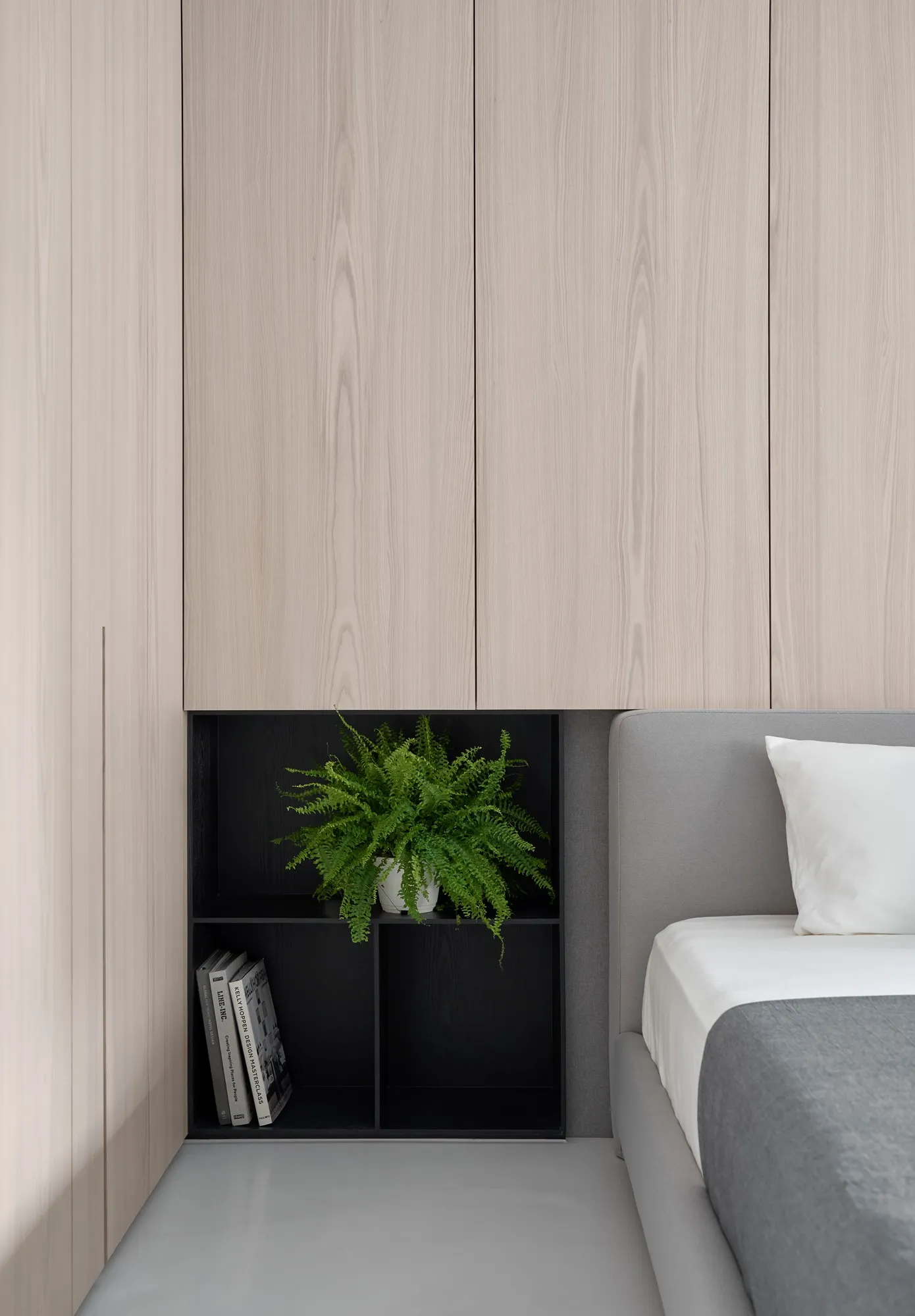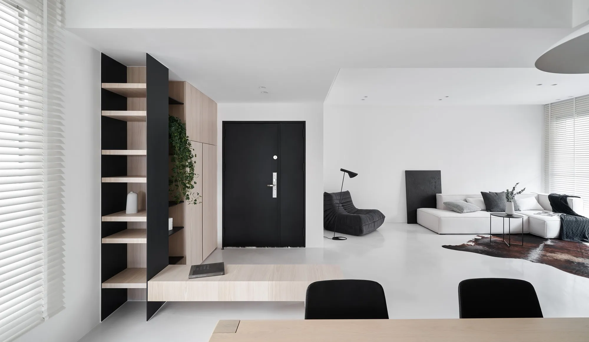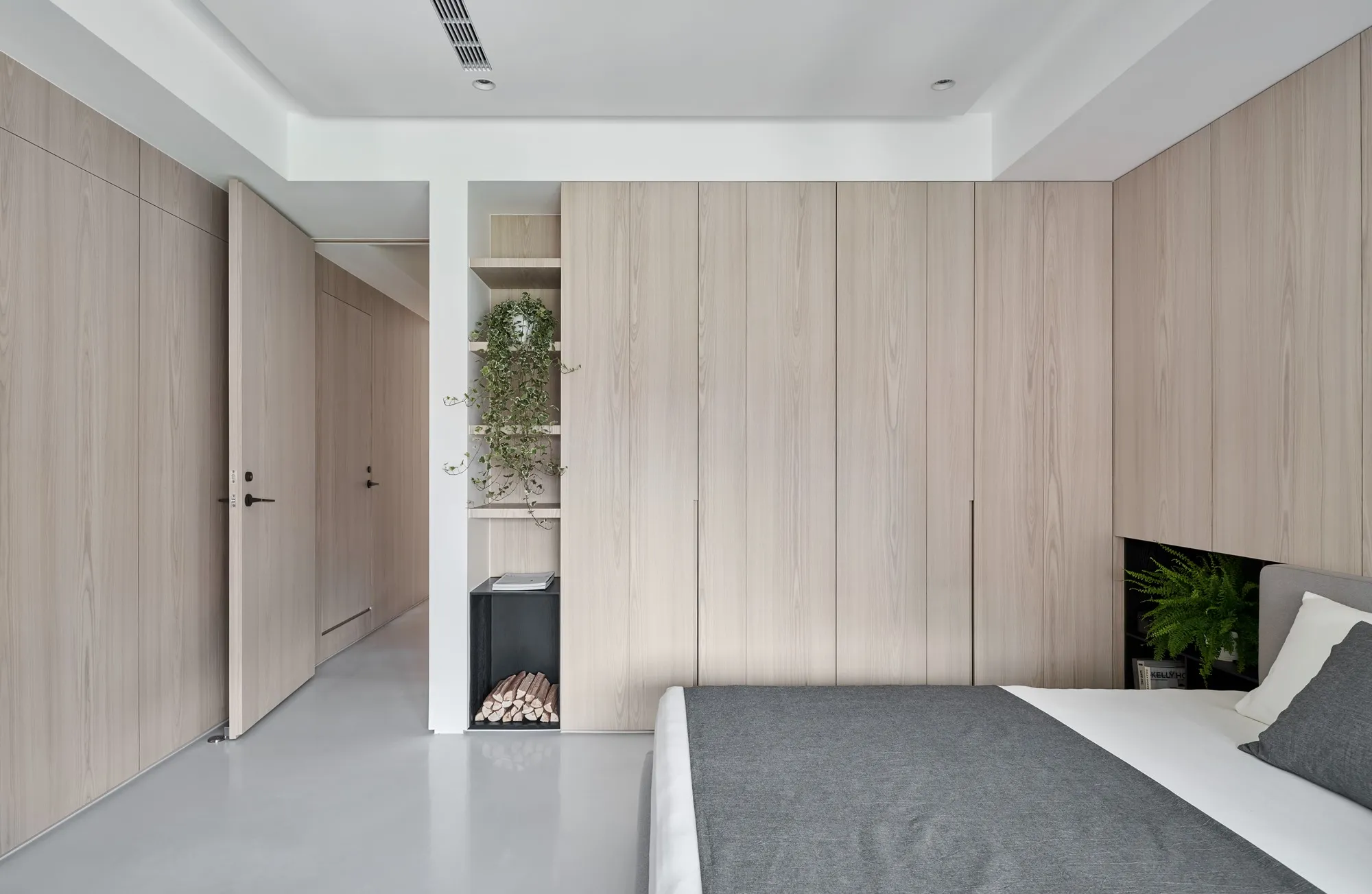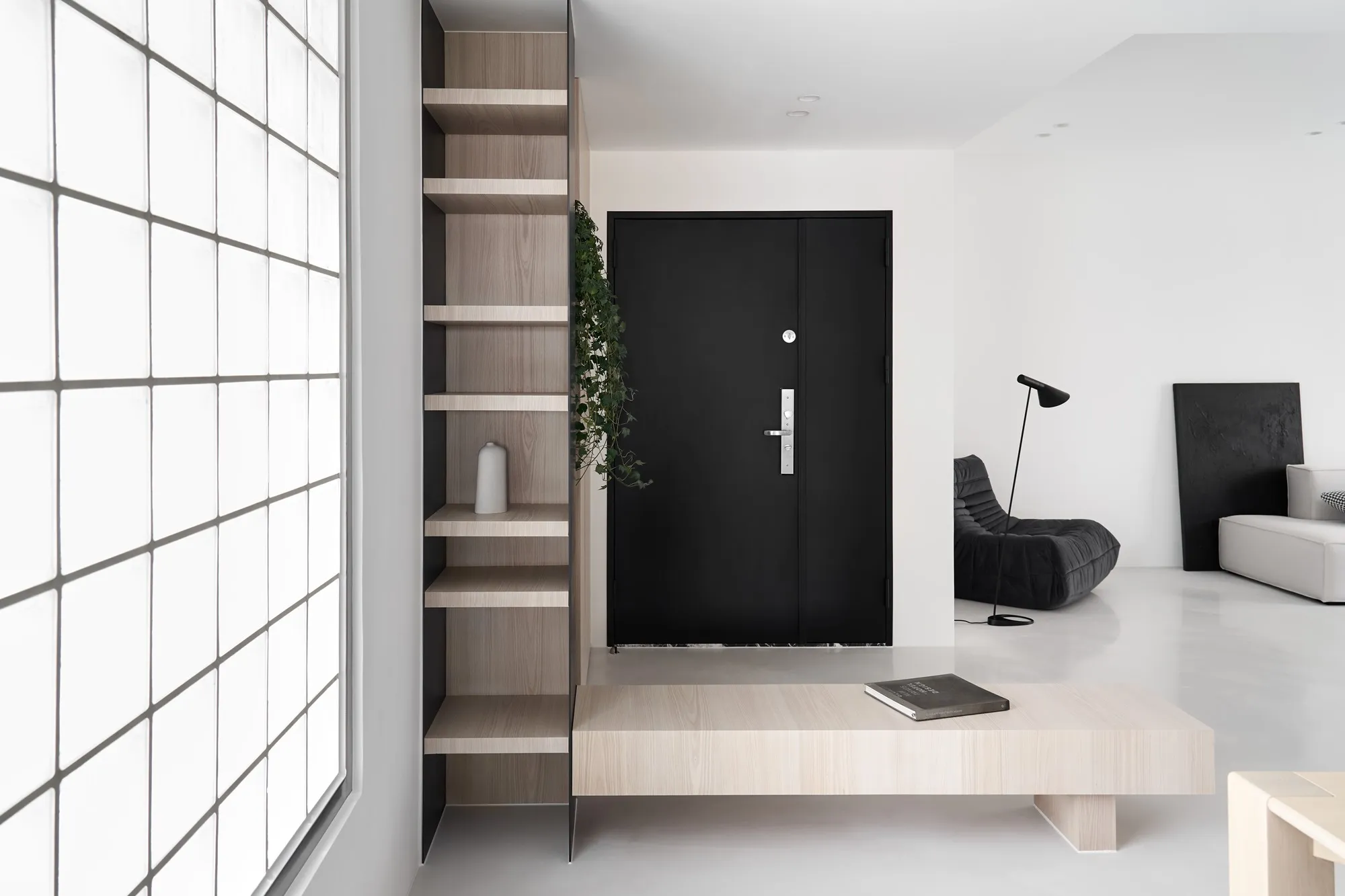 The designer for this project has combined the proprietor’s understanding towards simple ecological aesthetics and lifestyle, using straightforward but exquisite design techniques to the overall cozy and tranquil effect. Upon entering the lounge, one is welcomed by sufficient sunlight and warm temperament, where the cream white seamless flooring quietly complements each corner in the house, while a light grey sofa placed by the window with black velvet chair enriched the visual layers. The television wall utilized a large area of warm wooden colors to go with the black iron, perfectly interpreting the ingenious design of sturdiness within softness, while the overall color tone is comfortable, peaceful with a majestic manner. The glass brick windows the best lighting and ambience for the restaurant, while the dark black colored dining chairs and simple wood-tone dining tables correspond mutually with the lounge design, allowing the overall quality with an ultimate presentation. The paralleled kitchen style has adopted a massive amount of wooden texture to a warm sentiment, the simpler the elements, the more comfortable and durable charm they offer; the end of the kitchen shows a massive amount of natural lighting, which is the most luxurious decoration. The style adopted in the bedroom is constant with the lounge, but it is purposed as a private space for resting, hence it has to have the characteristics of quietness and coziness. For the design, we eliminated exaggerated decorations, and replaced with mild color tones to a tranquil and dignified feeling. When the sunlight gently shines into the bedroom, a space filled with tranquility and harmony is created. “ Regression” perfectly interprets how people find their exclusive tranquility at home after fatigued by a busy day, where they regress to their most original personality and innate character. The overall simple modern style makes people feel free and comfortable, whereas the massive amount of original wood with dignified and elegant color tones, the well-executed lines, the distinctive layout and the strong structurability result in the self-evident natural spatial quality.