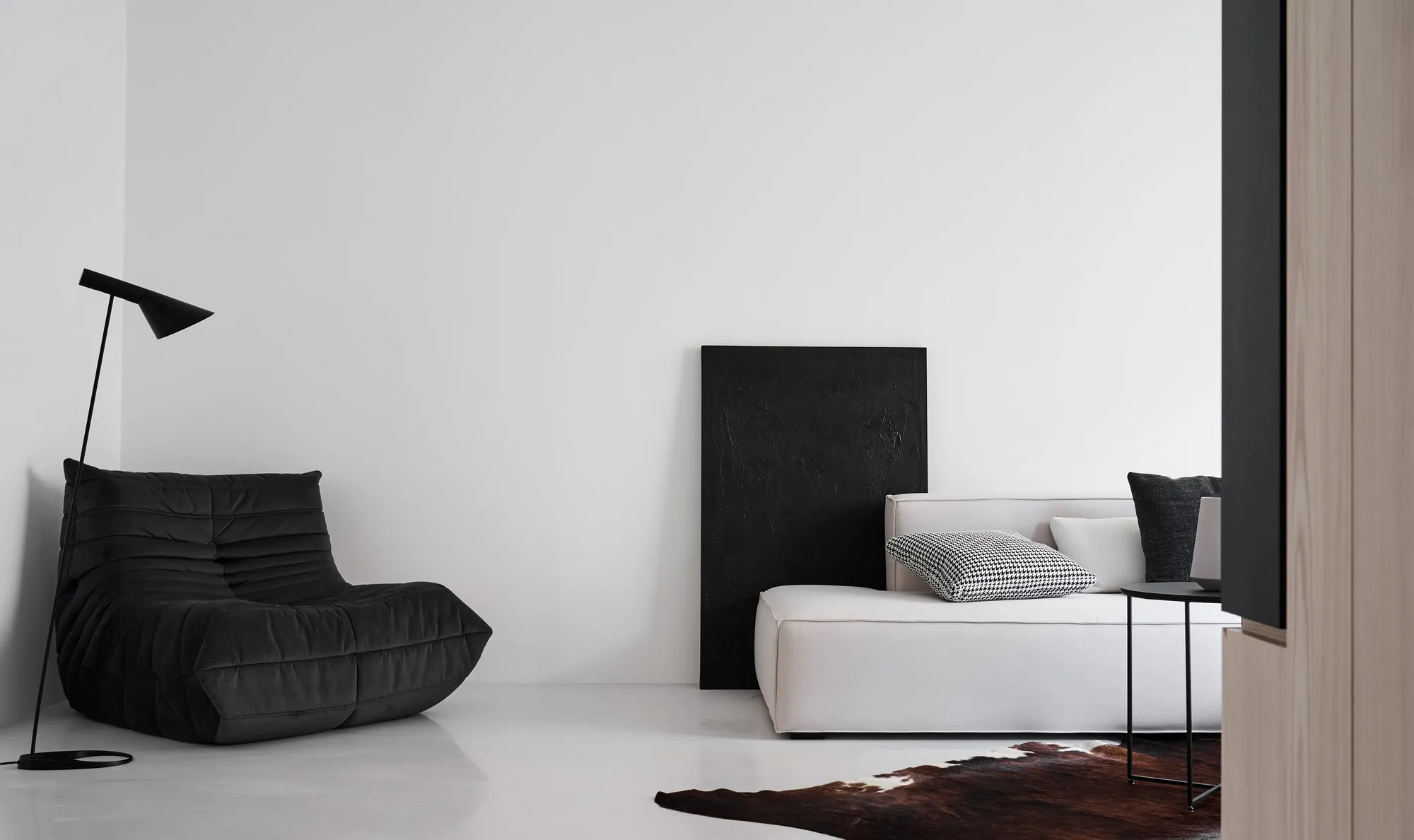本案設計師結合業主對原生態美學和生活方式的理解,用簡約精緻的設計手法去營造溫馨寧靜的整體效果。走進客廳,充足的光線和溫暖的氣息印入眼簾,米白色的無接縫地板靜靜的映襯著家裡的每個角落,一張淺灰色的沙發擺放在靠窗的位置,搭配黑色絨布單椅,豐富了視覺的層次。電視牆利用大面積溫潤木質調的色系搭配黑色鐵件,極好的詮釋了柔中帶剛的設計巧思,整體色調舒適、寧靜又不失大氣。玻璃磚窗為餐廳營造了最好的燈光氣氛,深黑色系的餐椅以及簡單木質調的餐桌與客廳設計相互呼應,讓整體質感顯現到極致。二字型的廚房採用大量木質創造溫潤感,越簡單的元素越舒適耐看且迷人,而廚房盡頭透出的大量自然光,則是最奢華的裝飾。臥室的風格色調與客廳一致,但它作為休息的私密區域,須具有安靜、溫馨的特點。設計上我們摒棄了浮華的裝飾,採用溫和的色調來營造出安靜沉穩的感覺。陽光微微的透進臥室,打造出充分寧靜與祥和的空間。《回歸》極好的詮釋了人們在忙碌了一天的疲憊後,在家中找回了自己獨有的寧靜,回歸了自我最原始的性情與本質。整體簡約的現代風格令人自在安怡,大量原始木質搭配沉穩溫麗的色調下,線條俐落有緻,格局清晰,架構性強,空間質感自然不言而喻。