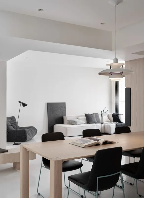 玻璃磚窗為餐廳營造了最好的燈光氣氛,深黑色系的餐椅以及簡單木質調的餐桌與客廳設計相互呼應,讓整體質感顯現到極致。