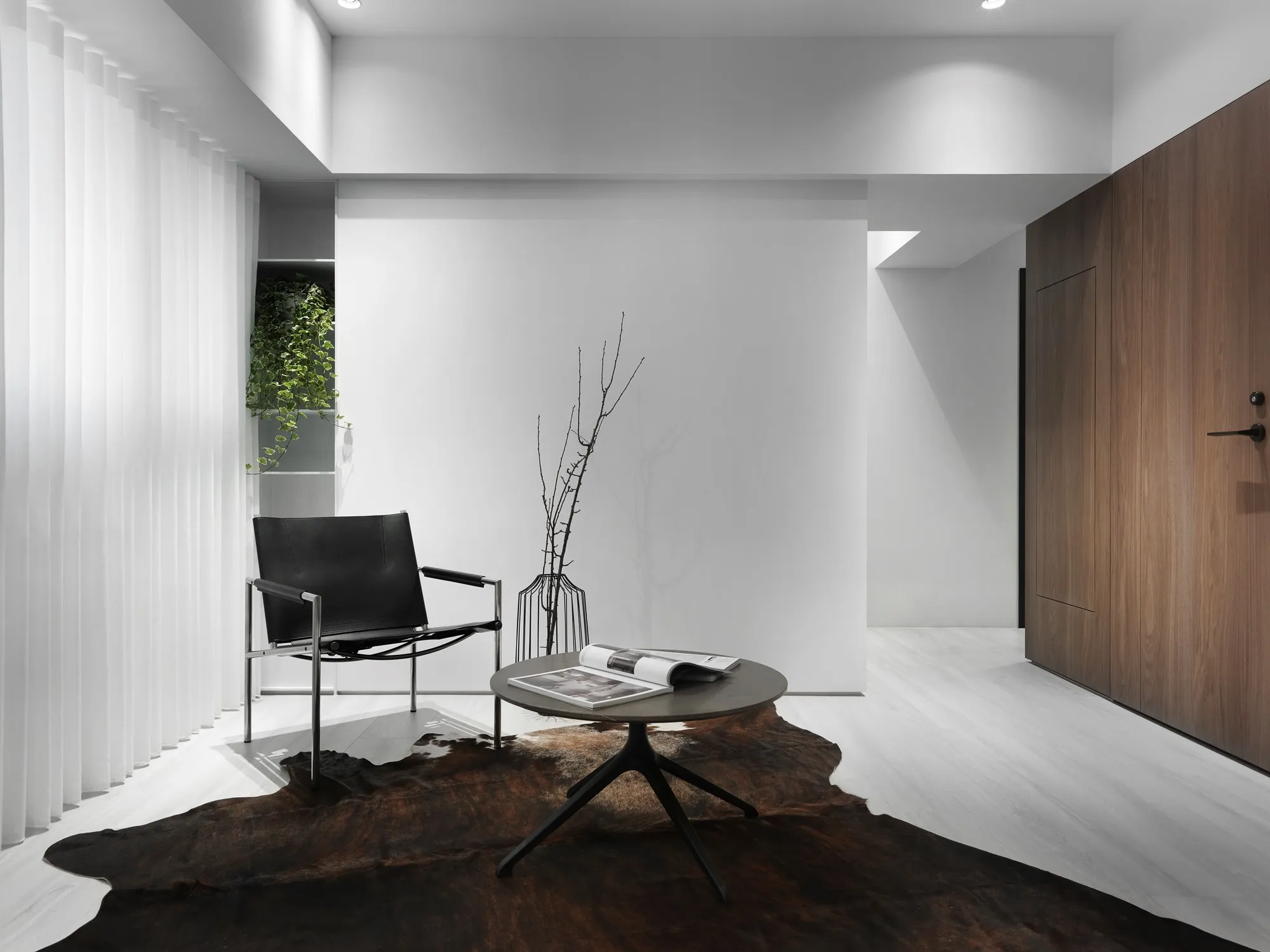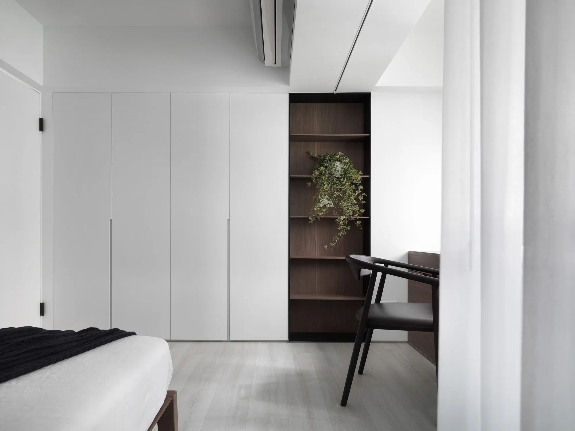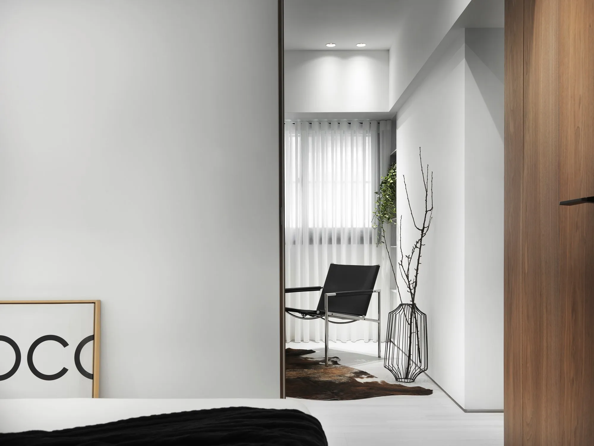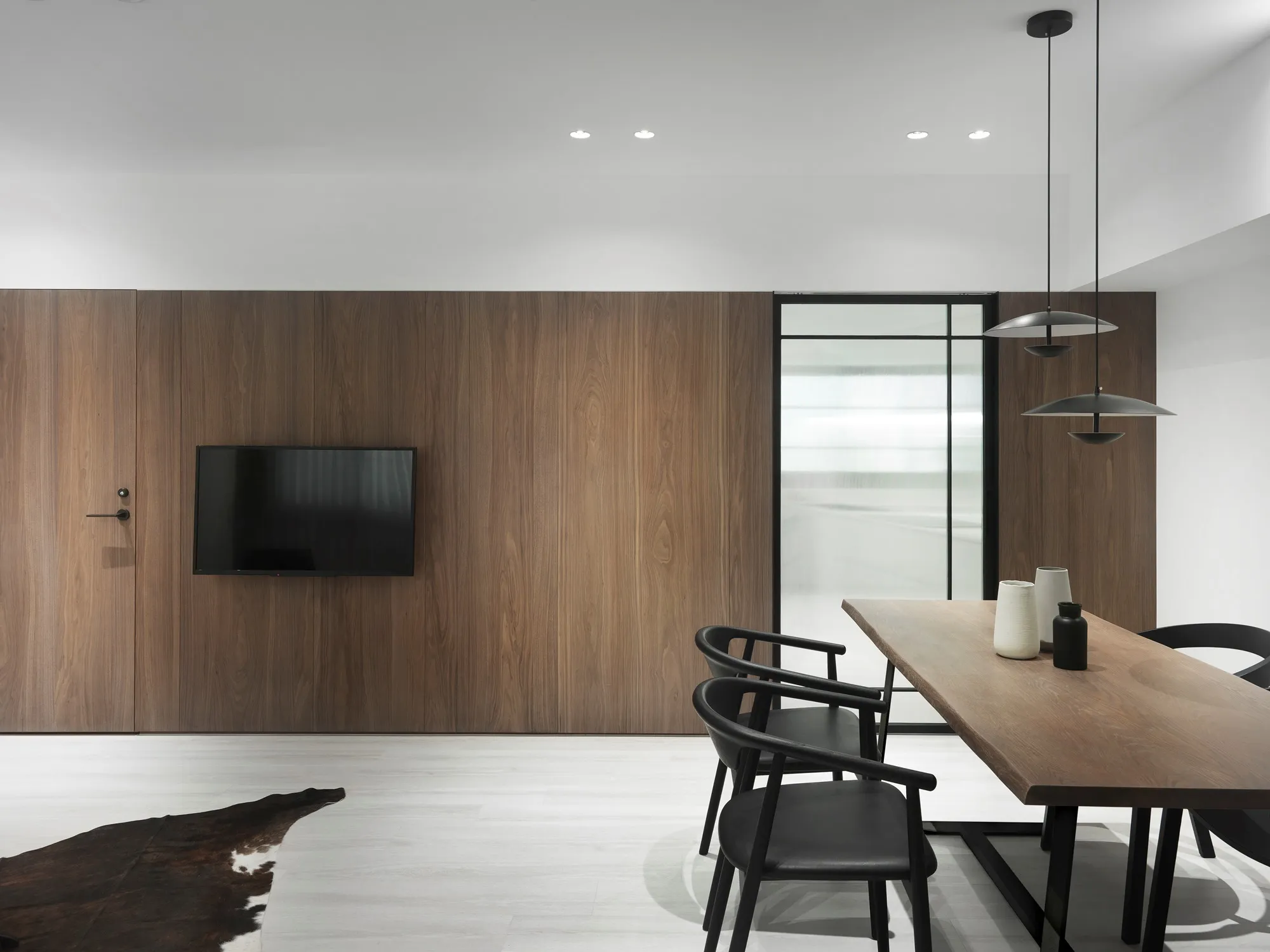 捨棄繁雜裝飾,忠於質感,以線條、切割手法呈現空間原有樣貌,適度留白以達簡約舒適的生活哲學,再透過設計簡化,將元素與素材以重複性結構,體現於每個細節,展現空間的本質。以黑白作為基底色調鋪陳全室,大方的木紋色塊及線條感的刻劃,淬鍊出一絲靜謐沉穩。光影流動的軌跡勾勒出潔白細膩的空間感受,透過窗簾延伸出牆面,增加透光效果於空間的無限想像。空間地坪鋪面採用單一材質,串聯場域之間的關係,淺色木質紋理更凸顯住家的溫馨簡潔的氛圍,輕輕幽幽一抹,營造恬靜自然的居家空間。空間分區上透過大面積木質原色材質,從廚房牆面延續至空間底部,將其清晰切割出塊狀空間量體,成為界定公私領域的軸線,此外,以俐落線條的鐵件推拉門作為視覺分割,簡約清晰地劃出空間界線,而半穿透小冰柱玻璃增添整體通透感受,使餐廳和廚房相互連結,同時與客廳有著視覺上的空間同框效果,產生彼此之間的關聯,而廚房牆壁同樣使用純白色調,與全室互相呼應,並於入口設置一處旋轉式小吧台,增加閒適休憩的小地方,展現設計細節的空間趣味;臥房均以白色為基調,簡約設計映照出原有的純淨空間,其材質與質感上的相異,疊加出純色空間的層次感受。空間機能以收納融於無形為主,試圖降低視覺干擾,留下純淨的空間表現,設計簡約俐落傳達出內斂穩重的空間思維,使居住者沉浸於悠悠漫漫的日子之中。