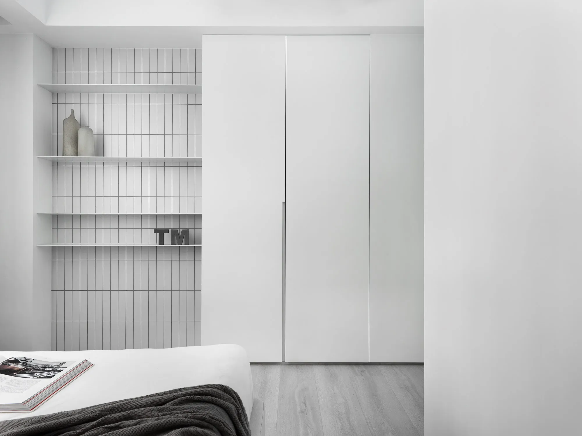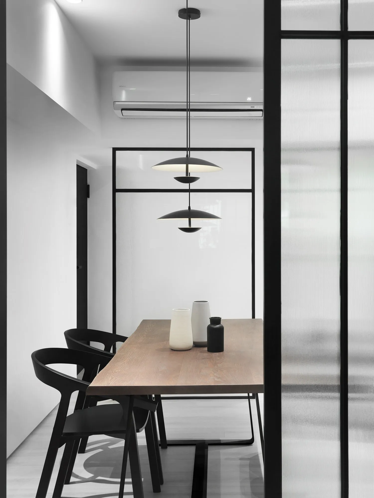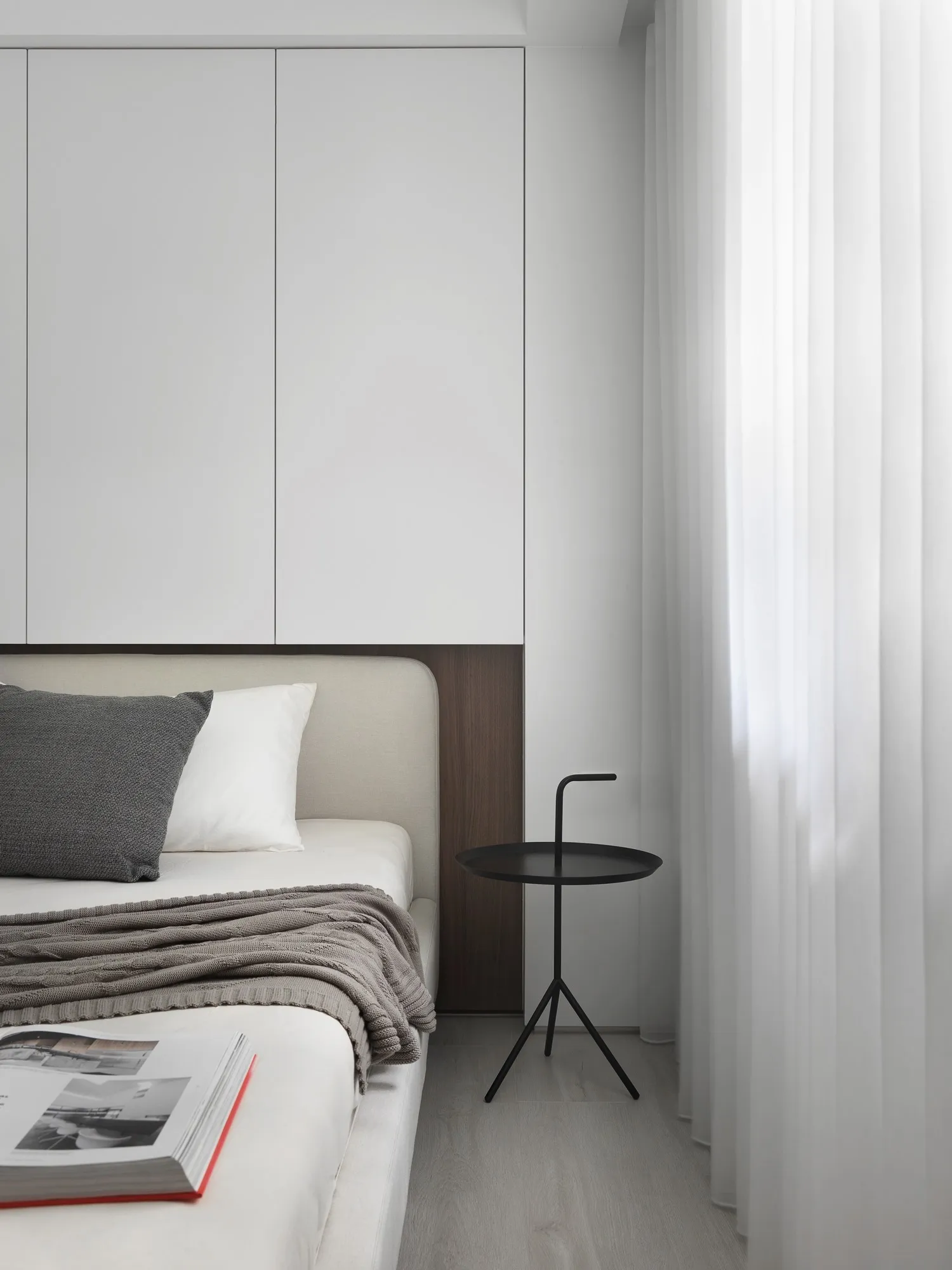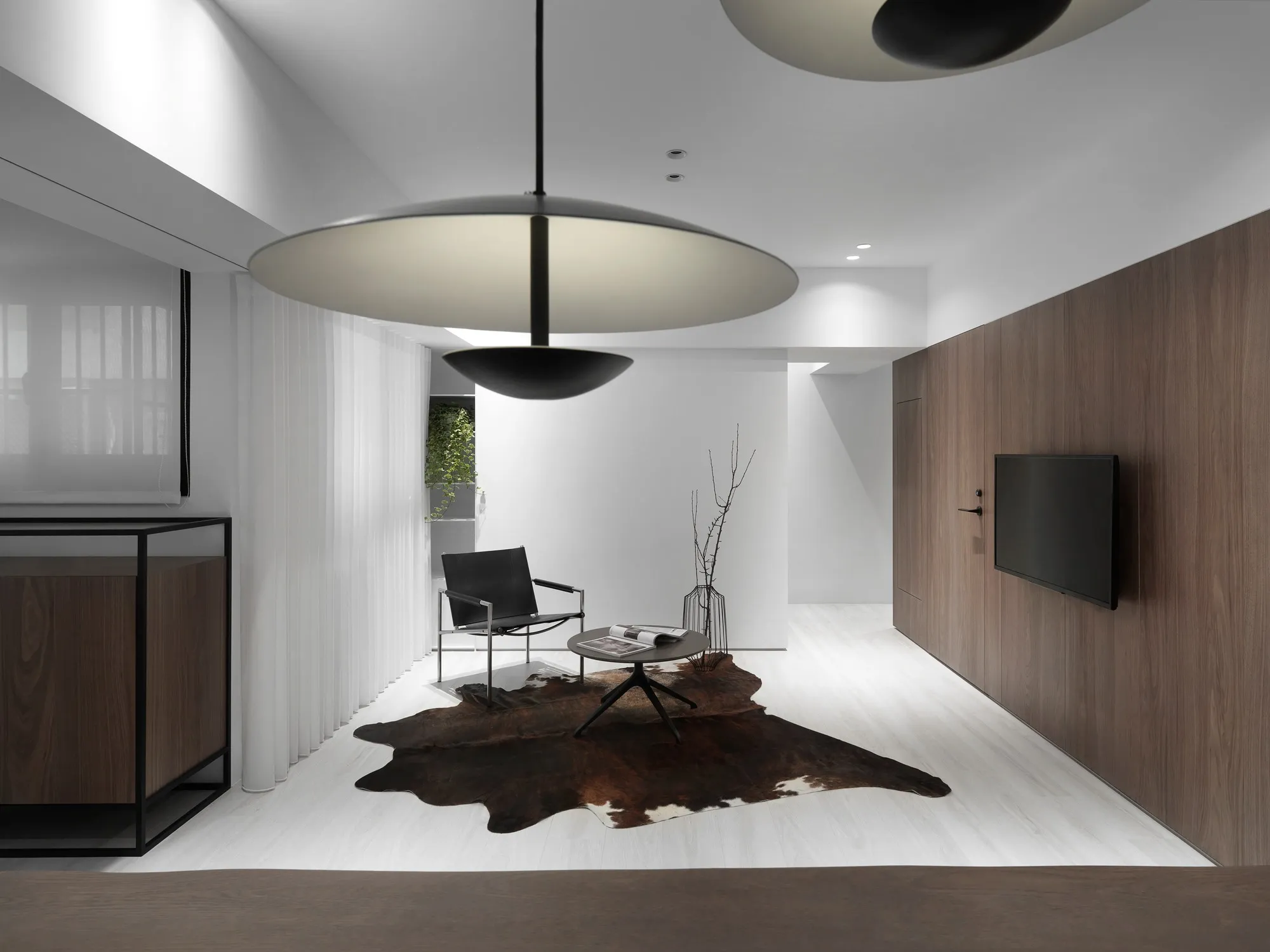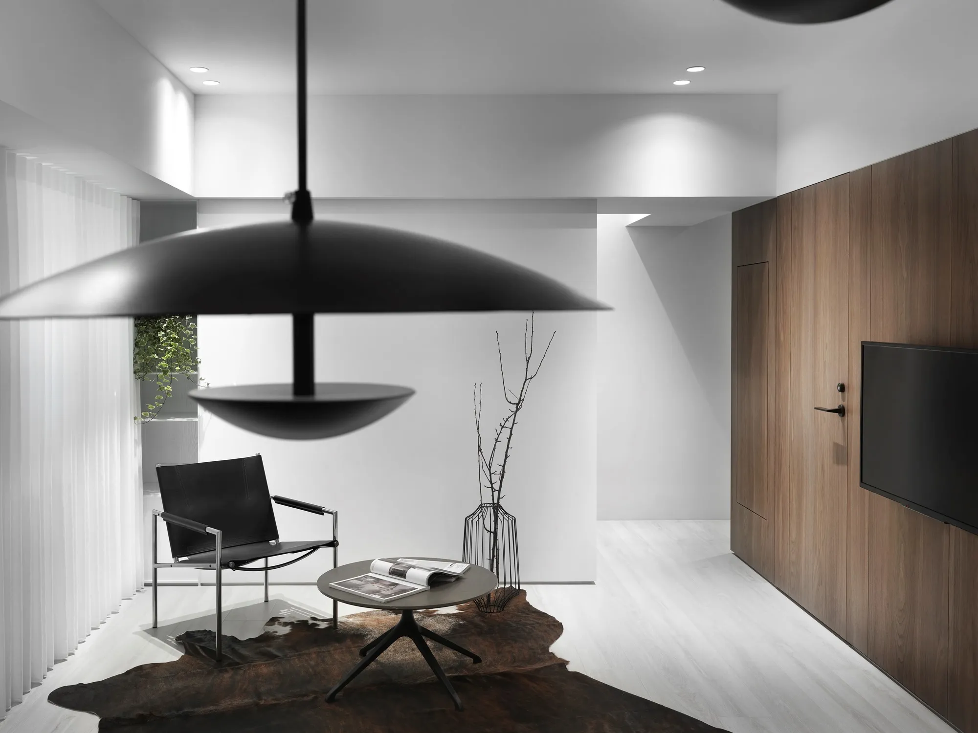 捨棄繁雜裝飾,忠於質感,以線條、切割手法呈現空間原有樣貌,適度留白以達簡約舒適的生活哲學,再透過設計簡化,將元素與素材以重複性結構,體現於每個細節,展現空間的本質。以黑白作為基底色調鋪陳全室,大方的木紋色塊及線條感的刻劃,淬鍊出一絲靜謐沉穩。光影流動的軌跡勾勒出潔白細膩的空間感受,透過窗簾延伸出牆面,增加透光效果於空間的無限想像。空間地坪鋪面採用單一材質,串聯場域之間的關係,淺色木質紋理更凸顯住家的溫馨簡潔的氛圍,輕輕幽幽一抹,營造恬靜自然的居家空間。空間分區上透過大面積木質原色材質,從廚房牆面延續至空間底部,將其清晰切割出塊狀空間量體,成為界定公私領域的軸線,此外,以俐落線條的鐵件推拉門作為視覺分割,簡約清晰地劃出空間界線,而半穿透小冰柱玻璃增添整體通透感受,使餐廳和廚房相互連結,同時與客廳有著視覺上的空間同框效果,產生彼此之間的關聯,而廚房牆壁同樣使用純白色調,與全室互相呼應,並於入口設置一處旋轉式小吧台,增加閒適休憩的小地方,展現設計細節的空間趣味;臥房均以白色為基調,簡約設計映照出原有的純淨空間,其材質與質感上的相異,疊加出純色空間的層次感受。空間機能以收納融於無形為主,試圖降低視覺干擾,留下純淨的空間表現,設計簡約俐落傳達出內斂穩重的空間思維,使居住者沉浸於悠悠漫漫的日子之中。