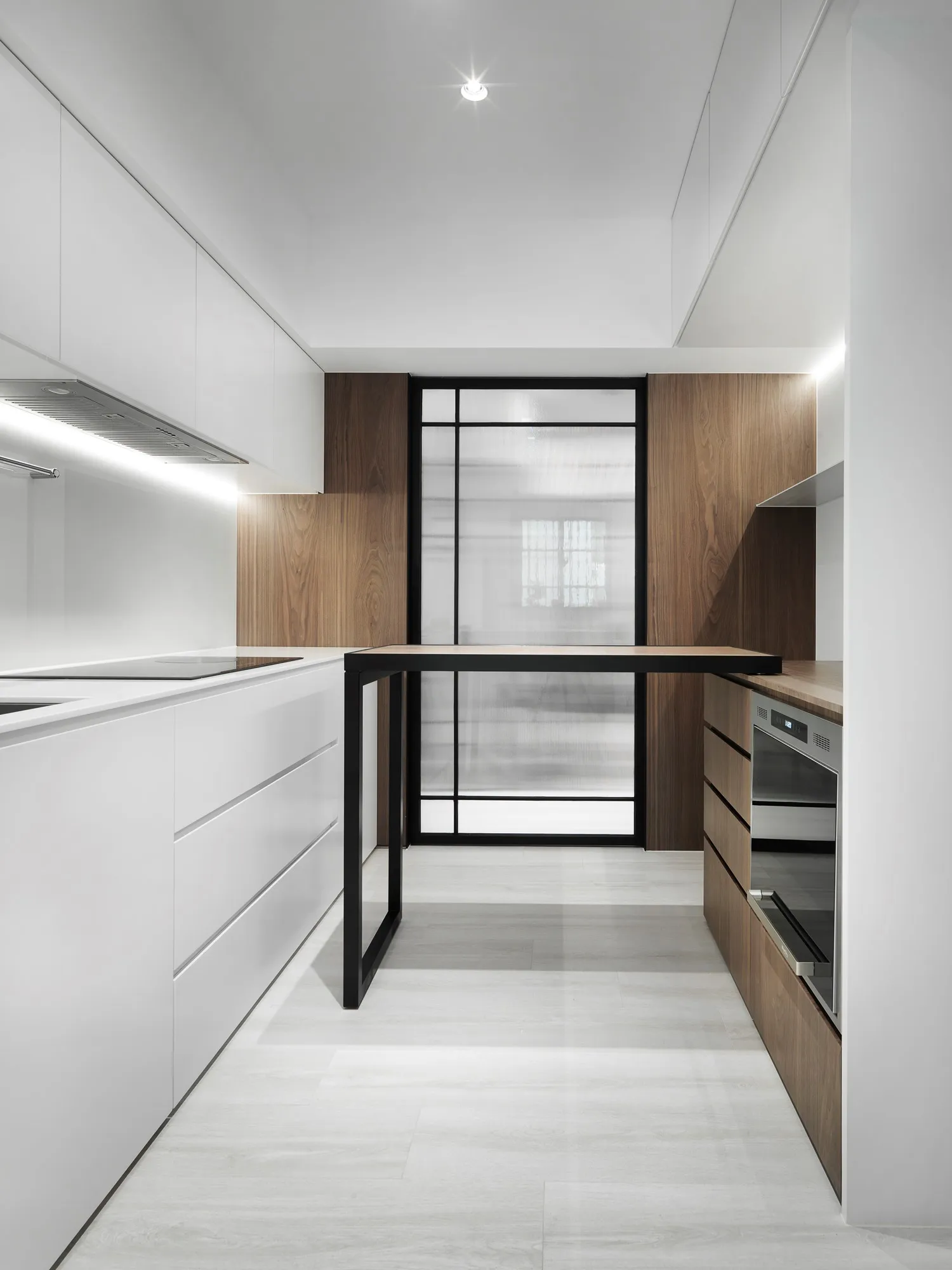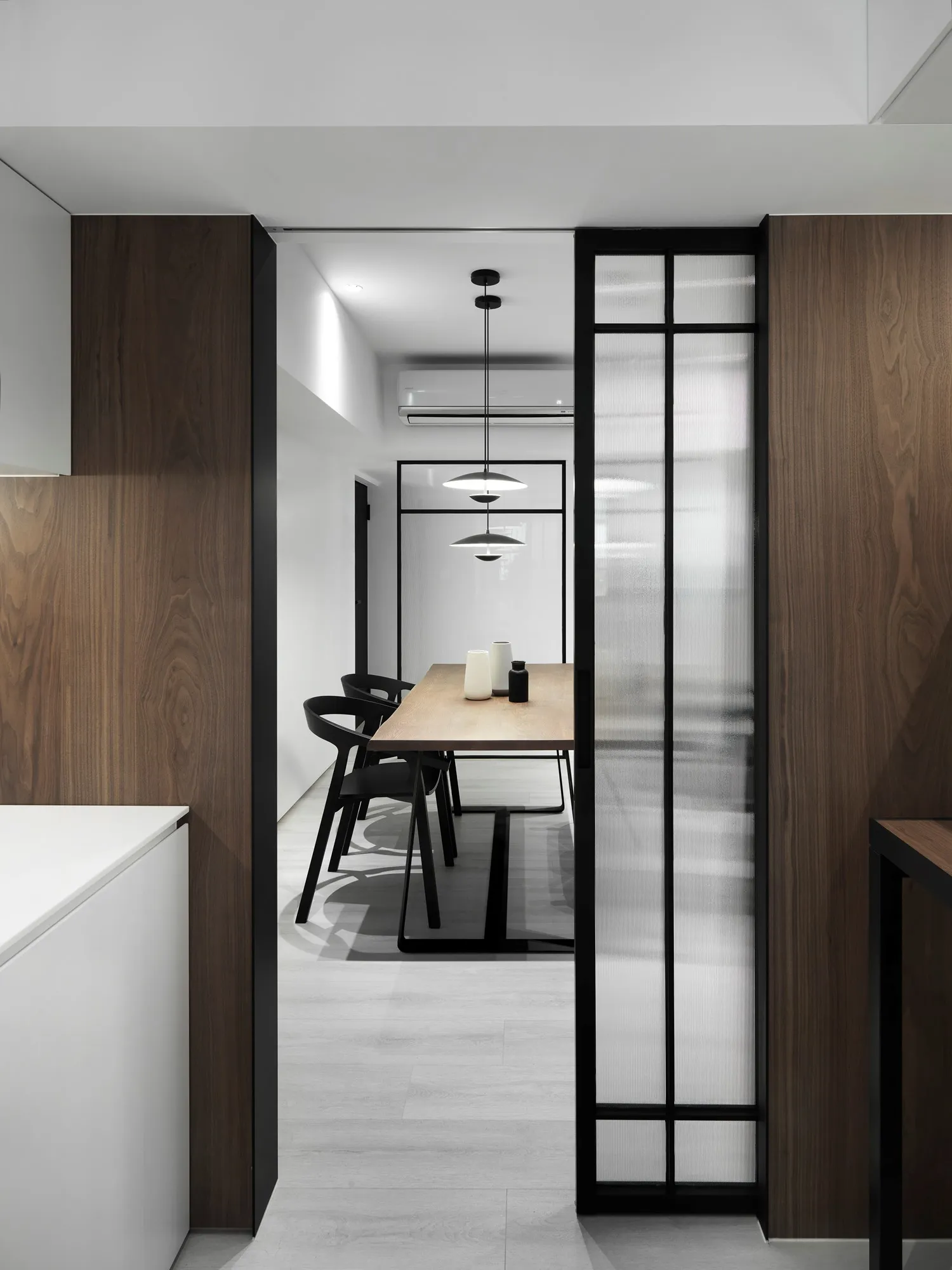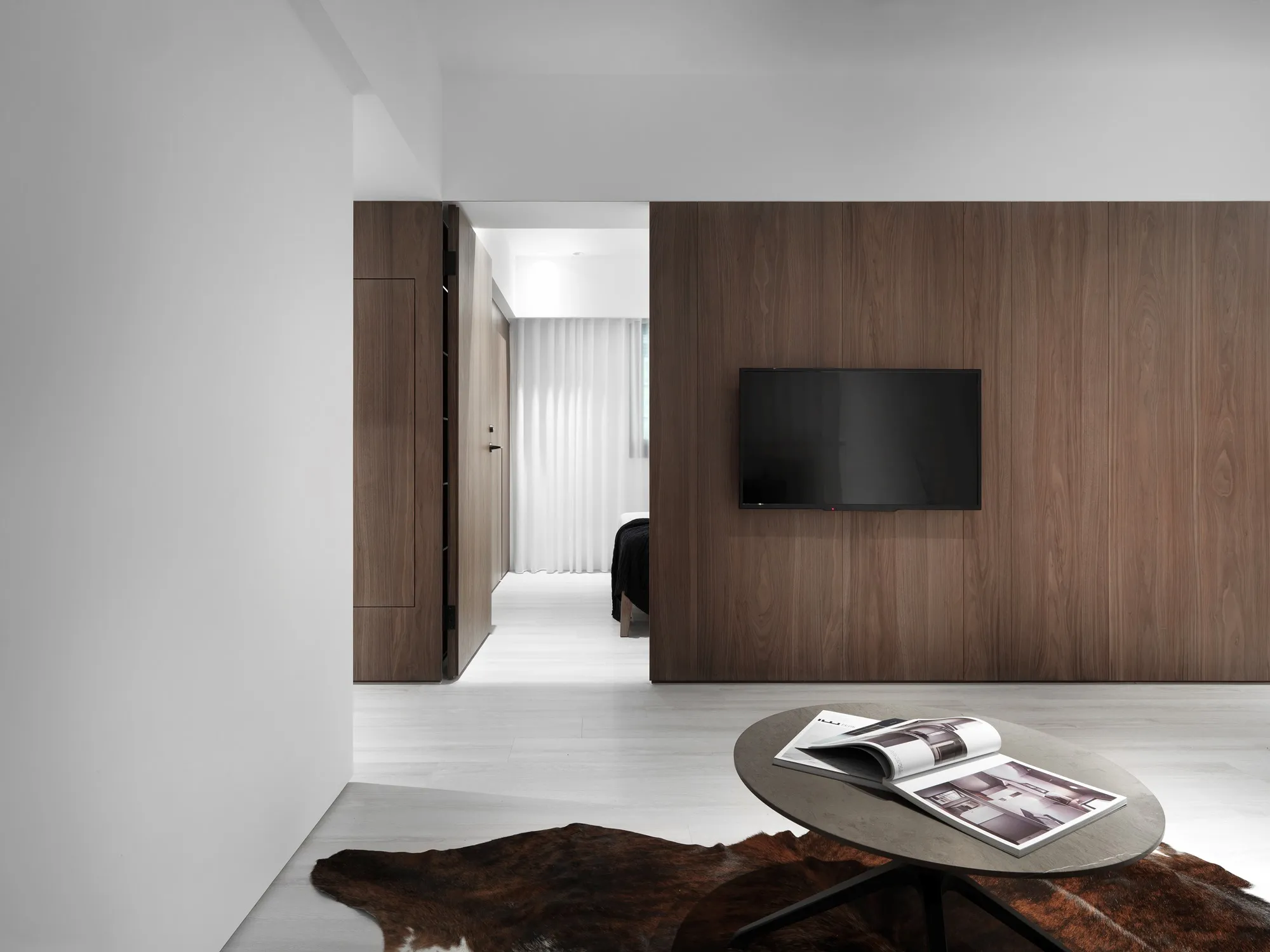 Stripping away unnecessary decoration in favor of authentic materiality, the design emphasizes pure form through the use of linear elements and precise cuts. Thoughtful use of negative space reflects a minimalist, comfortable lifestyle philosophy. Through a simplified design approach, elements and materials are expressed in a repetitive, structured rhythm—revealing the true essence of the space in every detail. The overall palette is anchored in black and white, providing a clean, timeless foundation. Bold wood textures and linear detailing infuse the environment with a sense of calm and composure. As light and shadow move across the surfaces, they define the purity and finesse of the space. Extending the curtains along the walls enhances both transparency and the illusion of spatial depth, opening up the room to limitless visual imagination. A single flooring material connects the entire space, reinforcing continuity between areas. The soft, pale wood grain enhances the home's sense of warmth and simplicity—creating a peaceful, nature-inspired living atmosphere with just a gentle touch of color. Spatial zoning is defined by large expanses of natural wood, which extend from the kitchen wall through to the far end of the space, forming block-like volumes that clearly delineate the public and private realms. Sleek sliding iron doors introduce a minimalist yet powerful visual boundary, while partially translucent fluted glass panels add lightness and connectivity—visually linking the dining area with the kitchen, and aligning them with the living room in a shared visual frame. This creates a subtle but effective spatial dialogue. The kitchen walls, finished in pure white, echo the color scheme throughout the home. A compact, rotating bar counter is cleverly integrated near the entrance—adding a relaxed, casual corner while showcasing playful design details. All bedrooms are composed with white as the base tone, highlighting the inherent purity of the original architecture. Differences in materials and textures layers within the monochrome palette, adding depth and subtlety to the space. Functionally, storage is seamlessly integrated into the architecture, reducing visual clutter and preserving the overall clarity of the design. The minimalist and refined aesthetic conveys a restrained yet grounded spatial philosophy, allowing residents to fully immerse themselves in the calm and unhurried rhythms of daily life.