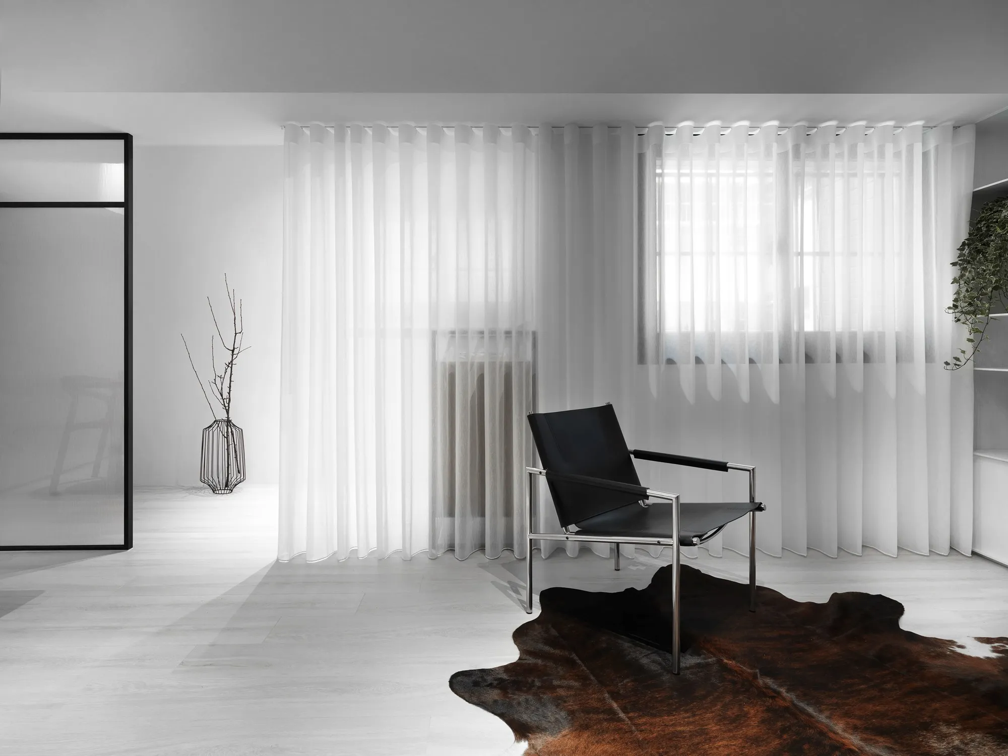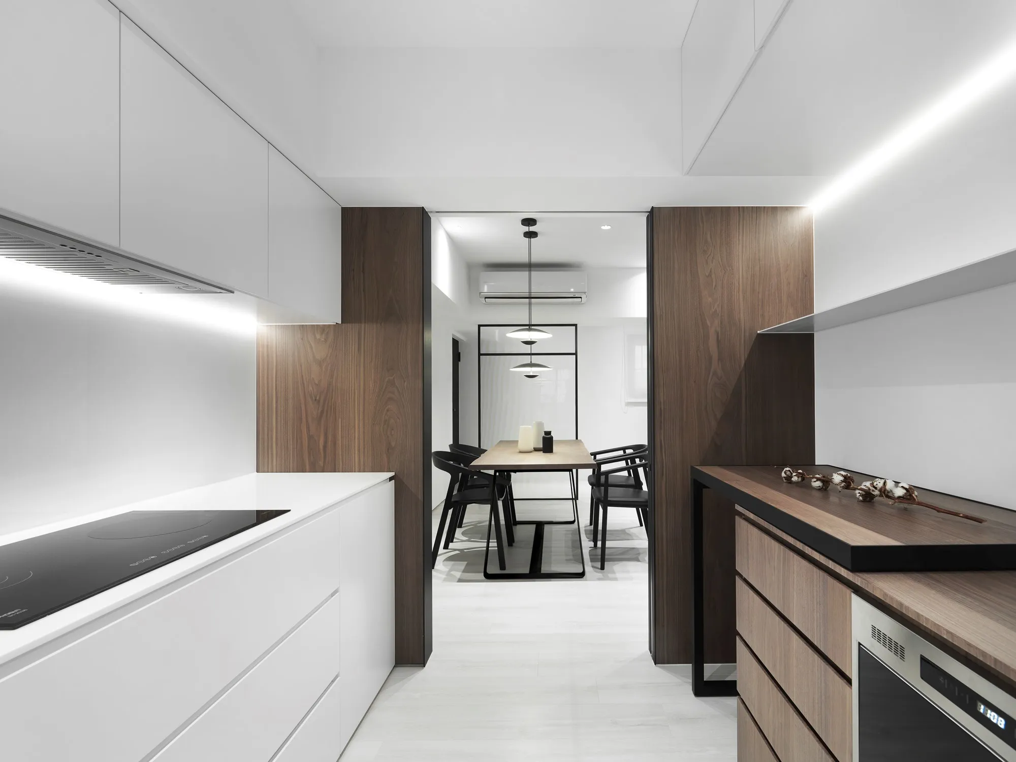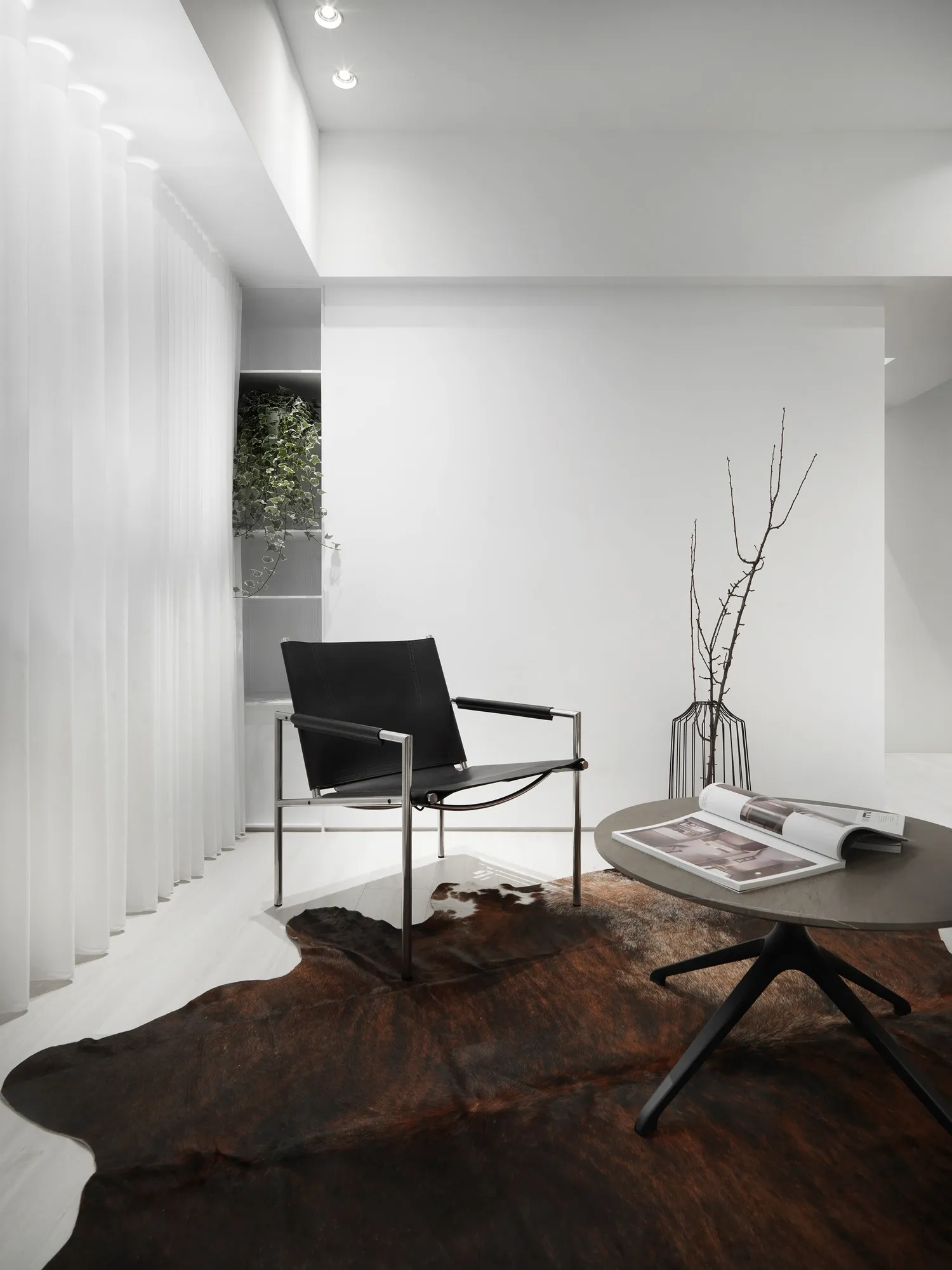 Stripping away unnecessary decoration in favor of authentic materiality, the design emphasizes pure form through the use of linear elements and precise cuts. Thoughtful use of negative space reflects a minimalist, comfortable lifestyle philosophy. Through a simplified design approach, elements and materials are expressed in a repetitive, structured rhythm—revealing the true essence of the space in every detail. The overall palette is anchored in black and white, providing a clean, timeless foundation. Bold wood textures and linear detailing infuse the environment with a sense of calm and composure. As light and shadow move across the surfaces, they define the purity and finesse of the space. Extending the curtains along the walls enhances both transparency and the illusion of spatial depth, opening up the room to limitless visual imagination. A single flooring material connects the entire space, reinforcing continuity between areas. The soft, pale wood grain enhances the home's sense of warmth and simplicity—creating a peaceful, nature-inspired living atmosphere with just a gentle touch of color. Spatial zoning is defined by large expanses of natural wood, which extend from the kitchen wall through to the far end of the space, forming block-like volumes that clearly delineate the public and private realms. Sleek sliding iron doors introduce a minimalist yet powerful visual boundary, while partially translucent fluted glass panels add lightness and connectivity—visually linking the dining area with the kitchen, and aligning them with the living room in a shared visual frame. This creates a subtle but effective spatial dialogue. The kitchen walls, finished in pure white, echo the color scheme throughout the home. A compact, rotating bar counter is cleverly integrated near the entrance—adding a relaxed, casual corner while showcasing playful design details. All bedrooms are composed with white as the base tone, highlighting the inherent purity of the original architecture. Differences in materials and textures layers within the monochrome palette, adding depth and subtlety to the space. Functionally, storage is seamlessly integrated into the architecture, reducing visual clutter and preserving the overall clarity of the design. The minimalist and refined aesthetic conveys a restrained yet grounded spatial philosophy, allowing residents to fully immerse themselves in the calm and unhurried rhythms of daily life.
