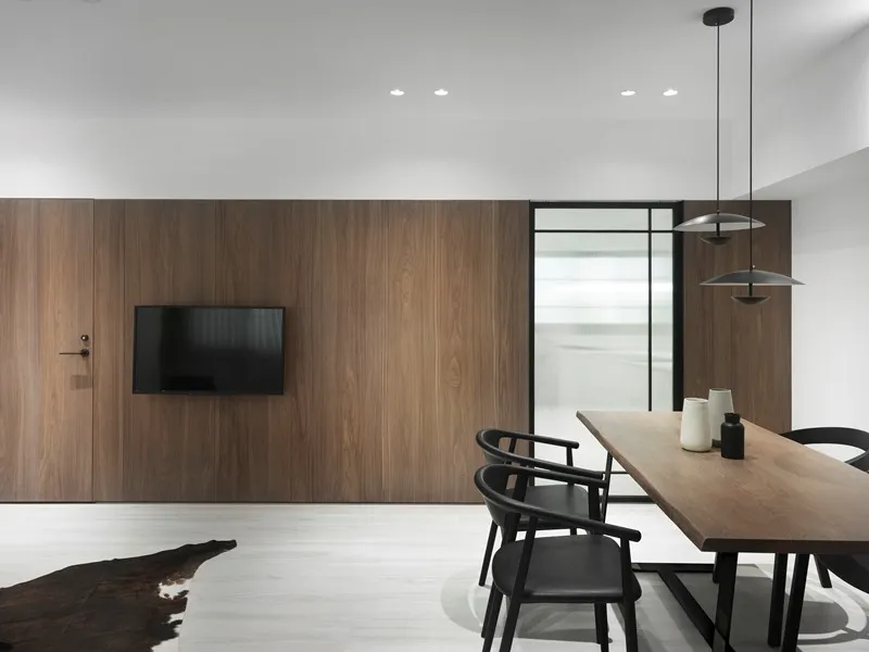 Spatial zoning is defined by large expanses of natural wood, which extend from the kitchen wall through to the far end of the space, forming block-like volumes that clearly delineate the public and private realms. Sleek sliding iron doors introduce a minimalist yet powerful visual boundary, while partially translucent fluted glass panels add lightness and connectivity—visually linking the dining area with the kitchen, and aligning them with the living room in a shared visual frame. This creates a subtle but effective spatial dialogue. The kitchen walls, finished in pure white, echo the color scheme throughout the home. A compact, rotating bar counter is cleverly integrated near the entrance—adding a relaxed, casual corner while showcasing playful design details.