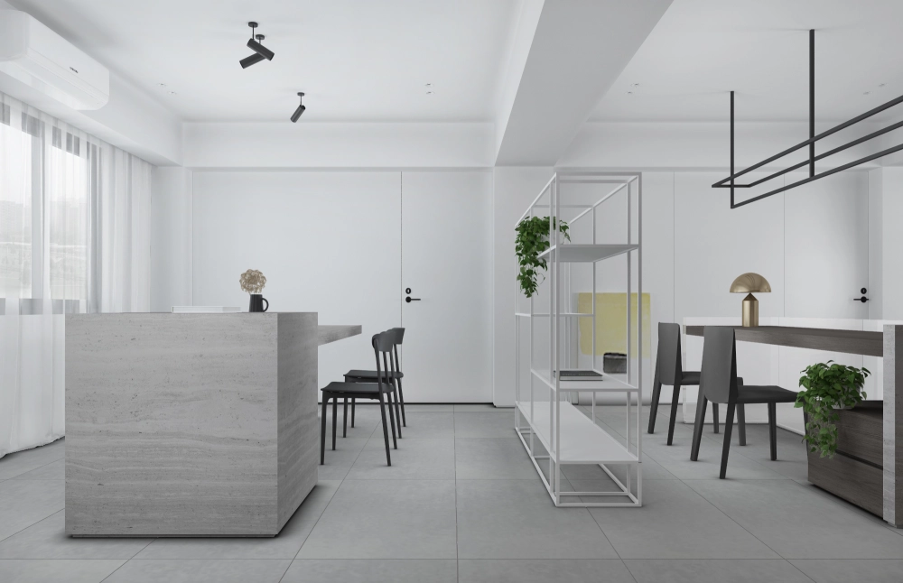 空間的畫布以低調的白灰色鋪展,公領域導引自然光線,再透過洞石元素妝點,讓不同場域元素相互激盪,沉歛的木皮質地緩緩植入愜意氛圍,黑色鐵件線條輕摹出極簡的靈魂,不衿不盈,形塑地恰到好處,讓居者獨享一室覓境。