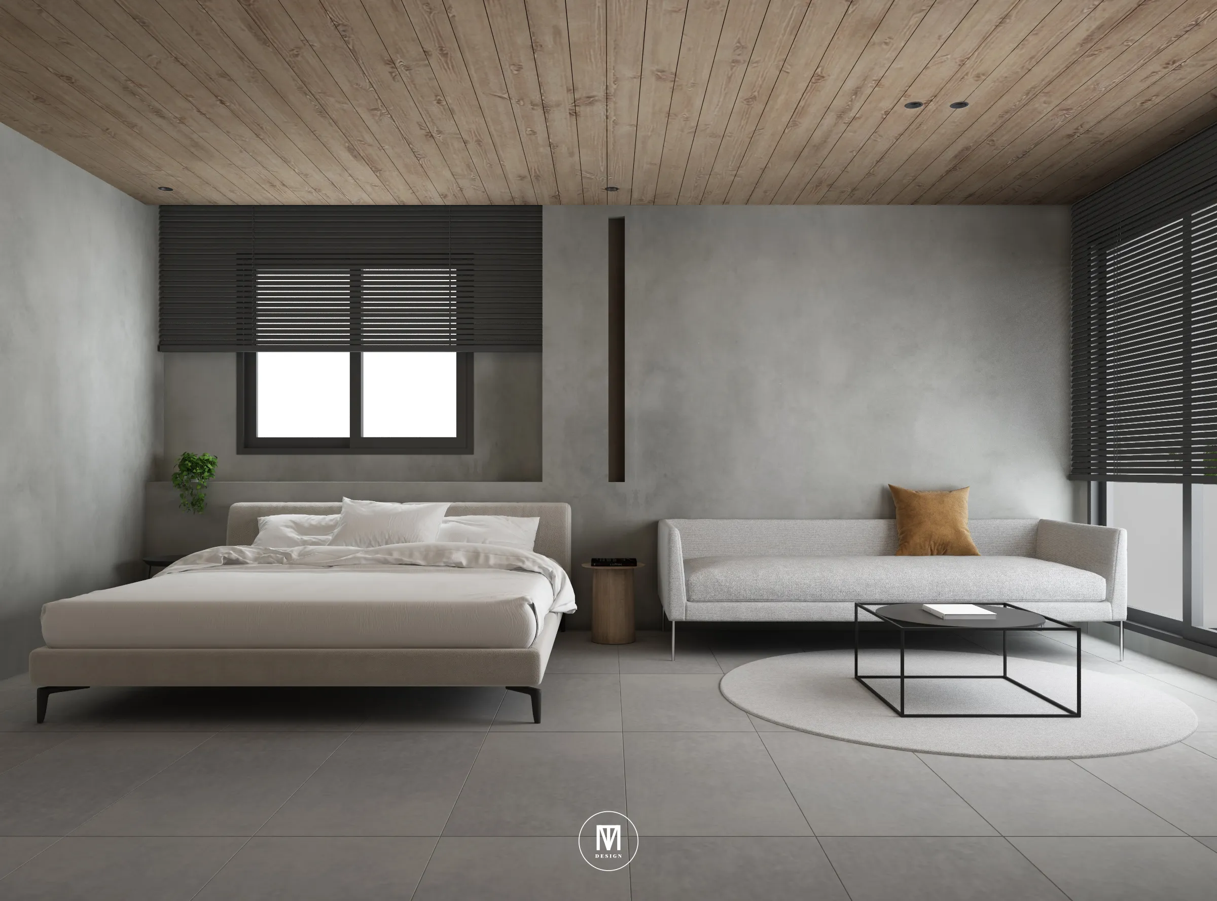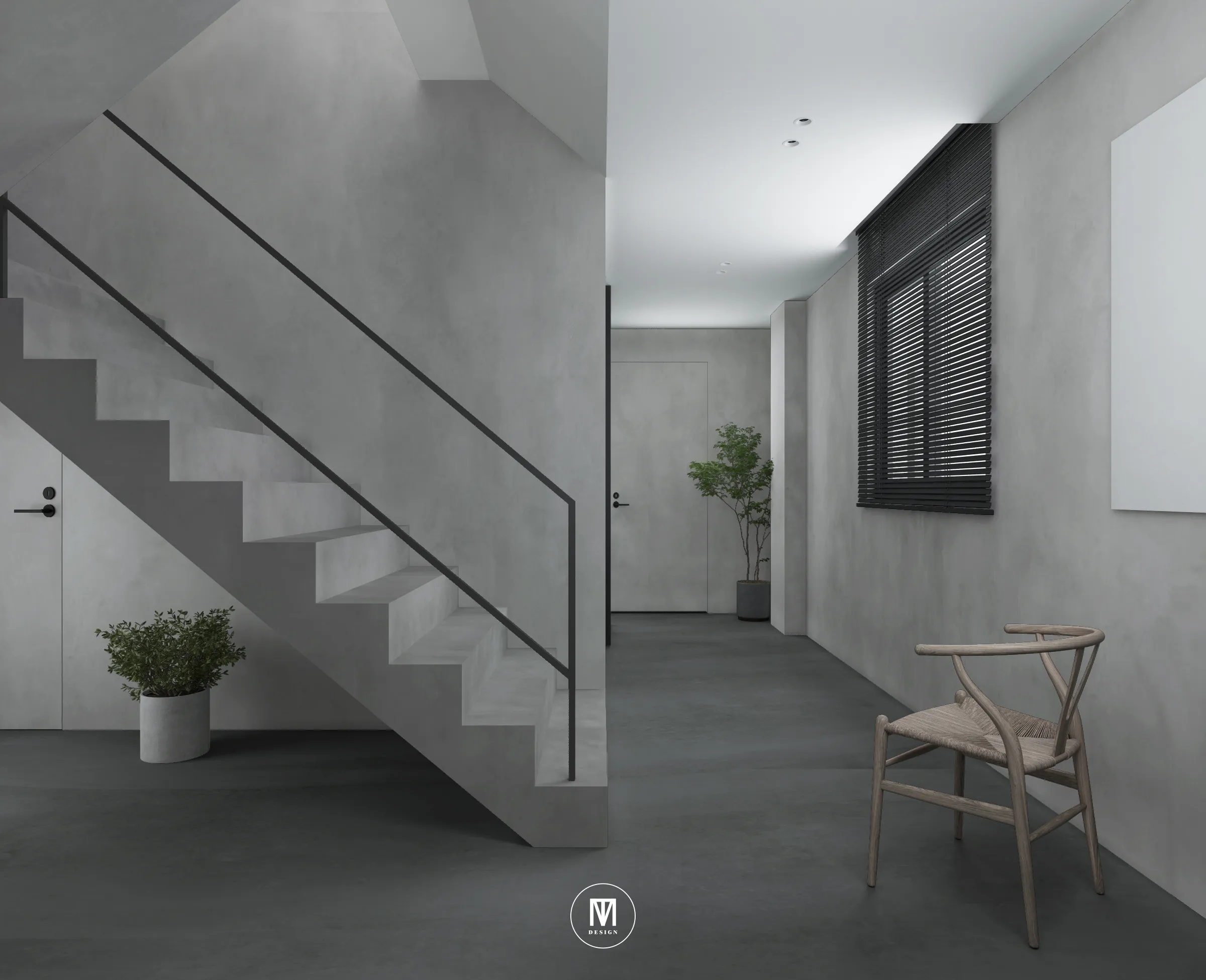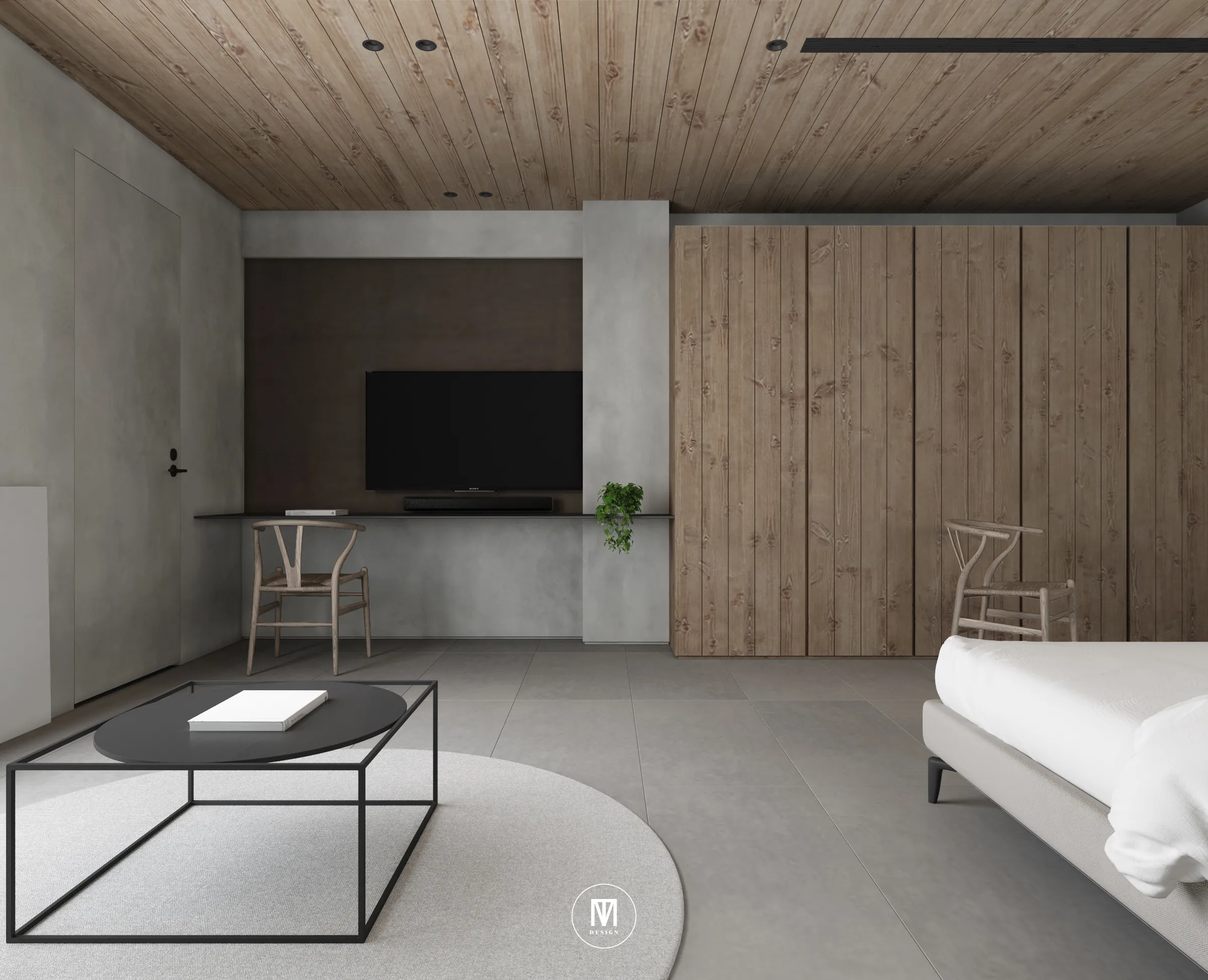 This space is grounded in a balanced palette of muted greys, offering a sense of calm and unspoken clarity. Warm wood tones weave through the composition, softening the coolness and bringing a quiet harmony that embodies a contemporary interpretation of wabi-sabi aesthetics.