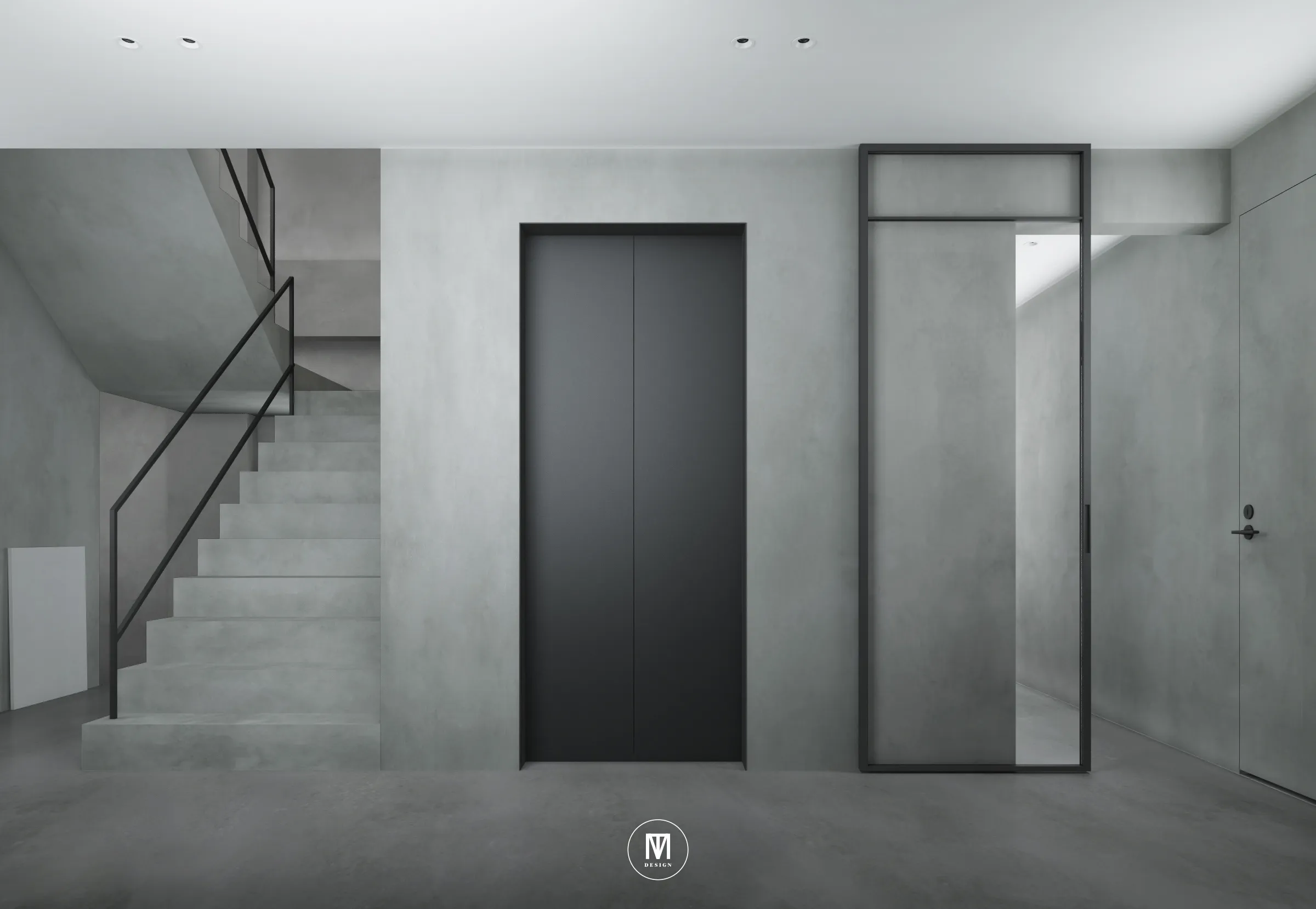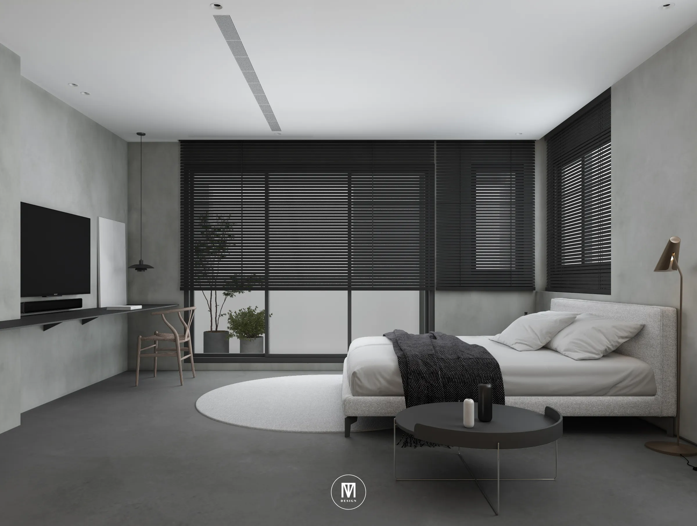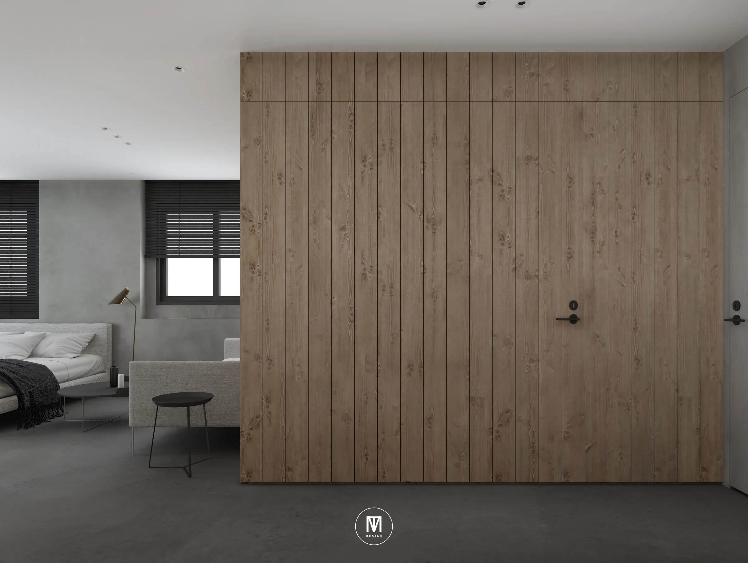 This space is grounded in a balanced palette of muted greys, offering a sense of calm and unspoken clarity. Warm wood tones weave through the composition, softening the coolness and bringing a quiet harmony that embodies a contemporary interpretation of wabi-sabi aesthetics.