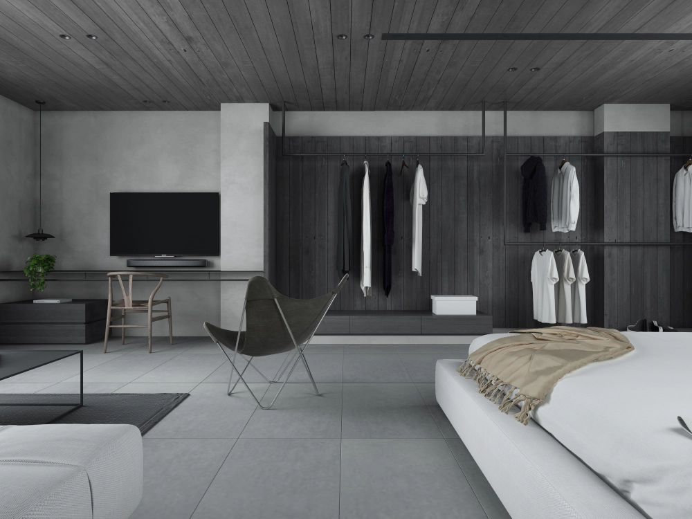 Using a palette of low-saturation hues, the space gently unfolds the rhythm and texture of everyday life. The walls are finished in a soft matte grey plaster—like a layer of warm air—diffusing light and softening the transitions between brightness and shadow. A ceiling clad in dark grey wood extends the visual horizon, lending the space a quiet strength, while the stone-textured grey flooring establishes a grand, grounded foundation that slows the pace of life, step by step. Generous negative space is intentionally preserved, allowing furniture and objects to take center stage rather than merely decorate. A white fabric sofa sits like a beam of clarity within the grayscale environment, embracing both body and spirit. Sleek black metal lines connect lighting, wardrobes, and furniture in harmonious proportions, constructing a structure that balances both order and breathability. The wardrobe is left open, blending dark wood panels with exposed ironwork—serving as both storage and display. Black Venetian blinds soften the natural light, allowing it to filter in with a refined, layered quality that silently regulates the mood and temperature of the room. Design, at its core, is not about layering styles, but about creating a space where every inch can hold your daily rituals and resonate with your pace. A place where vision and emotion find balance, and where people and space evolve together.