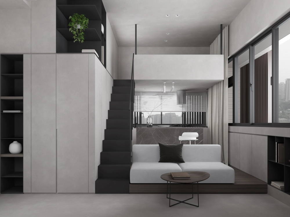 灰調圍塑靜謐場域,打造舒心的居家氛圍,一切歸於自然質樸樣貌,去繁從簡,運用夾層拓展領域,讓生活兼具機能與美感,小坪數也能擁有足夠的空間,圓滿了日常時光。