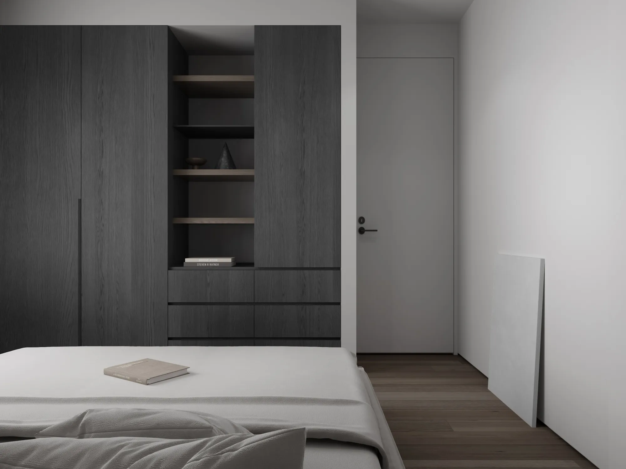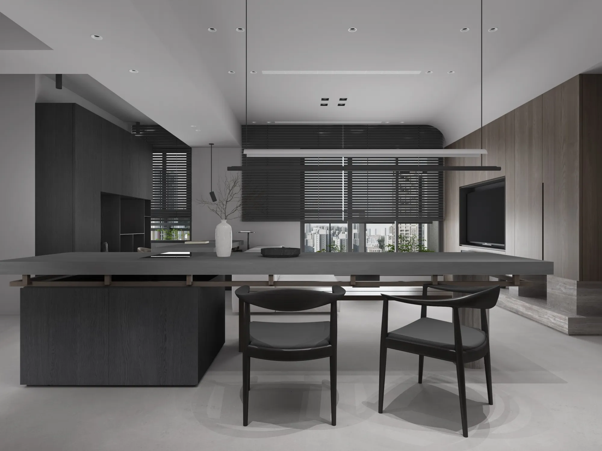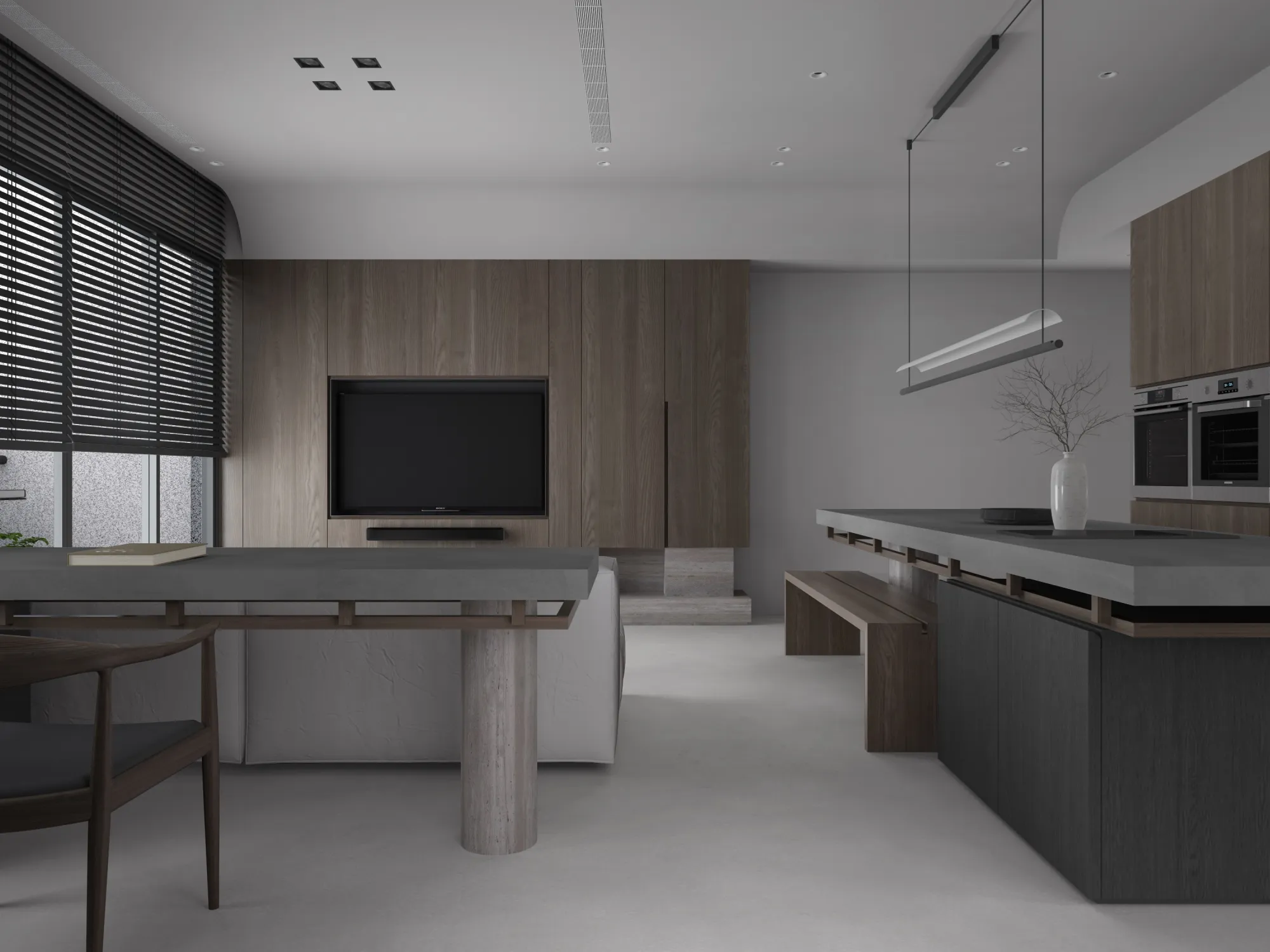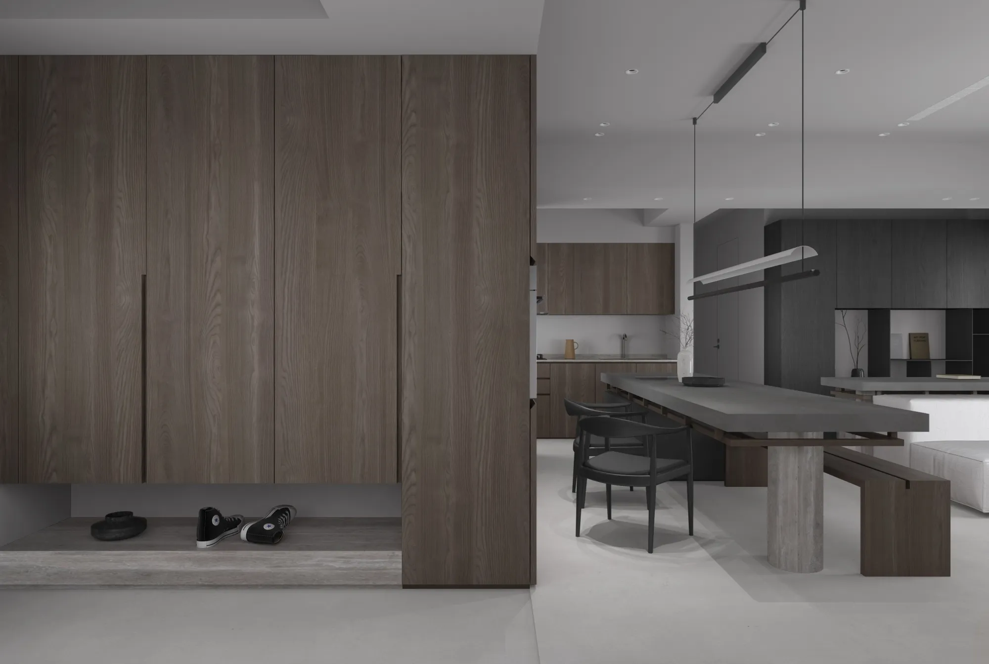 深色的木質元素及線條感的刻劃,淬鍊出一絲靜謐沉穩,光影流動的軌跡勾勒出細膩繁複的空間感受,透過窗簾延伸出牆面,增加透光效果於空間的無限想像。時光靜靜流淌,陽光下漫舞著寂靜的音符,褪去工作的生活倦態,將幸福印記收藏,享受家所帶來的溫馨與包容。