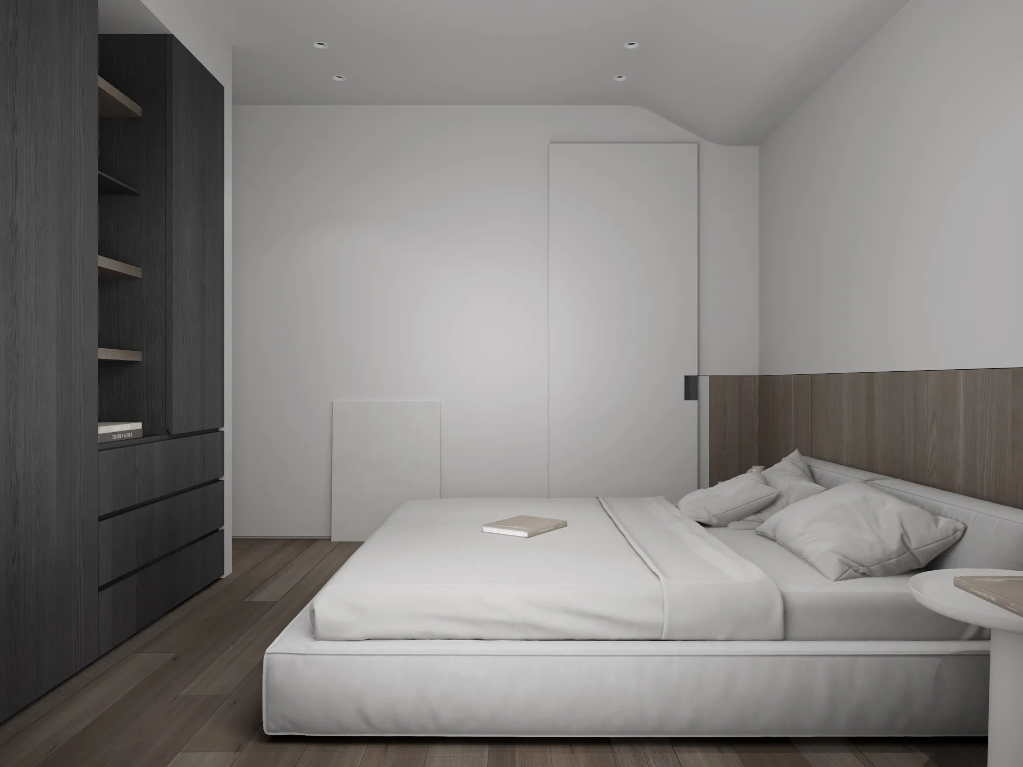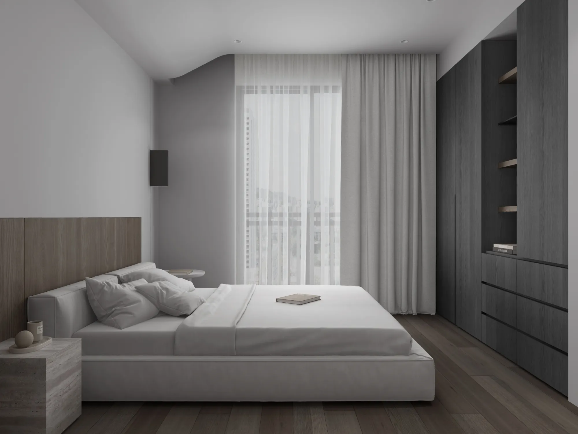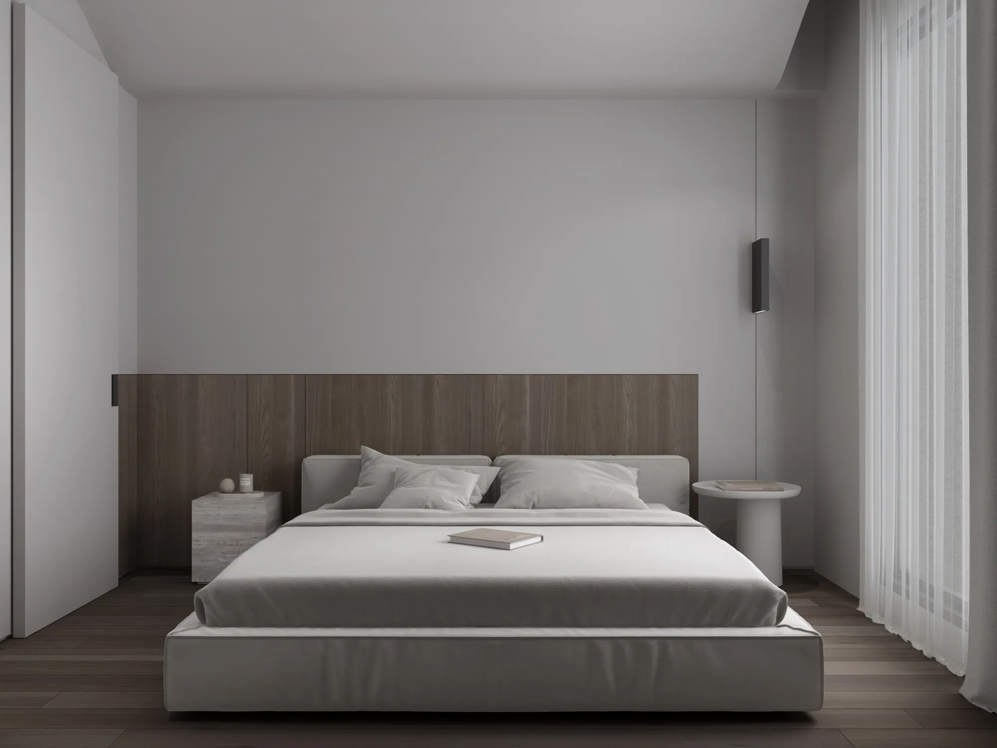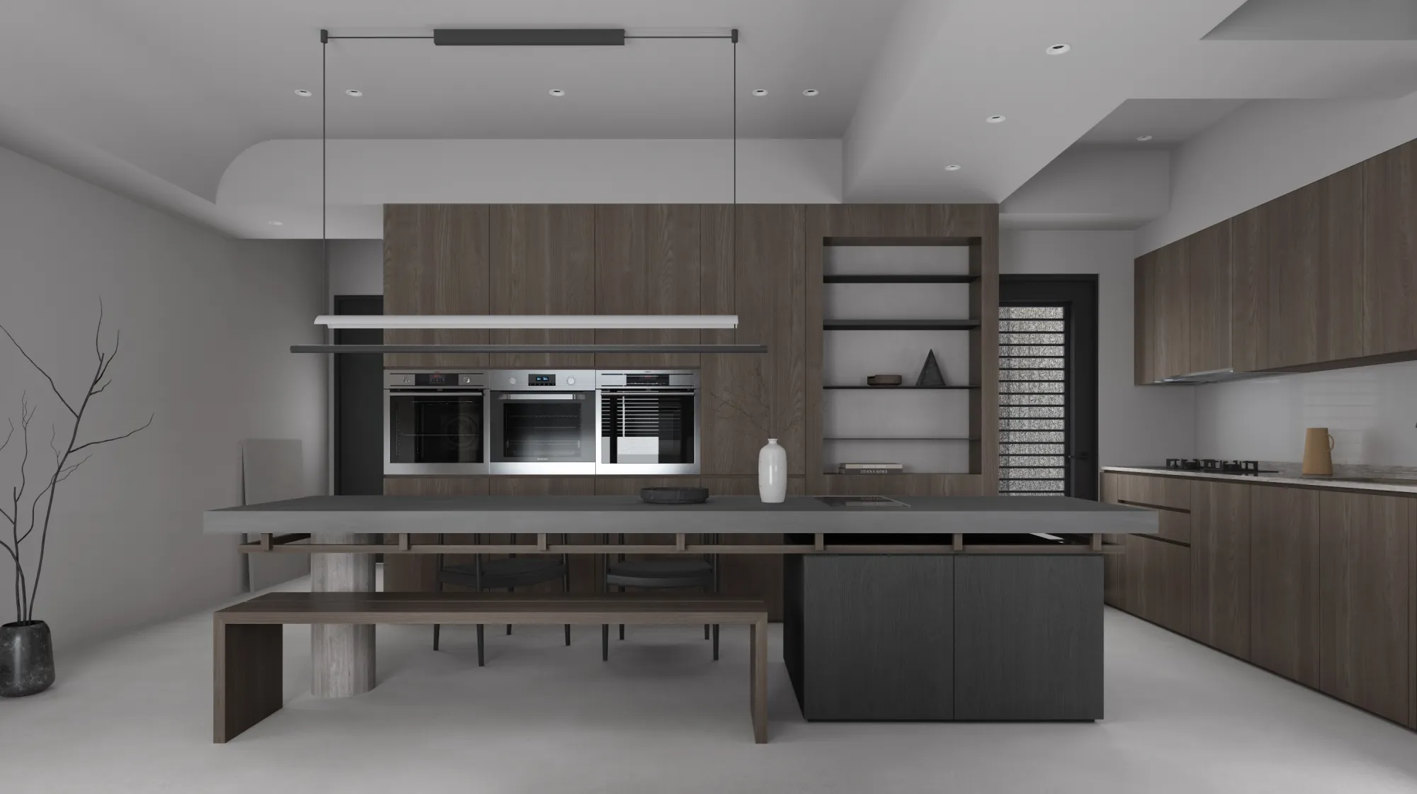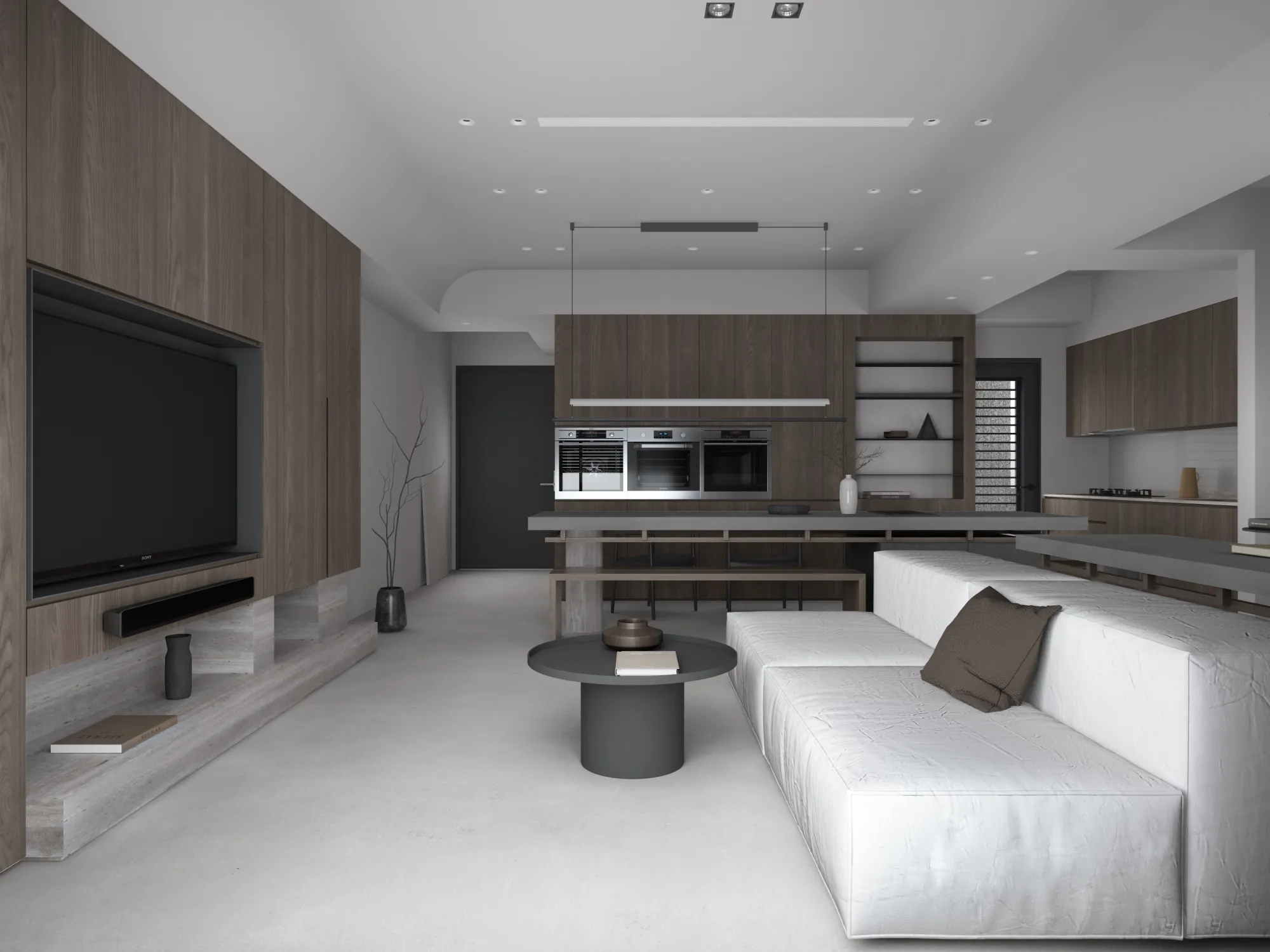 深色的木質元素及線條感的刻劃,淬鍊出一絲靜謐沉穩,光影流動的軌跡勾勒出細膩繁複的空間感受,透過窗簾延伸出牆面,增加透光效果於空間的無限想像。時光靜靜流淌,陽光下漫舞著寂靜的音符,褪去工作的生活倦態,將幸福印記收藏,享受家所帶來的溫馨與包容。