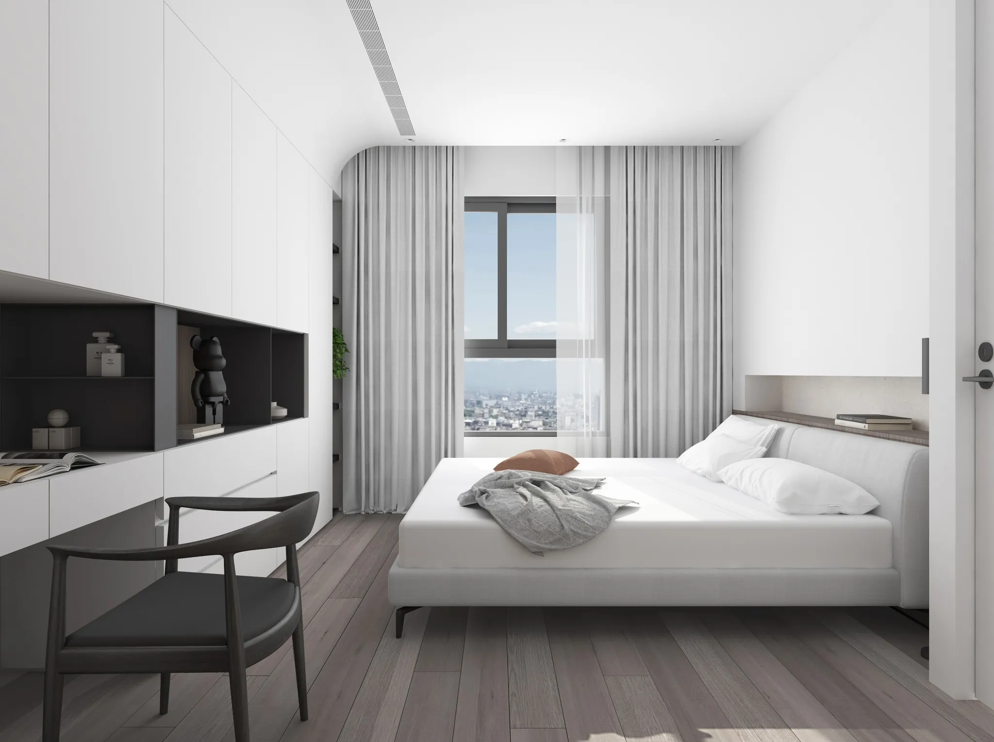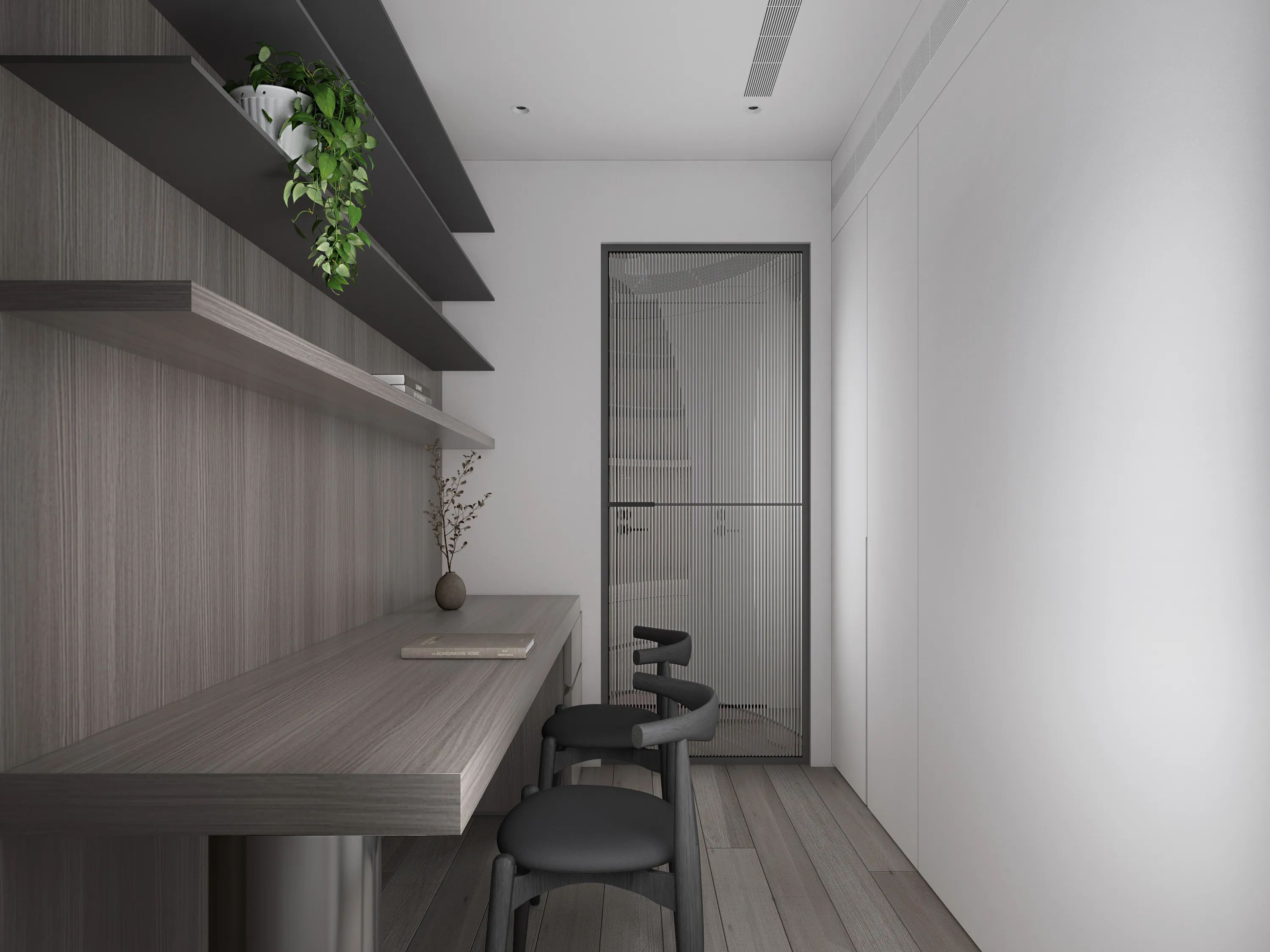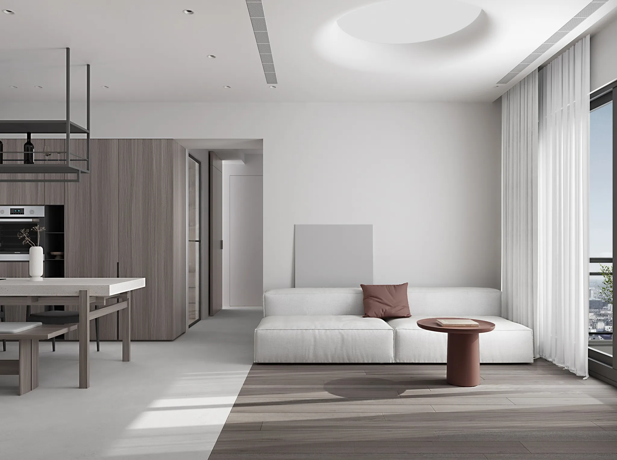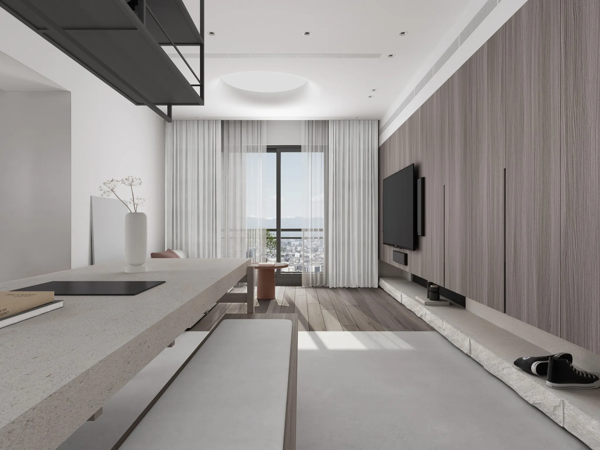 以純白色系為整體空間定調,圓弧天花如同為天光預留灑下的出口,將空間暈染出均質的漫射光。木質元素的地面呈現空間溫潤的調性,猶如承接了天光的照拂,回應著恰如其分的靜謐氛圍,光影也在材質的表情中舞動著時間的姿態。同為木質元素的量體,為空間的立面軸向建構出適切的比例分割,將材料的均衡純粹,錯落有致的佈局在空間中,界定場域的同時,也為白色的簡約刻畫出溫潤的樣貌。