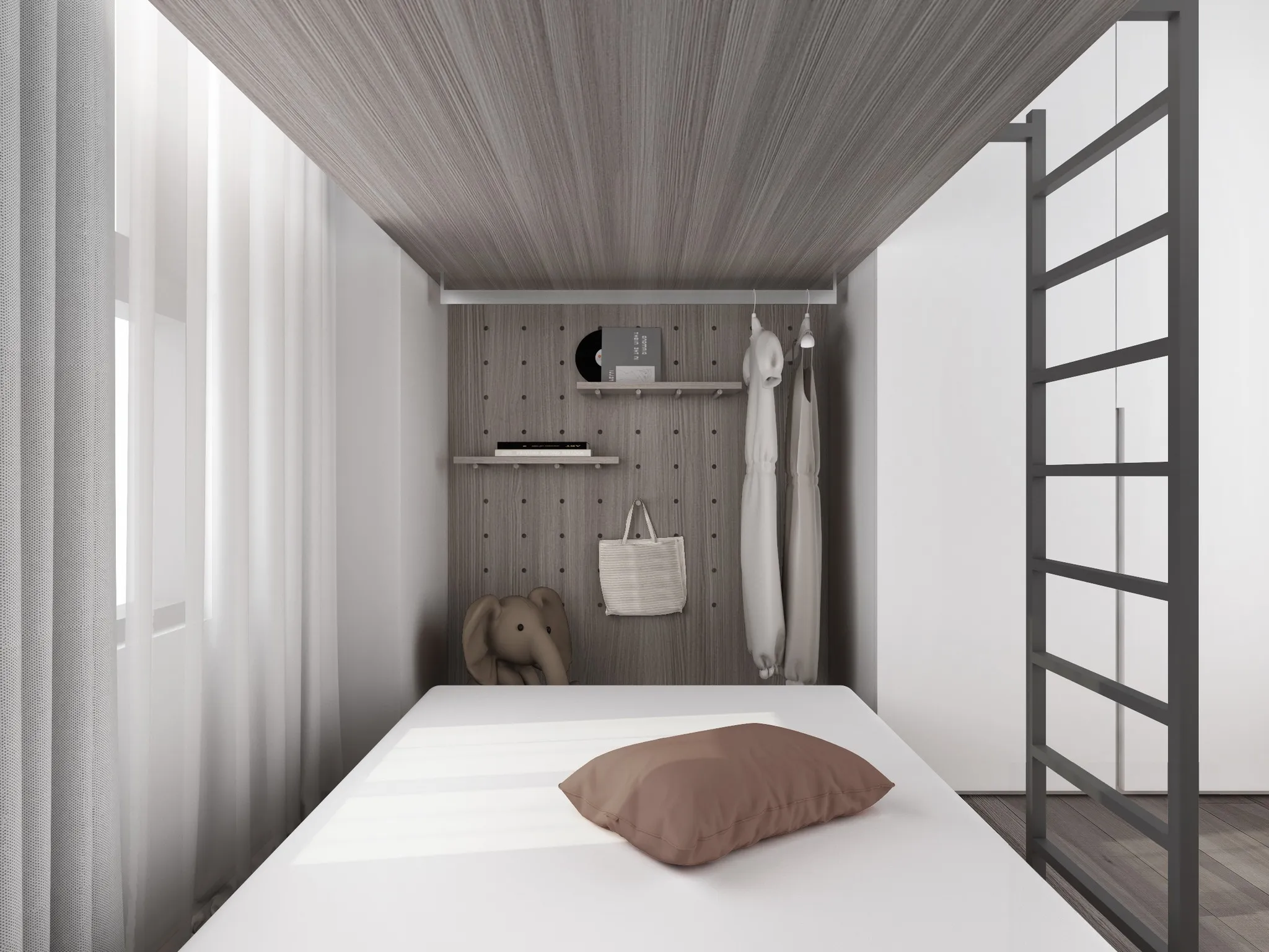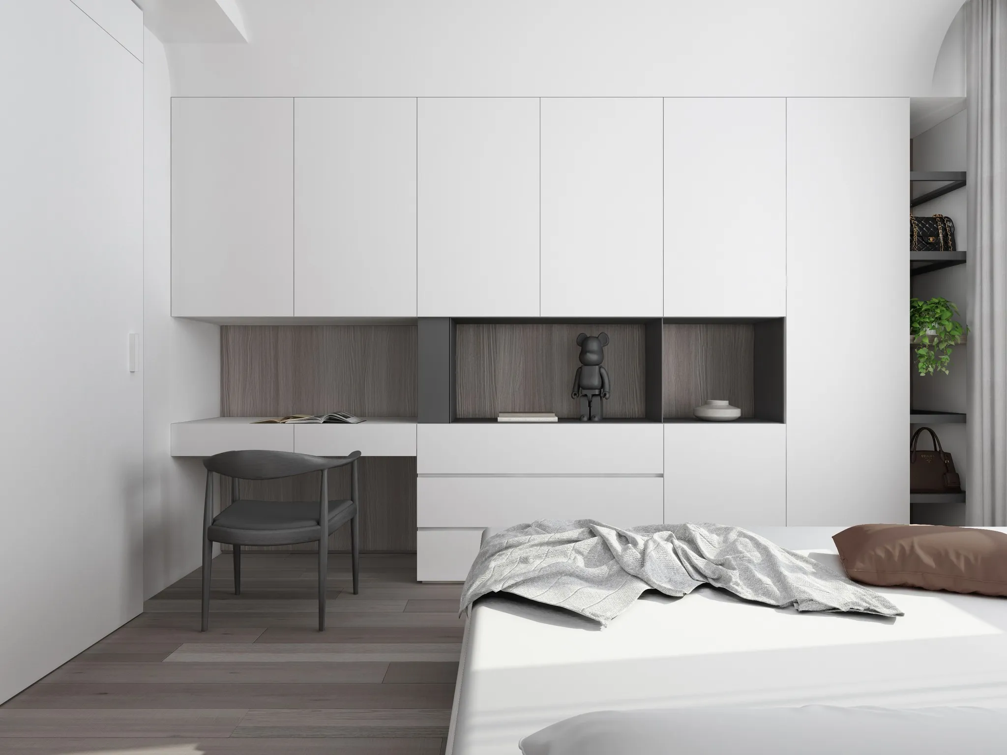 The overall space is based on pure white, and the curved ceiling is like an air outlet reserved for a skylight, integrating the space with uniform diffused light. The wooden floor presents a warm spatial tone, as if receiving the light of the sky, echoing the appropriate quiet atmosphere, and the light and shadow also dance with the gesture of time in the expression of the material. The volume of the same wooden element creates an appropriate proportional division for the axial direction of the space facade. The balanced and pure arrangement of materials in the space not only defines the field, but also creates a warm appearance for the space. White simplicity.