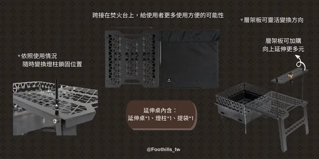 一組焚火台最多可搭配四組延伸桌,形成十字型的配置,進一步滿足不同場合和人數的需求,增加了圍爐邊桌的擺設彈性,讓您與朋友或家人共度美好的戶外時光,不僅簡約實用,更是提升露營體驗多元化的戶外休閒工具🧺