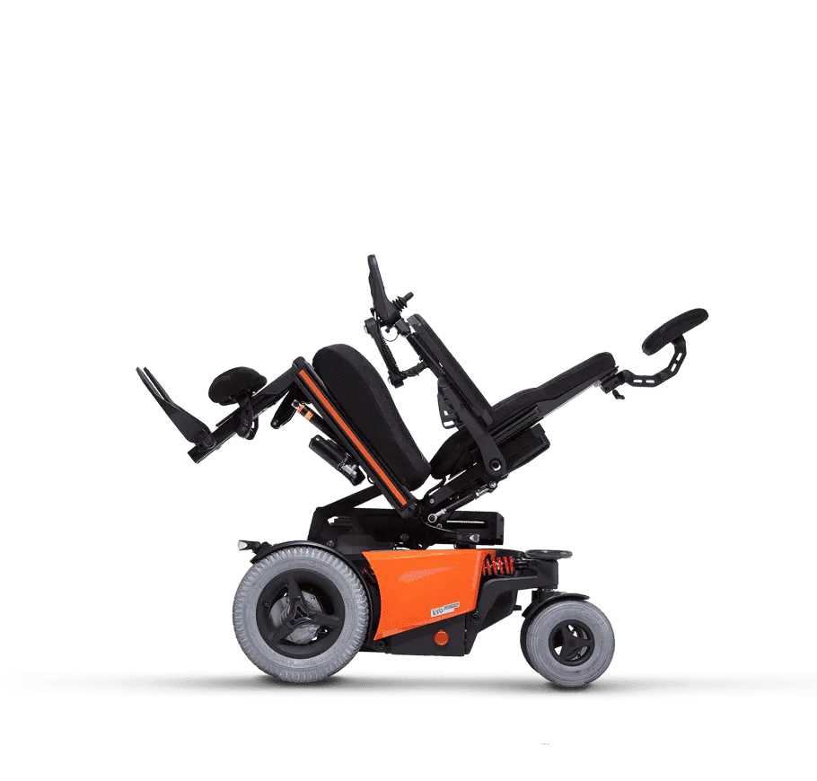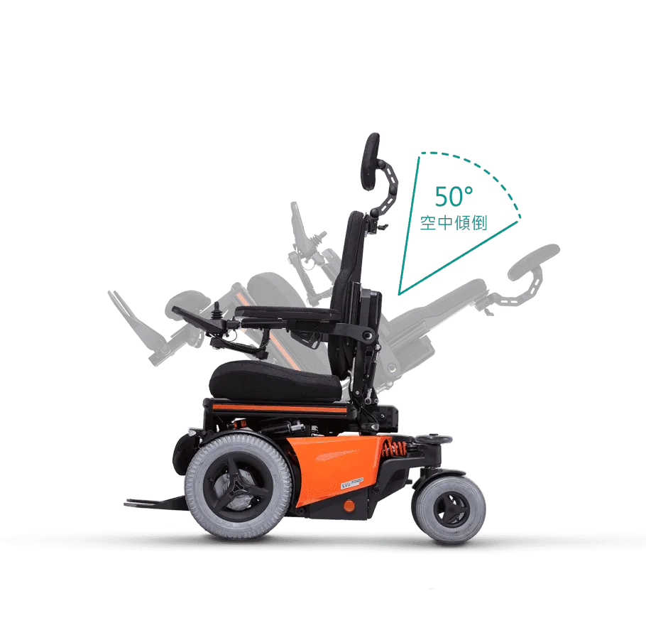 當輪椅在非行進狀態時,空中傾倒角度最大可達50度,一鍵減壓、便利輕鬆。傾倒功能亦能提供使用者行駛下坡路段時座墊角度的補償(下坡坡度≦8度),提供更穩定的坐姿與安全駕駛。電動升降座椅