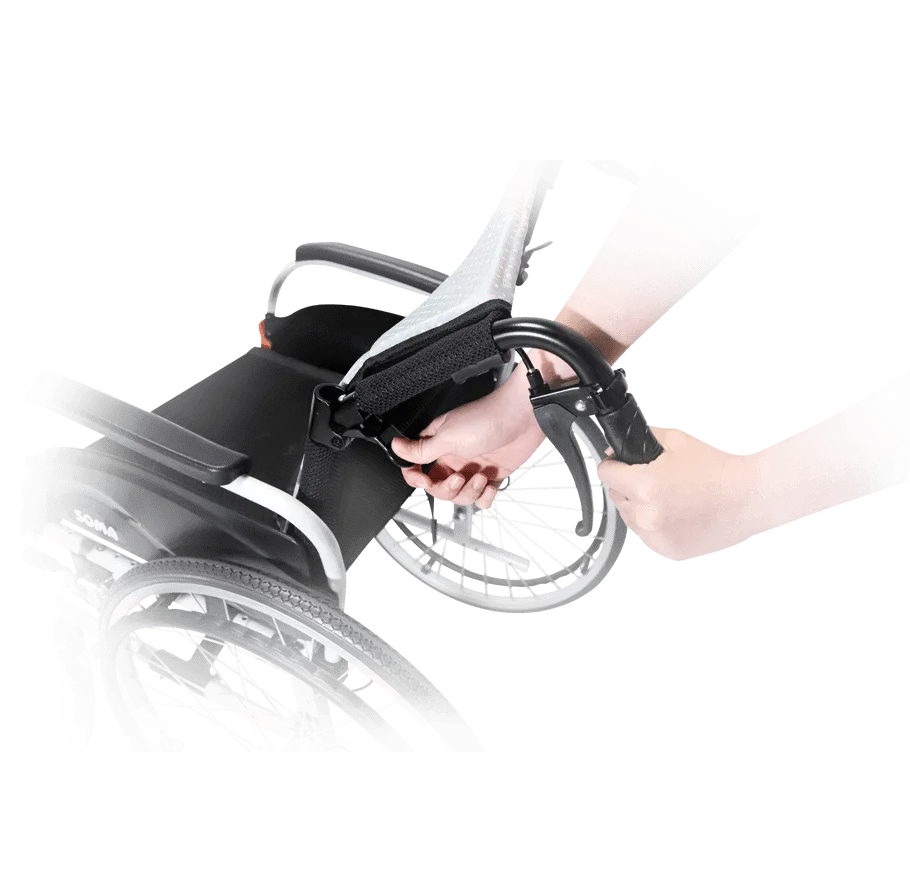 一台價格實惠的移位型輪椅,扶手可後掀、腳靠可以撥開並拆卸,
