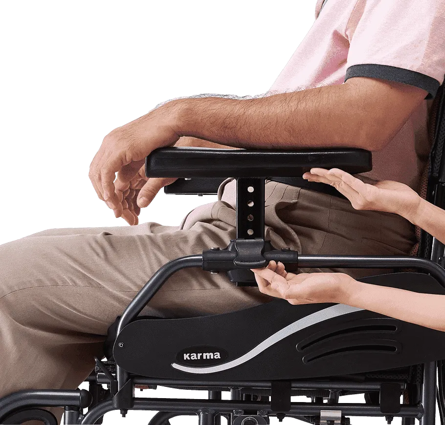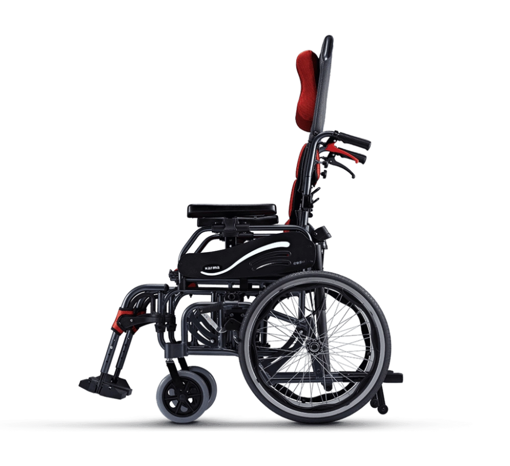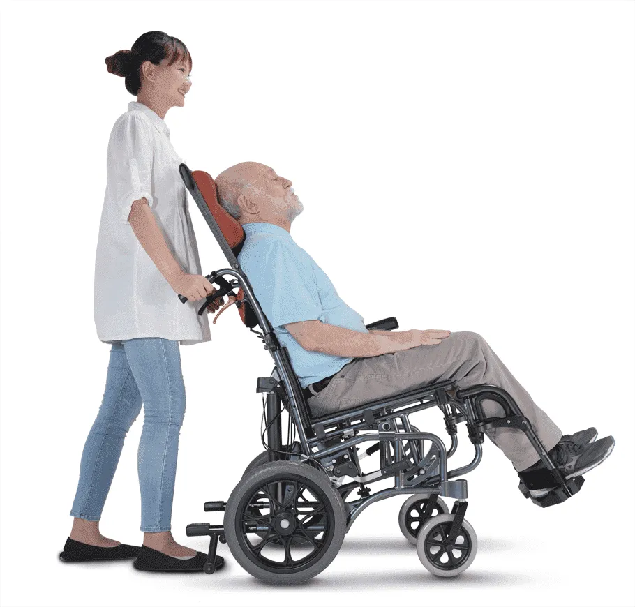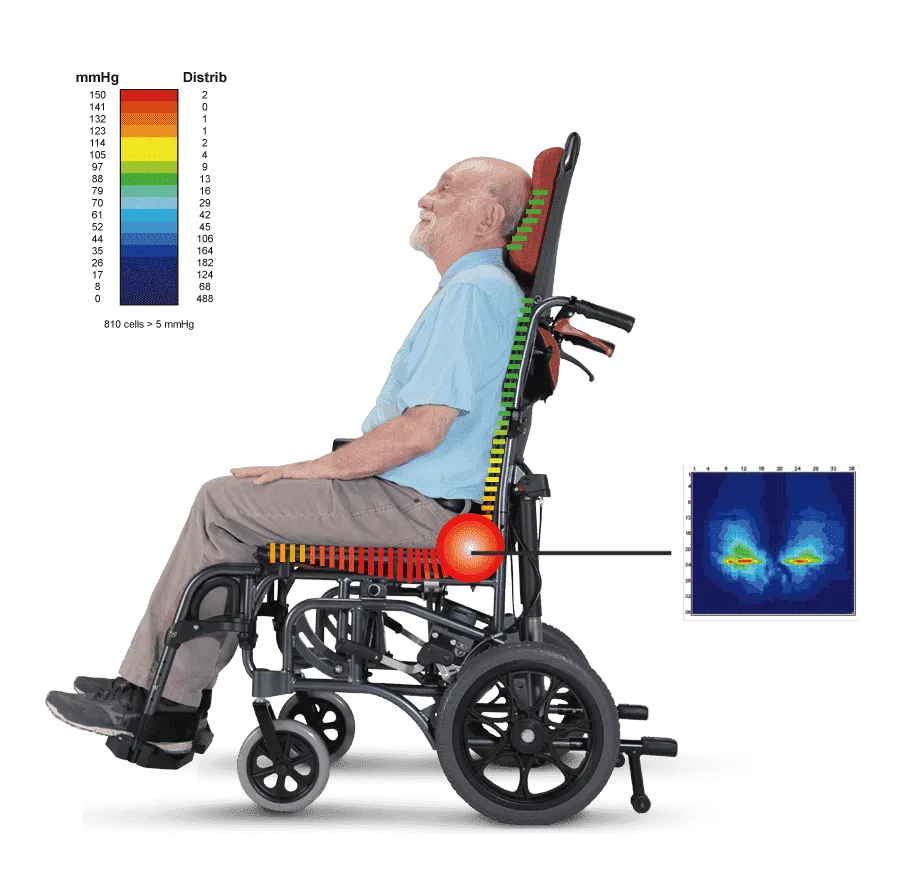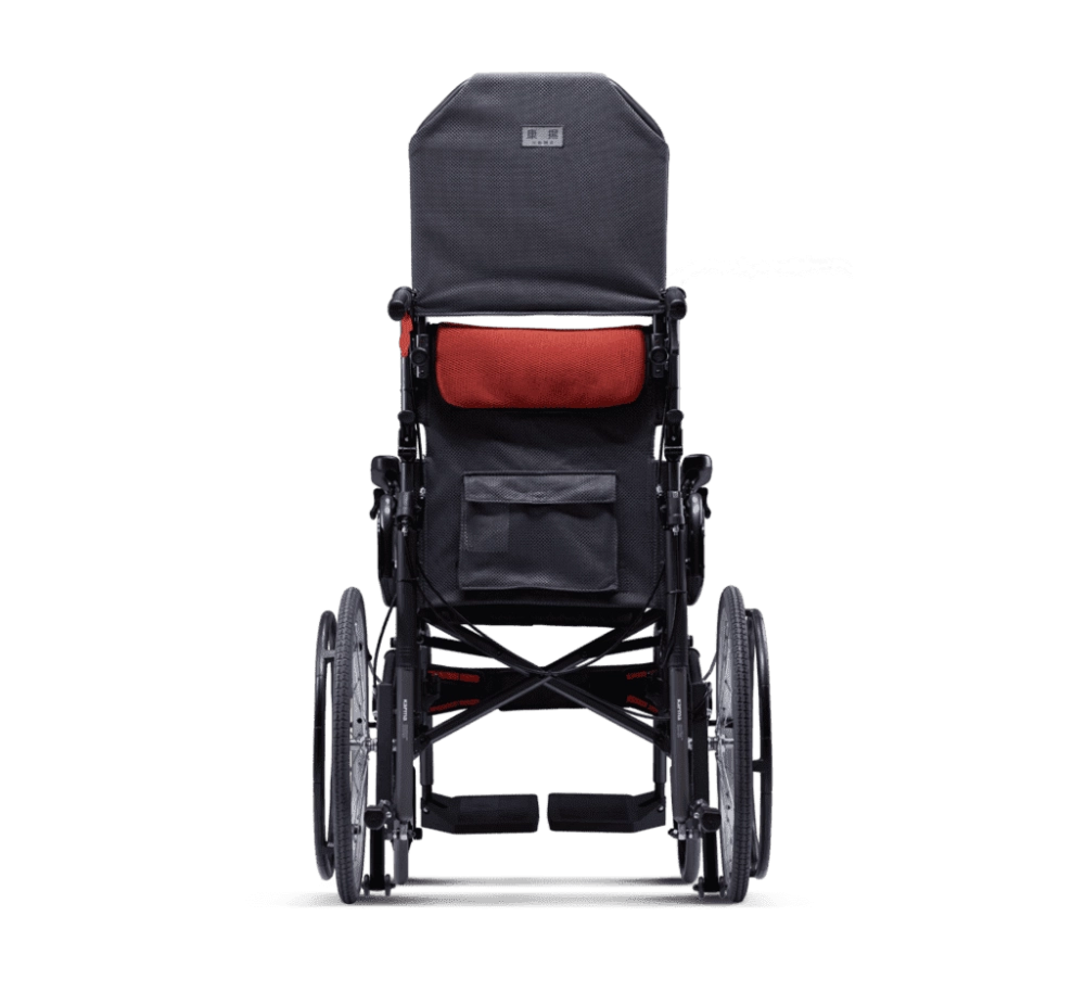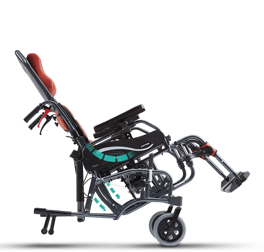 氣壓式空中傾倒讓照護者可以輕鬆省力的將座椅系統抬升,並空中傾倒0-35度,使得乘坐者能藉由變換坐姿,釋放累積在臀部的壓力。