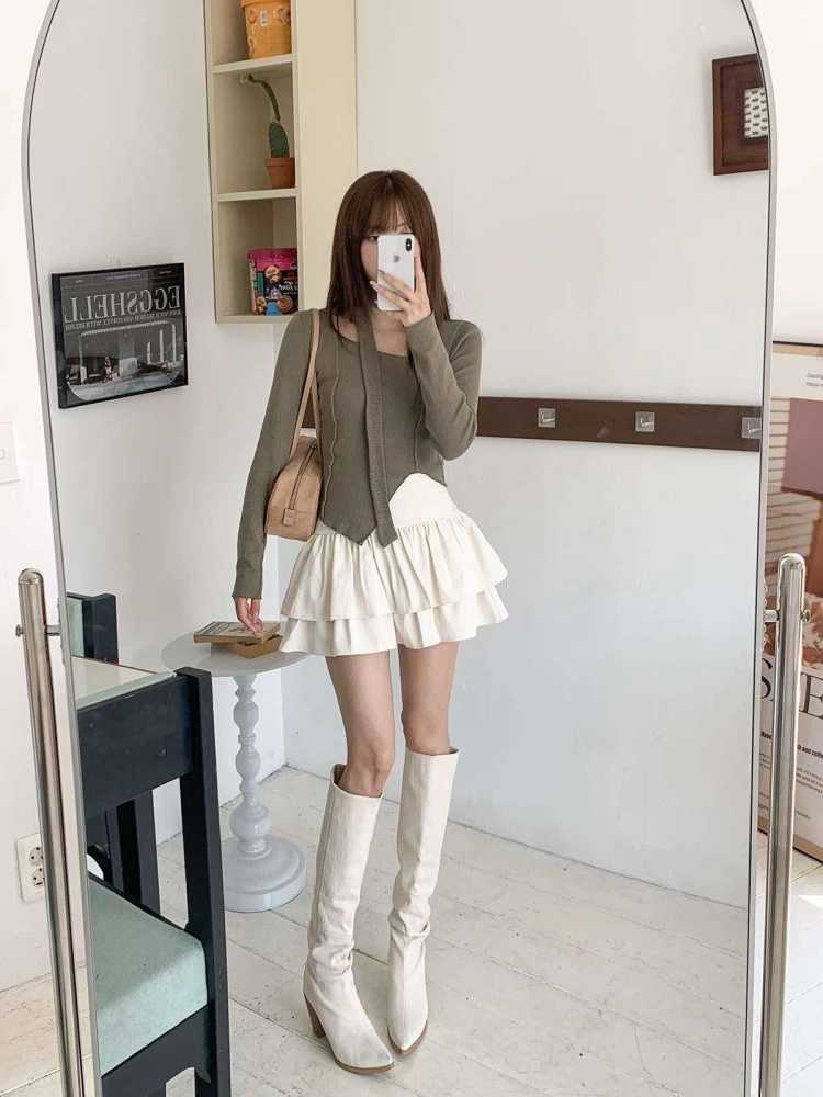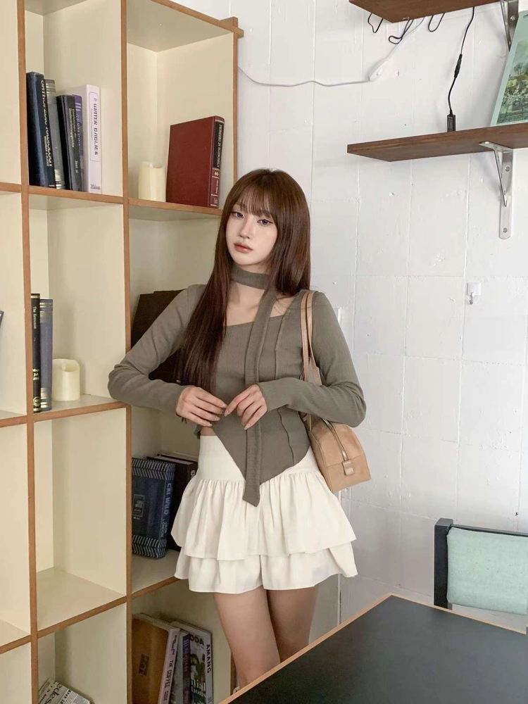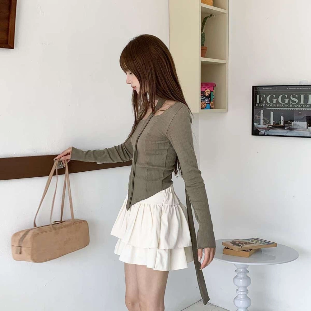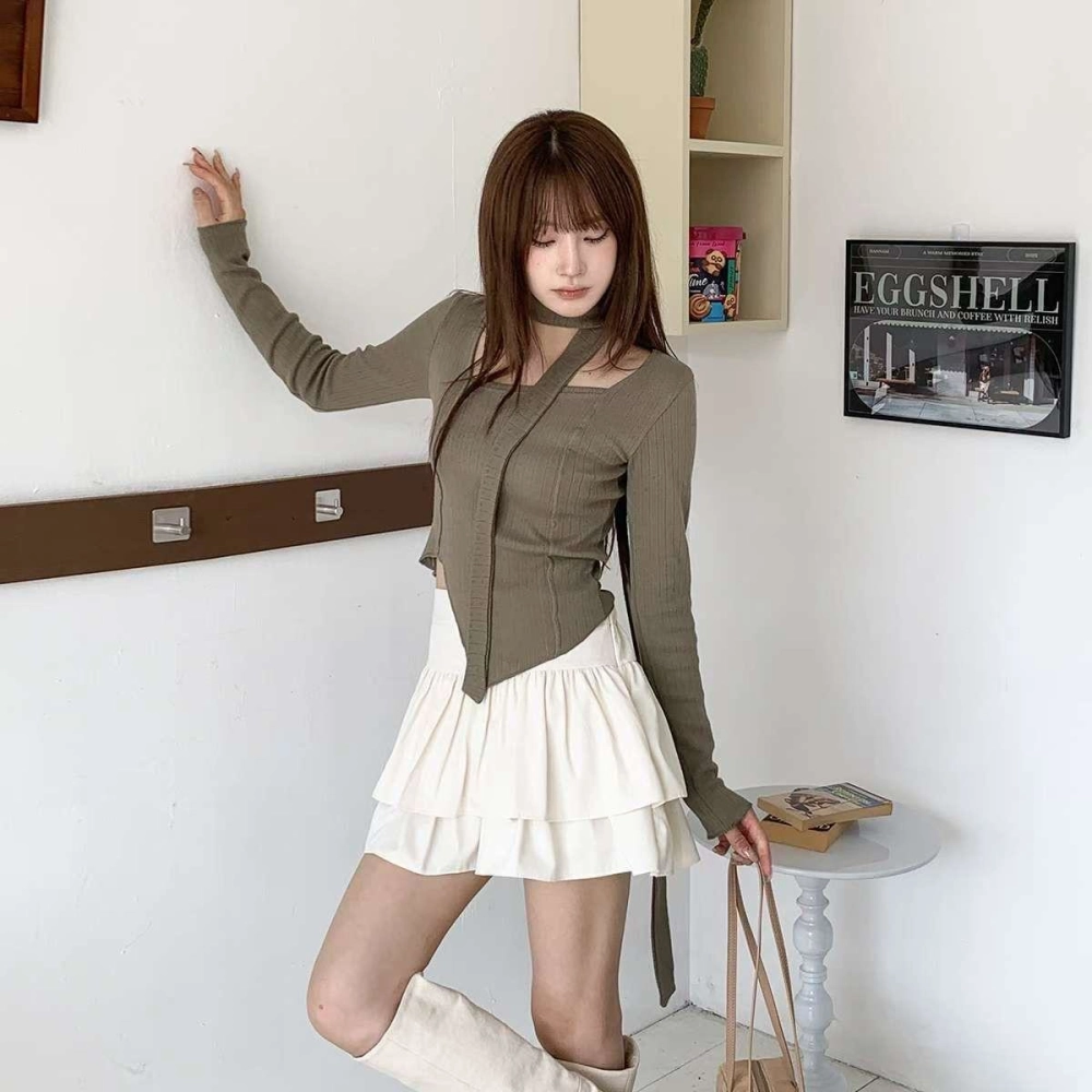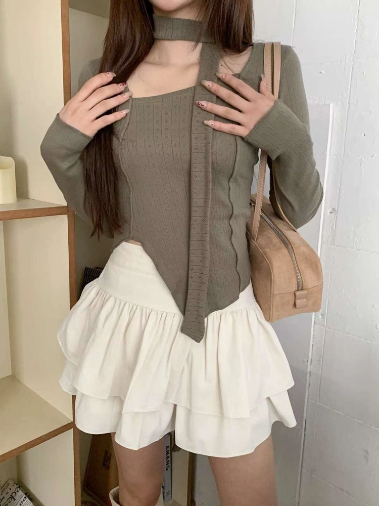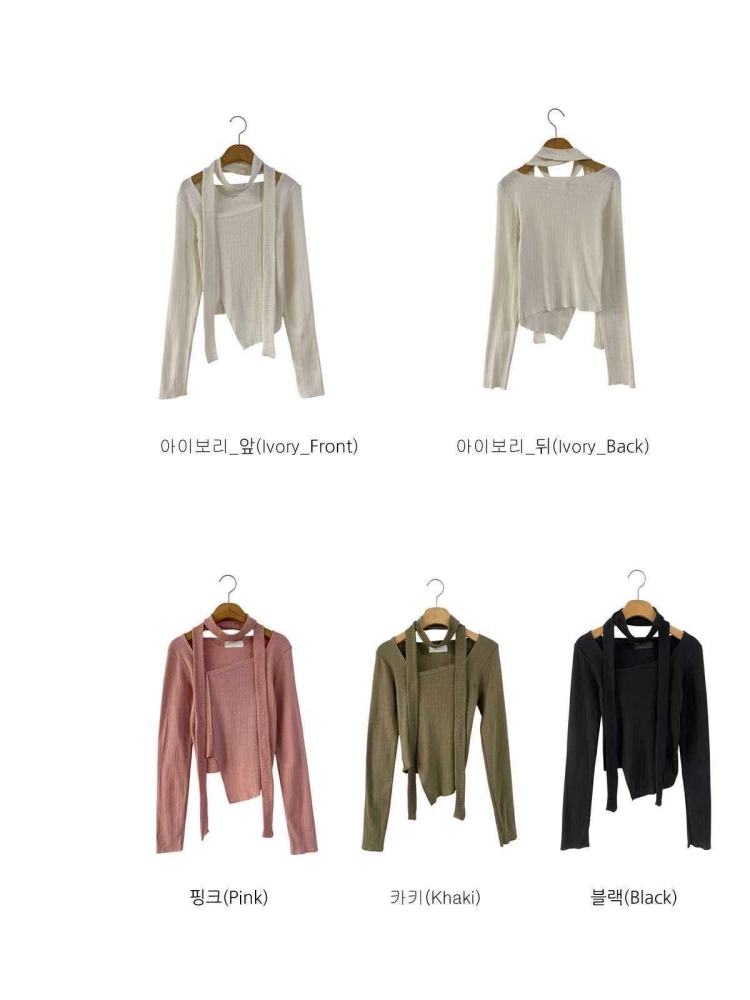 • 正韓附飄帶立體線條不規則下擺上衣