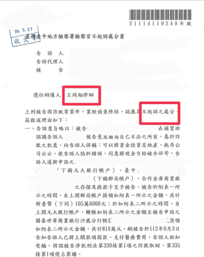 本件被告無端遭猛烈追求者提告詐欺取財,到所與本律師討論並經律師詳閱當事人提供之對話紀錄後,發現告訴人多次說出,其匯款予被告之金錢均係作為行善之用,被告亦確實將該金錢作為行善,因而於偵查庭中向檢察官答辯,被告過程中無任何詐欺行為,告訴人財產交付行為均係出於自願,幸而爭取到不起訴處分,經不起訴後,告訴人更提出再議及聲請准許自訴等程序,均遭地檢署及法院駁回,以還被告清白,有幸陪伴每位無辜之當事人走過漫長訴訟流程,係本律師所嚮往的!