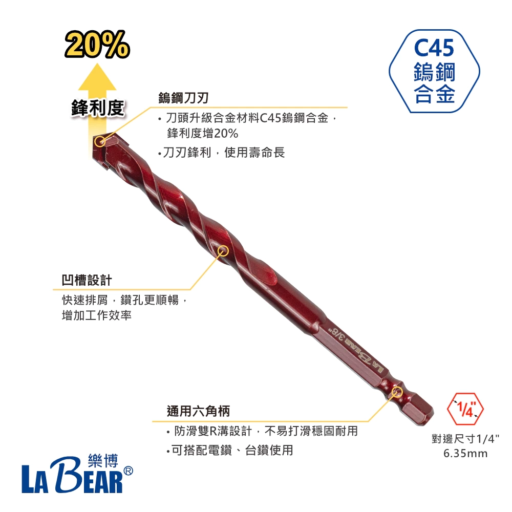 通用六角柄:防滑雙R溝設計,牢固不打滑,電鑽 / 台鑽都能用。