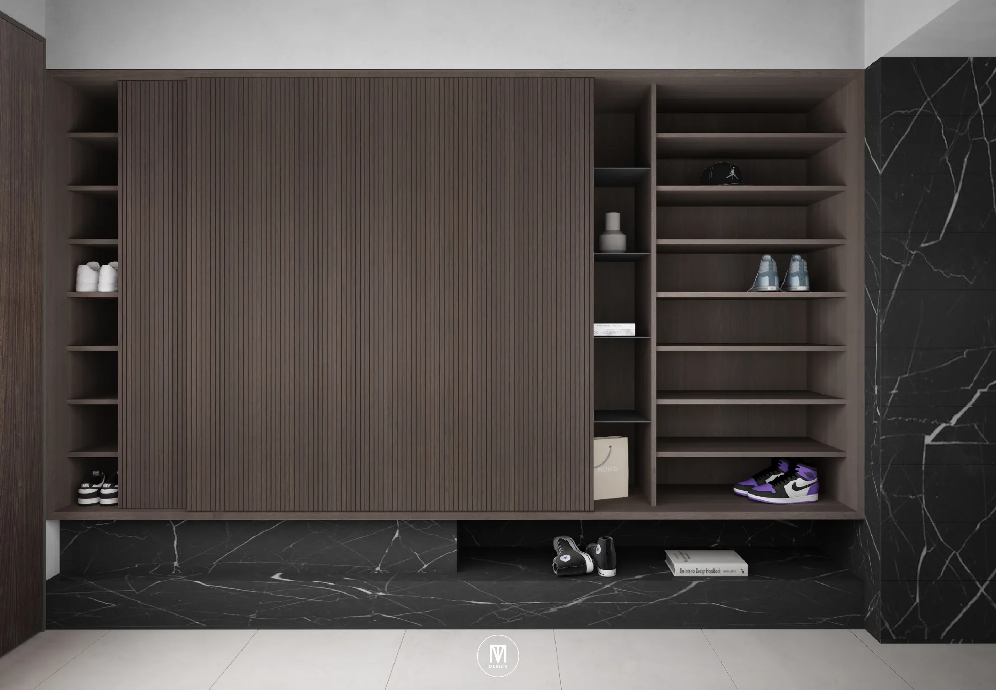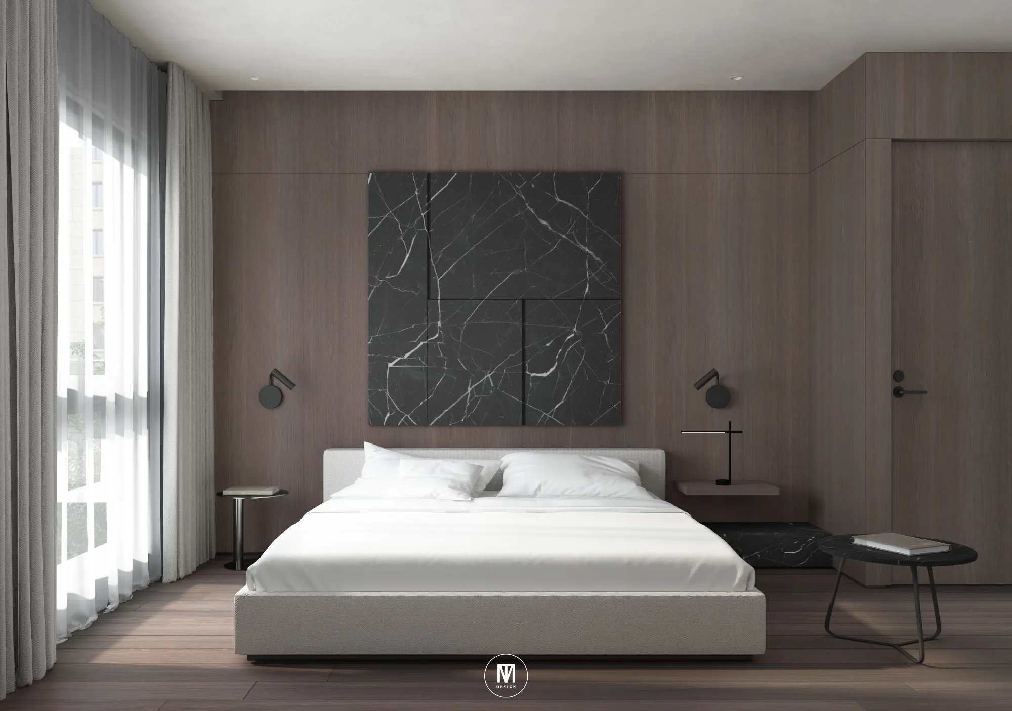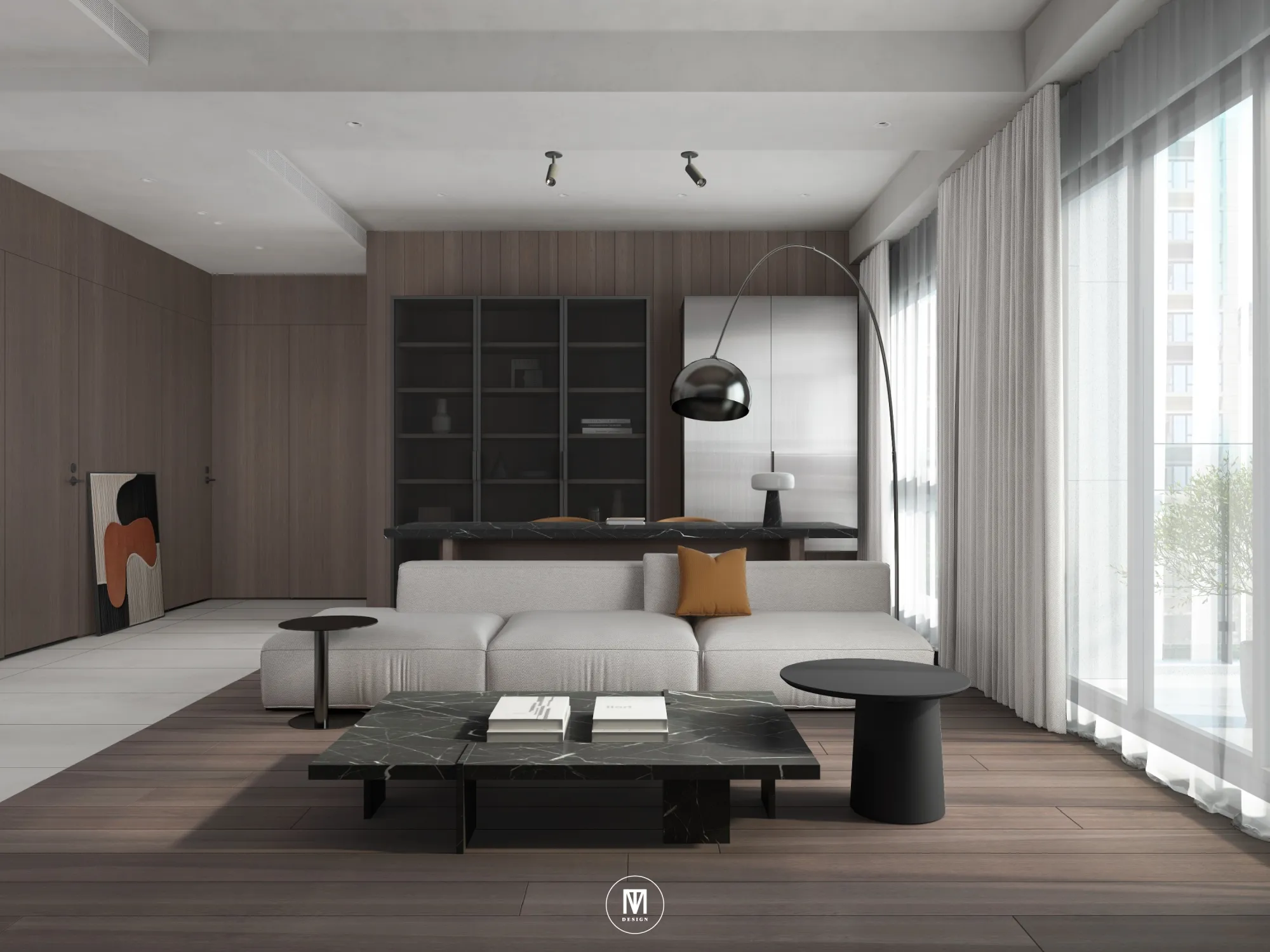 Large expanses of wood veneer walls, reminiscent of the earth's texture, soften the cool black marble and metallic sheen, exuding a calming warmth. The black and white marble imbues the space with a dynamic artistic tension, while the beige and gray soft furnishings serve as the gentlest support for daily life.