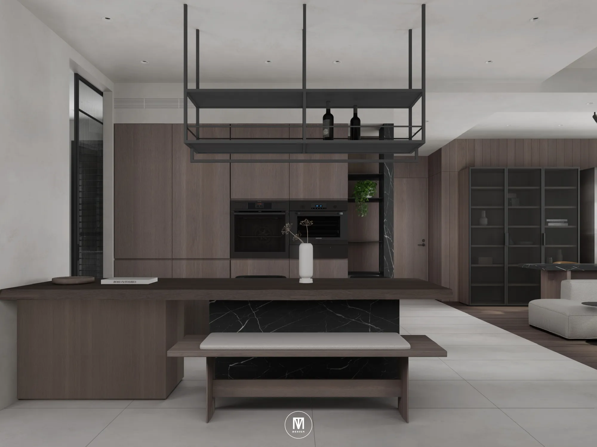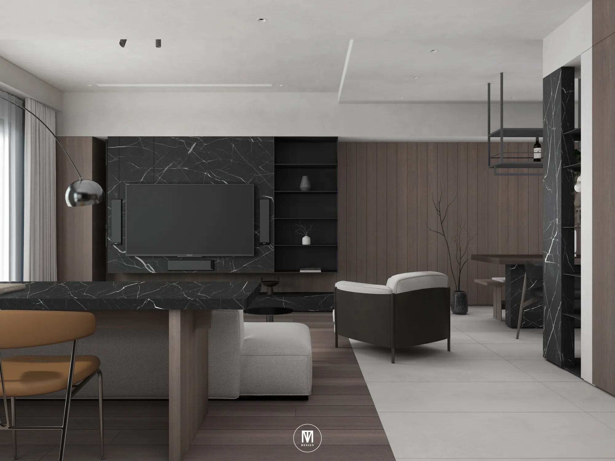 開放式的規劃,讓客廳與餐廚不再彼此分隔,而是成為自然流動的生活場景。木色、黑石與灰白的調和,既內斂克制又蘊含力量,宛如一幅隨時間與光影變化而生動的現代畫作。