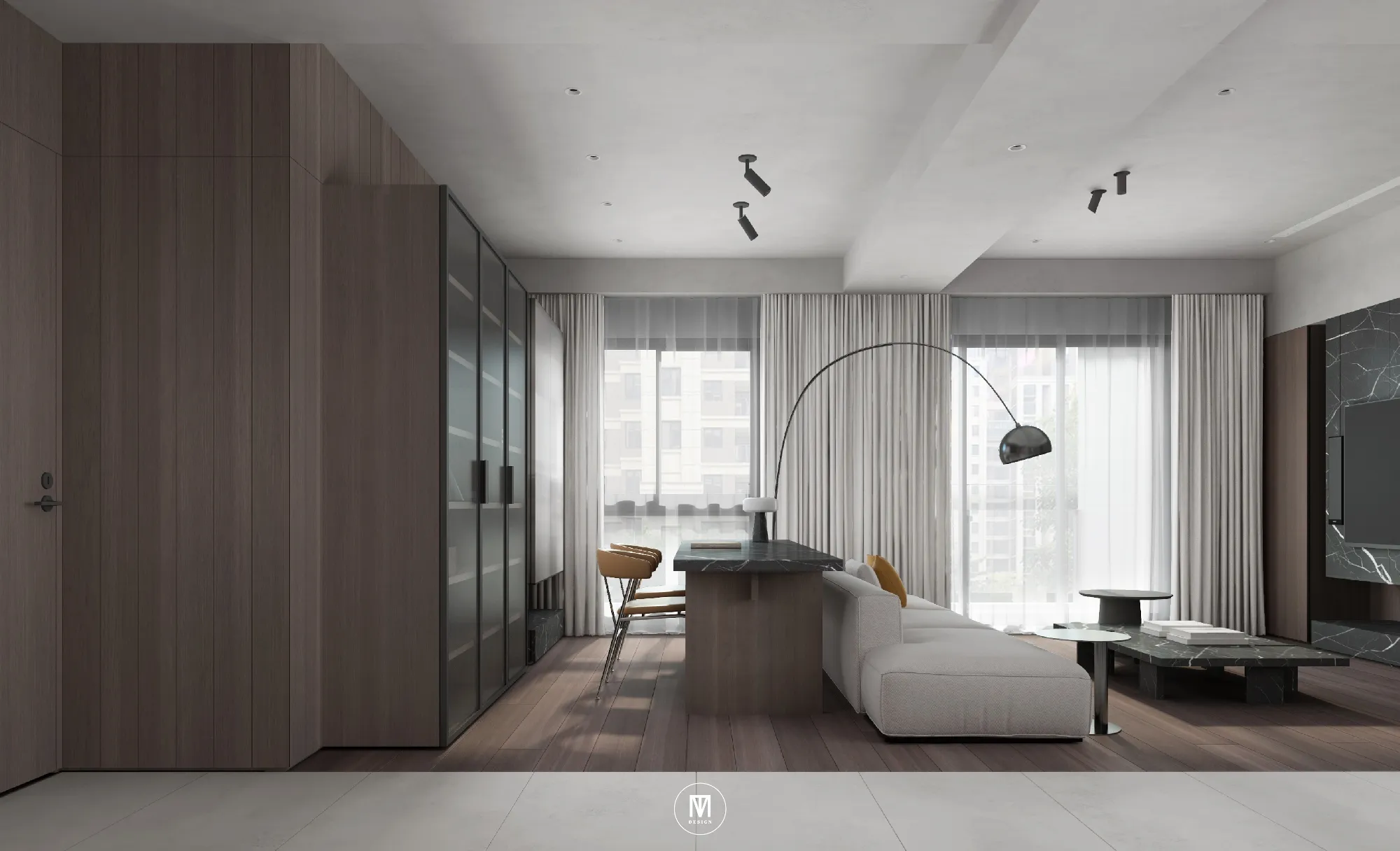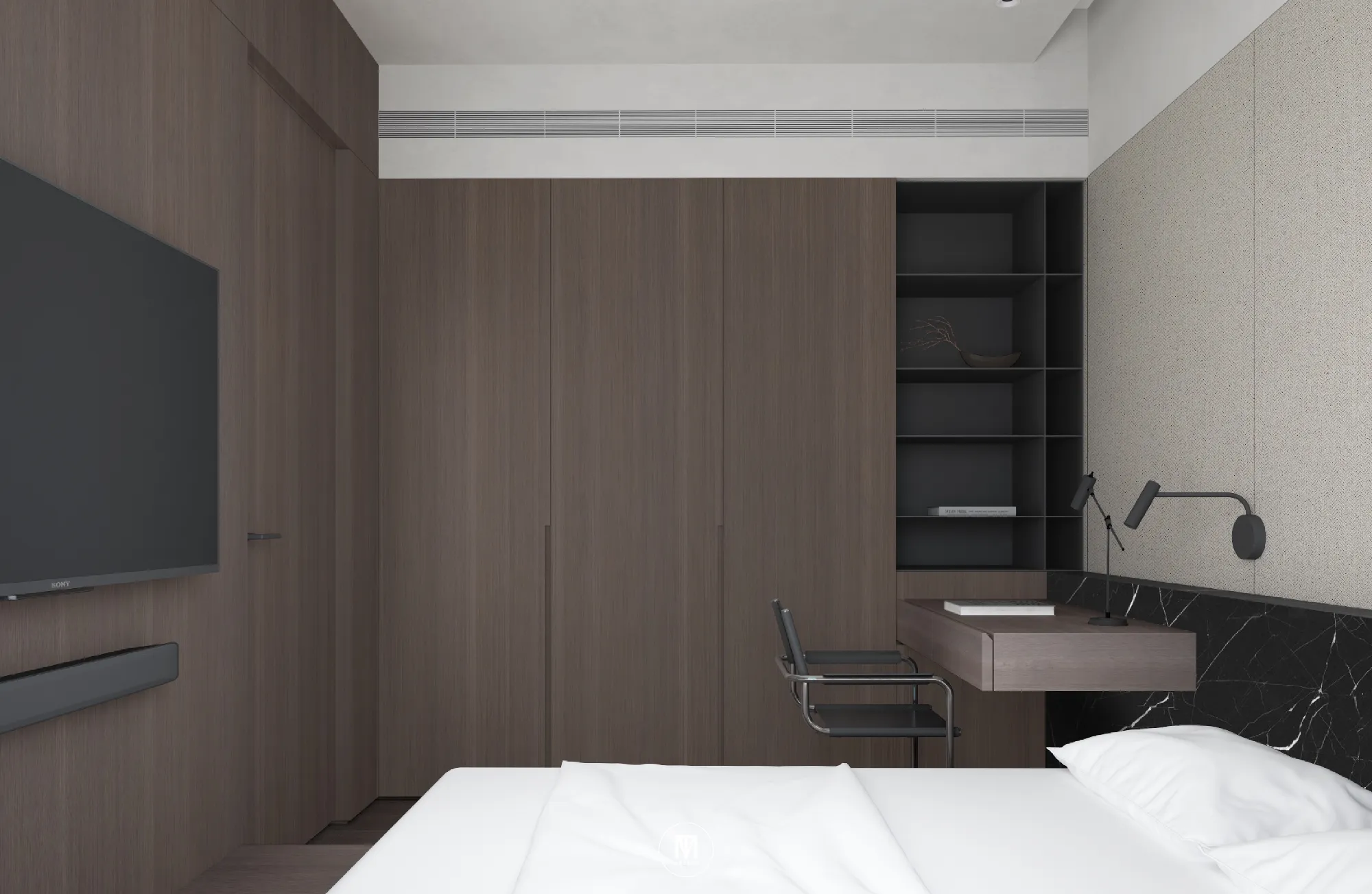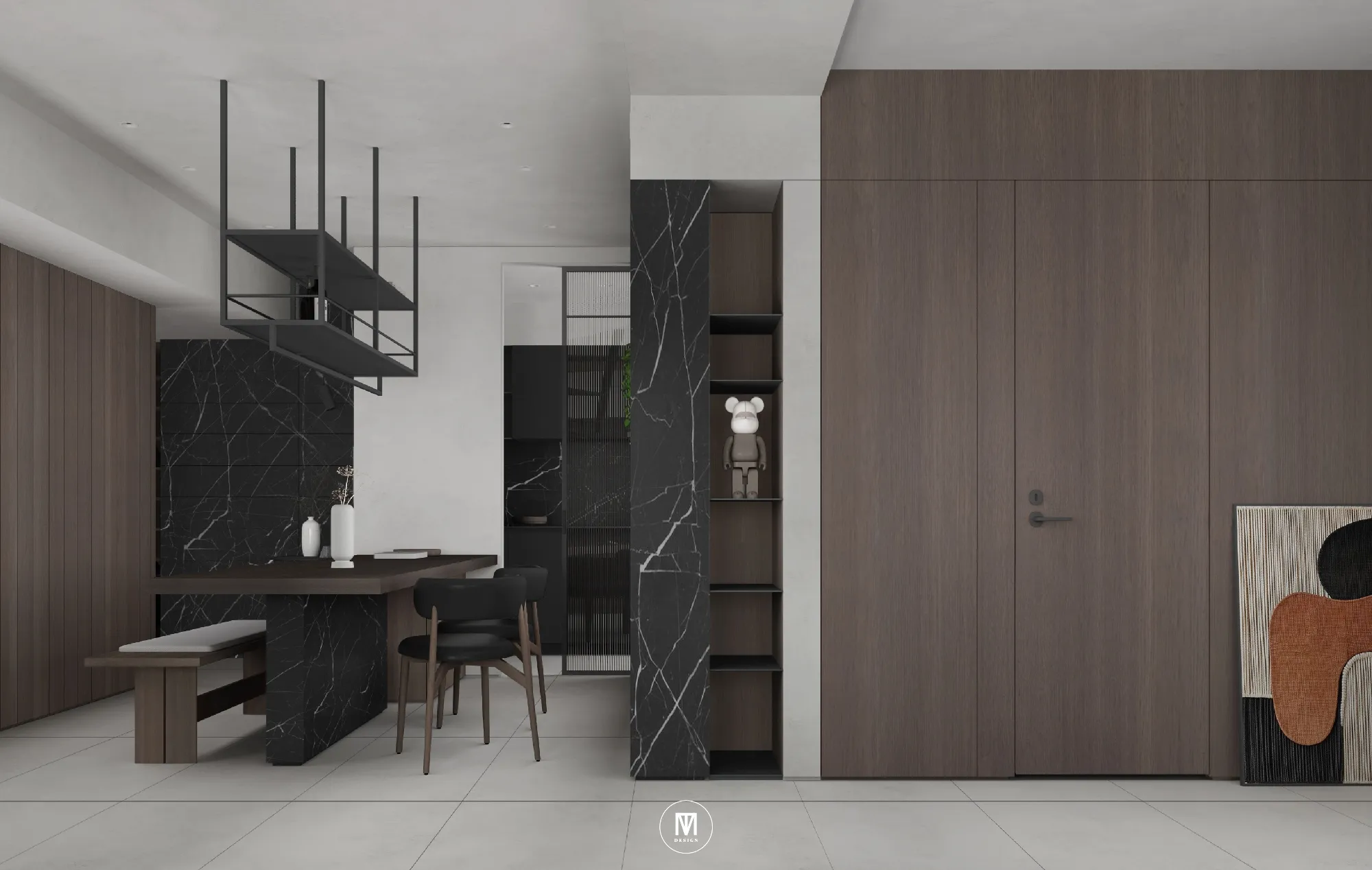 在這組空間裡,設計以深邃的黑白灰為基底,搭配溫潤木質鋪敘出一種沉靜而有力量的氛圍。