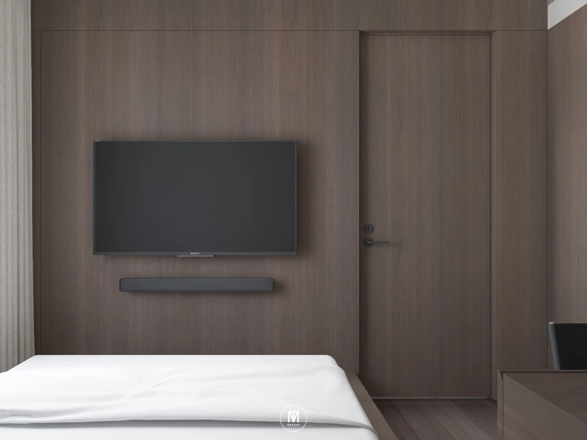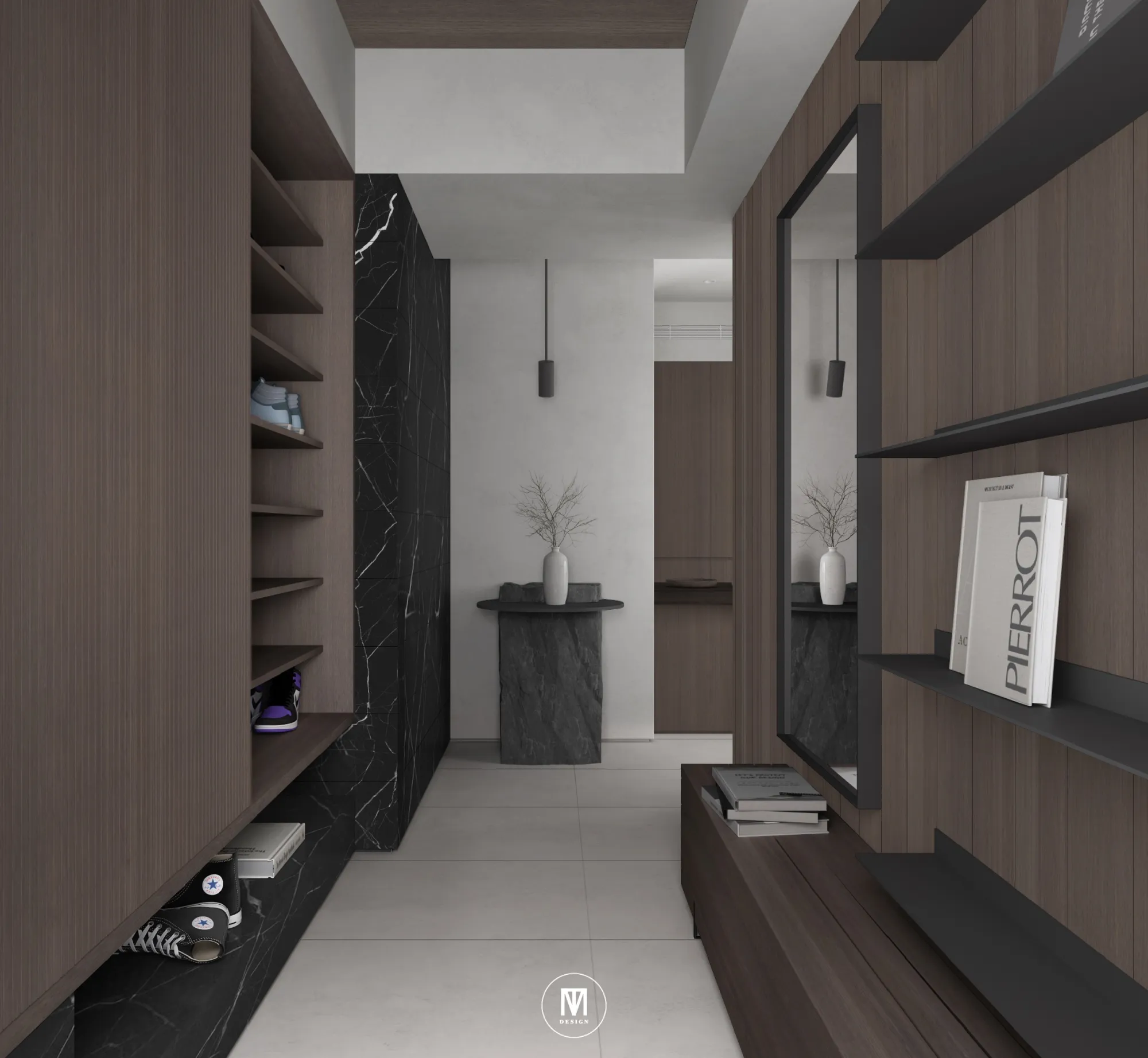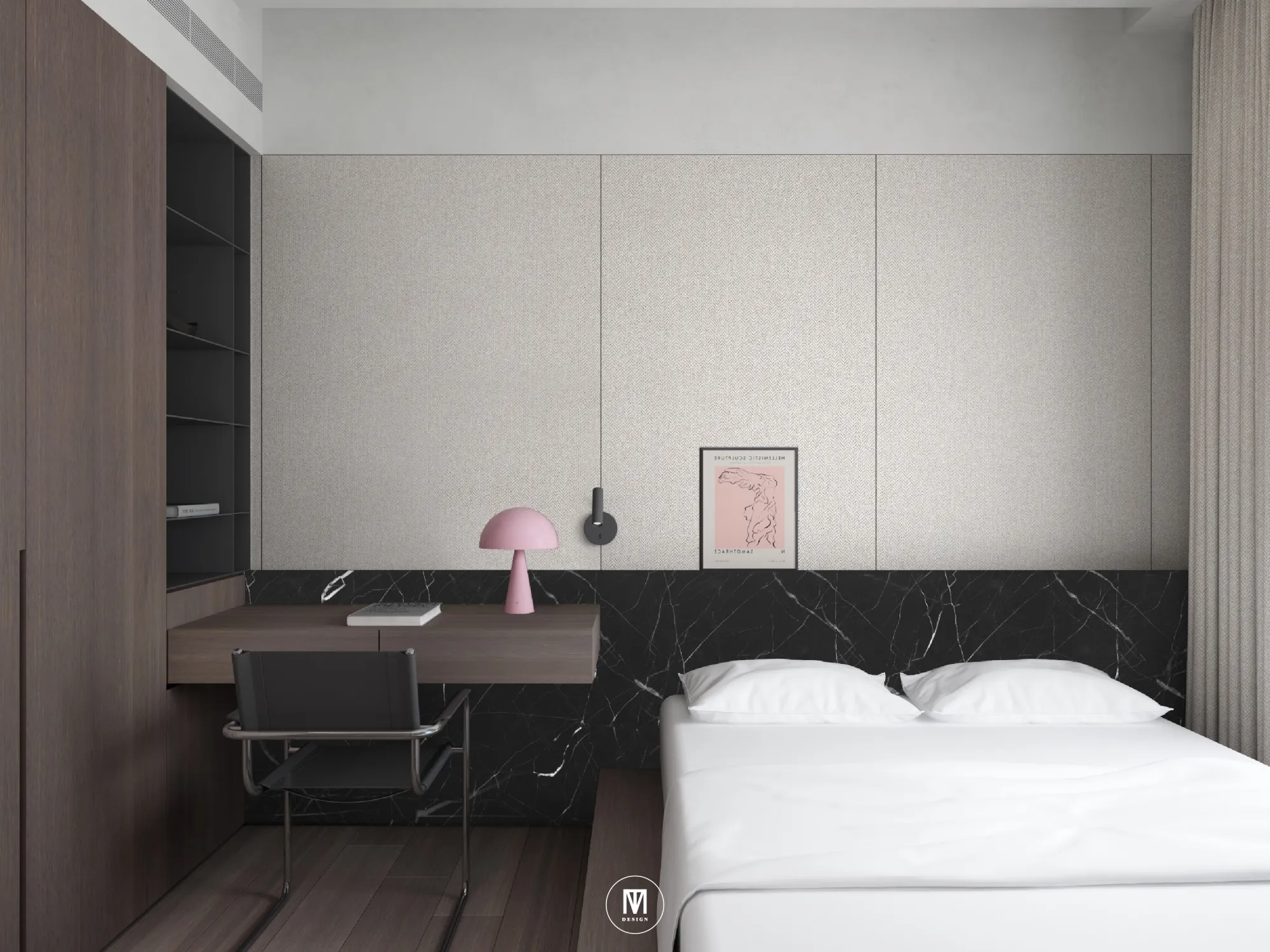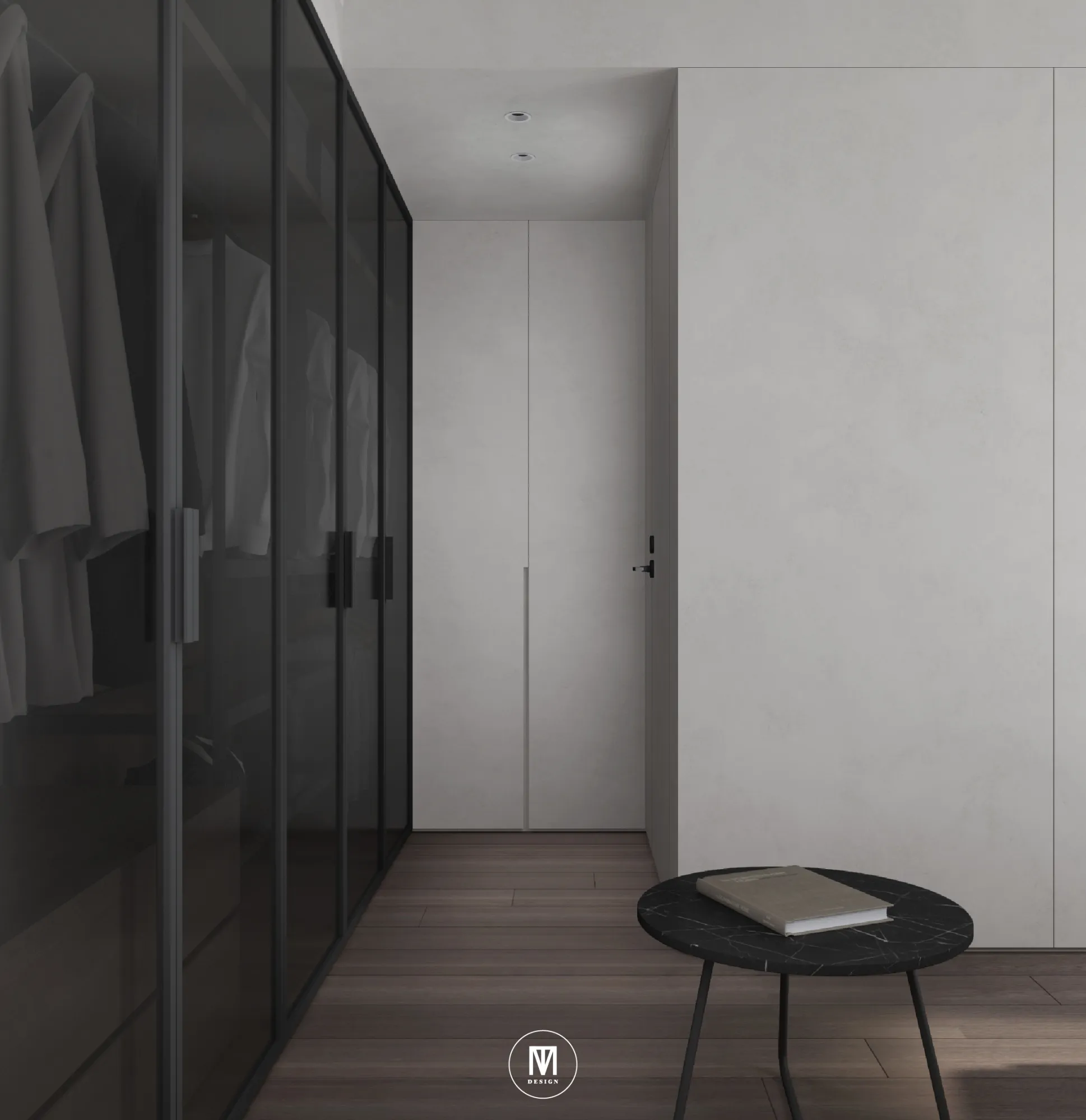 在這組空間裡,設計以深邃的黑白灰為基底,搭配溫潤木質鋪敘出一種沉靜而有力量的氛圍。