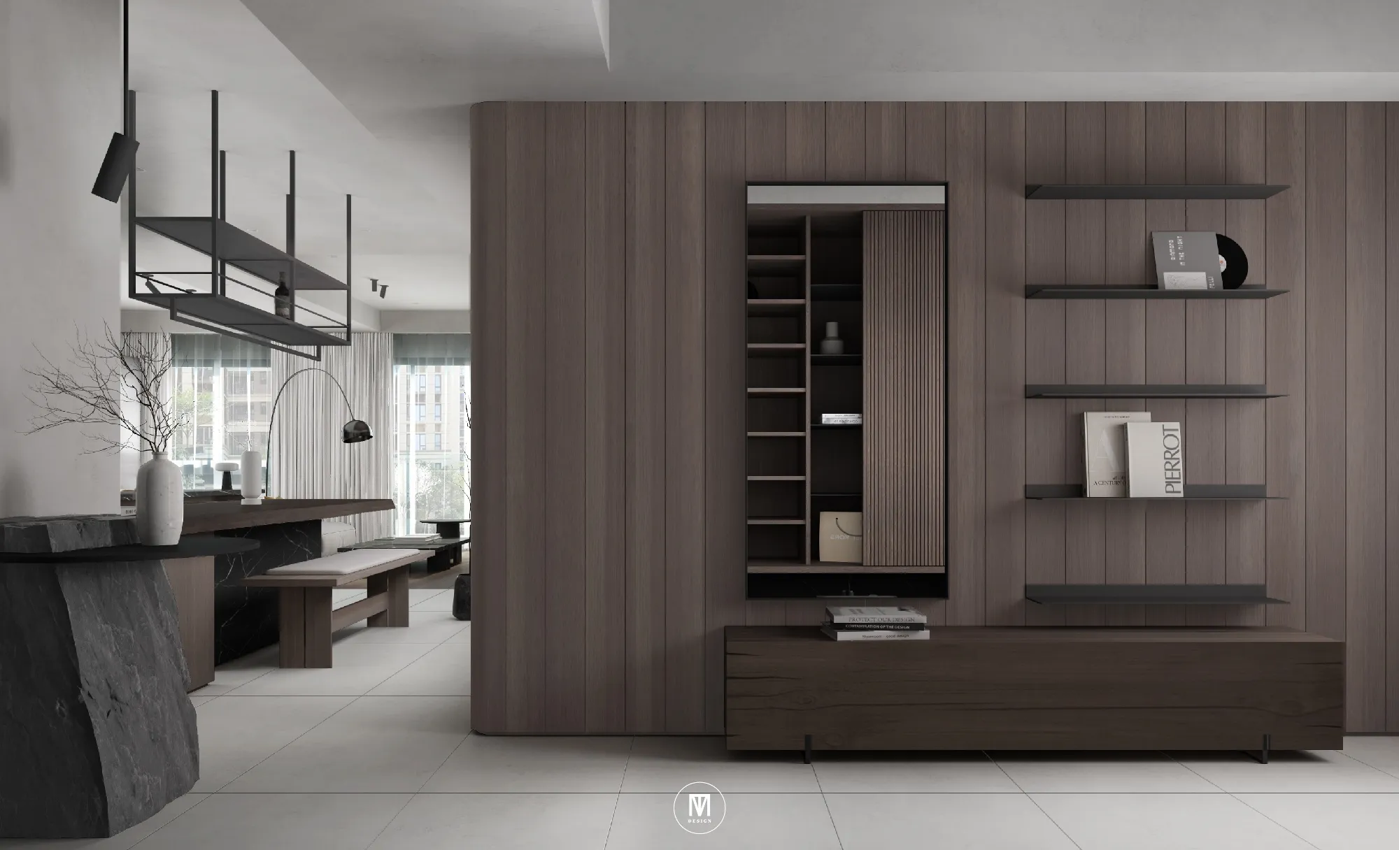 大片木皮牆面如同大地的肌理,將冷色的黑色大理石與金屬光澤柔化,釋放出一股沉穩的暖意。黑白紋理的大理石,為空間注入動態的藝術張力;米色與灰階的軟裝,則成為生活最溫和的承載。