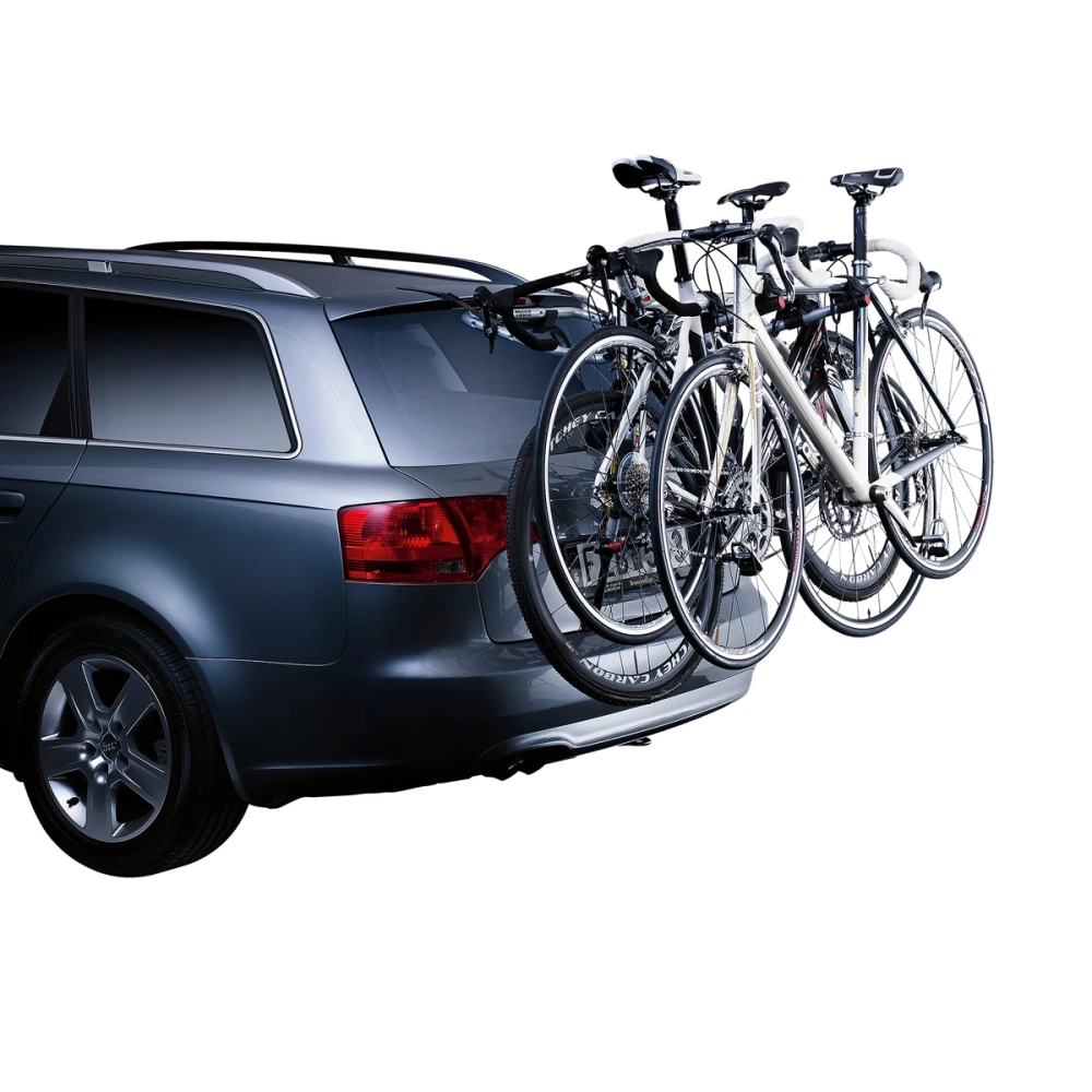 針對旅行車與掀背車而設計、使用簡單的懸掛式車後自行車架 (適合 3 輛自行車)。