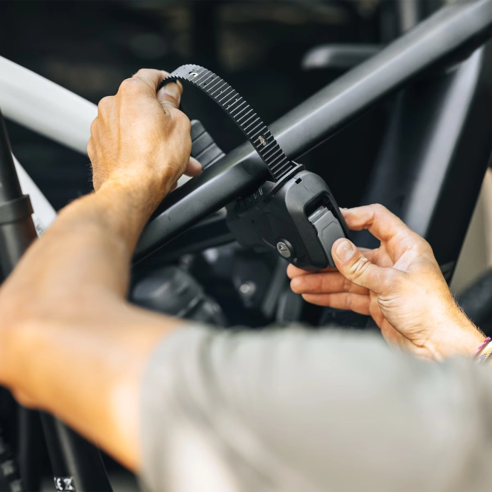 創新的帶子系統適應任何自行車車架尺寸,確保安全運輸且不費力氣。Thule VeloTrack 安裝不需要鑽孔,可以輕鬆拆除。使用可選的燈板配件,車架可以安裝在廂型車的最低位置,保持尾燈可見。這個較低的位置使得載重自行車更加容易,因為需要抬起的高度減少了。