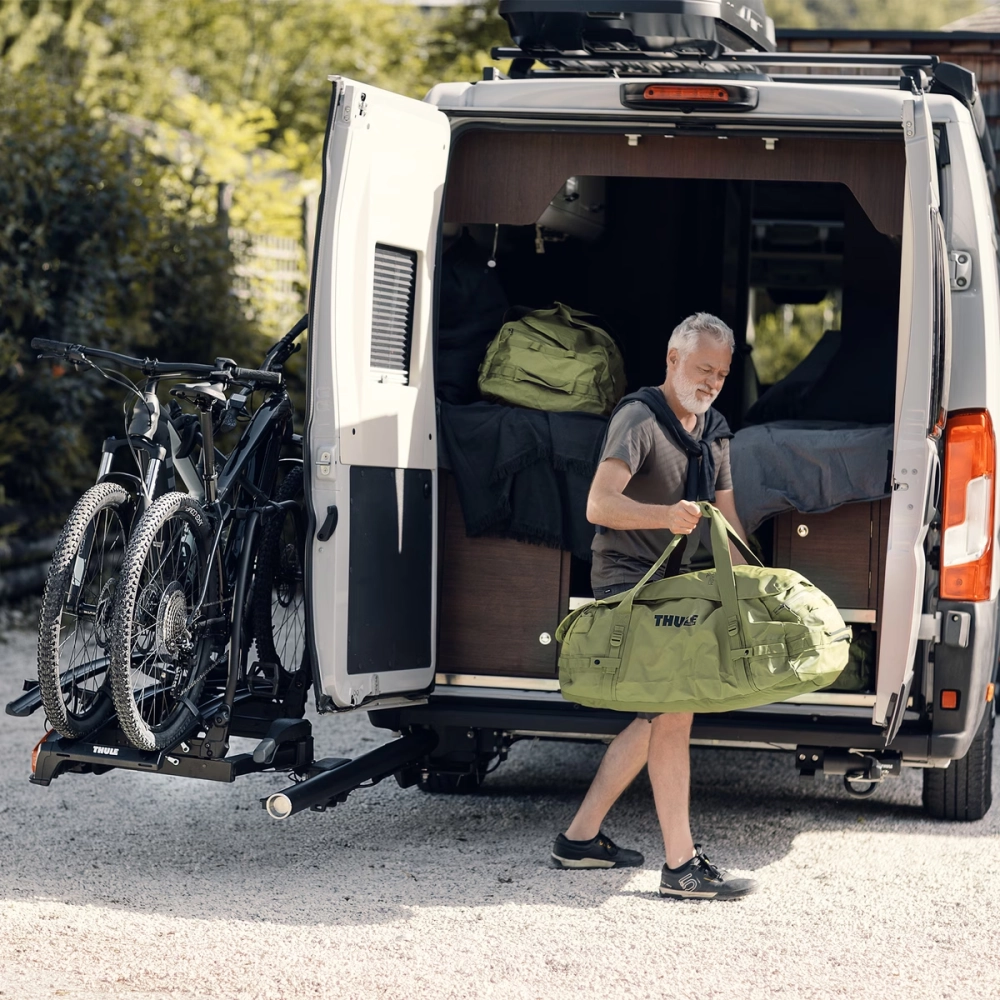 憑藉 Thule VeloSwing,您可以方便地在自己的房車上使用同一款拖桿自行車架,就像普通的車子一樣。如果您需要從後車廂出入,只要將 Thule VeloSwing 揮到一旁就能全身出入後車門,即使已經裝載電動自行車也無妨。如果您需要載運更多包裹,只要移走自行車架,改成安裝拖桿行李箱就可以。