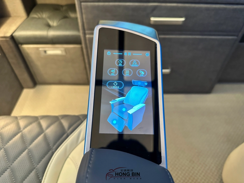 極其尊榮的後車艙設計,宏濱租車打造商務車界中的私人招待所,對於影音設備也超越了LM四座等級,中央設有一組30吋的液晶螢幕,並可透過HDMI界面將手機或電腦畫面投放在螢幕上,旅遊包車行程時可播放影片追劇,商務活動接待VIP貴賓時可做為電腦畫面的投放,近而達到移動辦公室的效果,另外休閒時還可以開啟卡拉OK功能,三五好友閨密們包車旅遊一路歡唱到目的地。