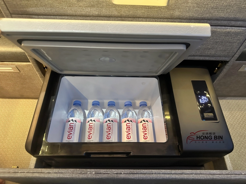 宏濱租車就是貼心,炎炎夏日旅行最希望回到車上時,可以有一瓶透心涼的飲料是多麼暢快,大T6保母車特別配置冷凍級冰箱讓貴賓們享受一趟舒適的旅程。