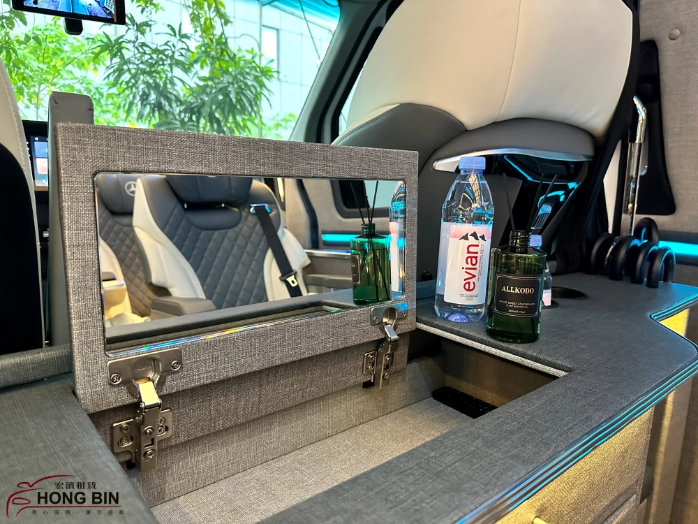 宏濱租車接待無數天王天后級明星藝人及政商名人,精心設計小型梳裝台提供各種不同的客戶需求,四周環繞不透光高質感窗簾,具備隱私防護功能,讓乘客艙可享受絕對的隱私及便捷的梳化空間。