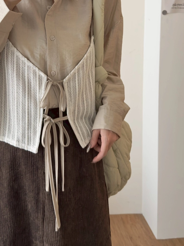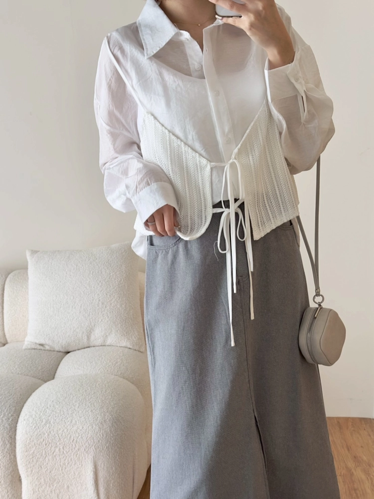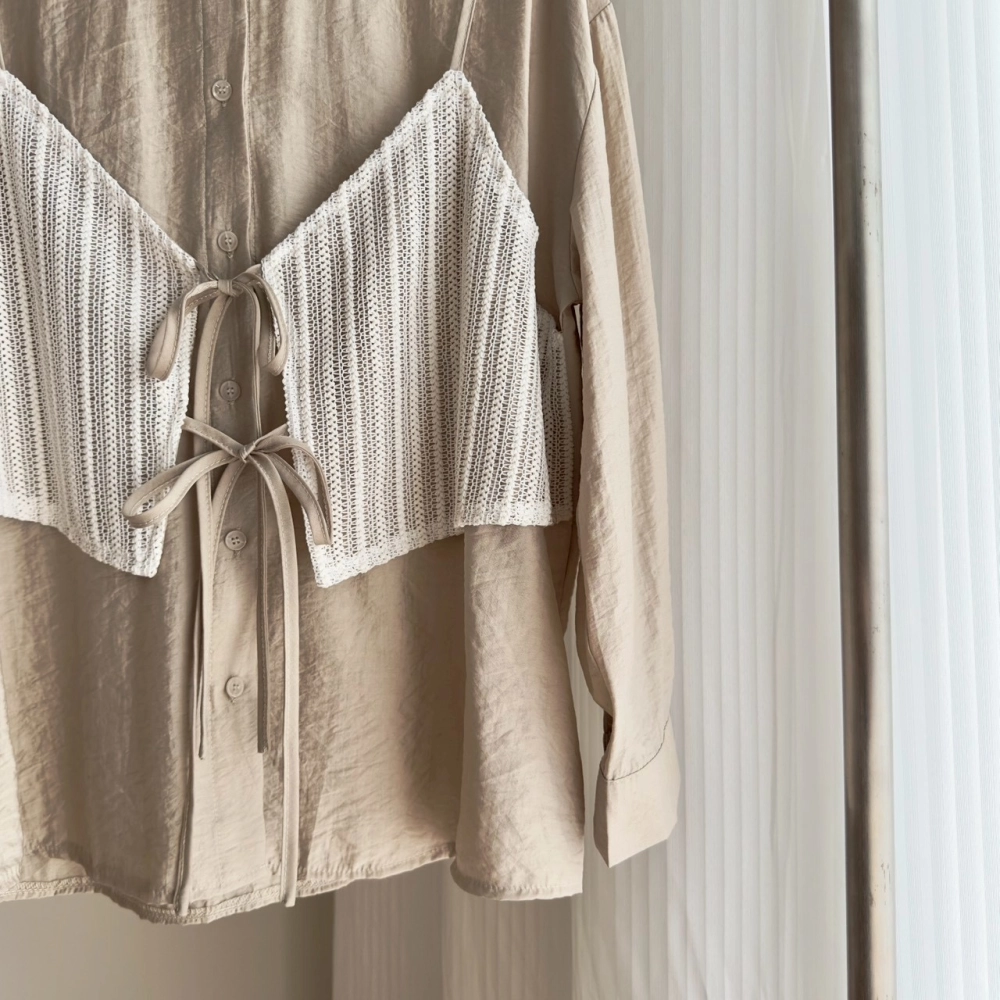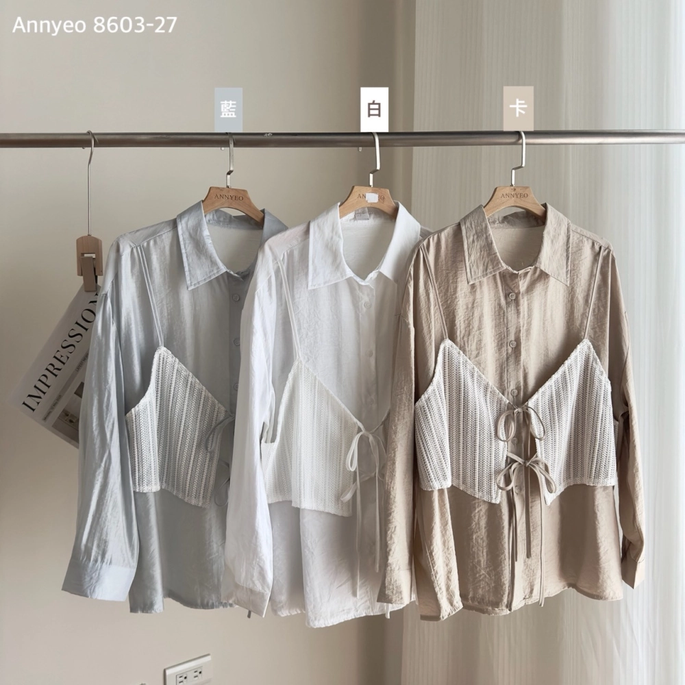 • 針織細肩綁帶假兩件襯衫