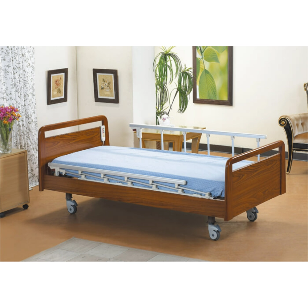 交流電力可調整病床是為了醫療目的,由具有電動馬達的床以及可遙控的器材組成,可讓患者操作以調整床的高度及床面彎度,此器材包括活動式,可鎖定的雙側扶欄。