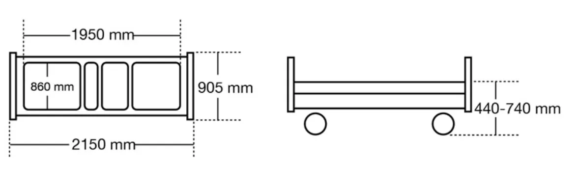 外觀尺寸:L2150mm x W905mm (護欄下降)