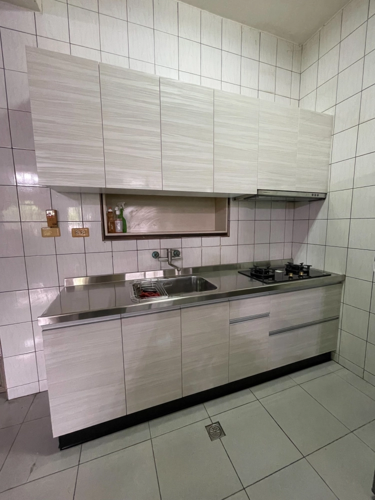 230公分,下櫃304不鏽鋼桶身,上櫃木芯板70高,美耐板門 下 上崁鋁手把,上 無手把,60公分水槽,304不鏽鋼檯面,爐下大拉二組,一抽莊頭北5693超薄油煙機,莊頭北8503瓦斯爐。總價53500。含清運舊廚具,不含水龍頭