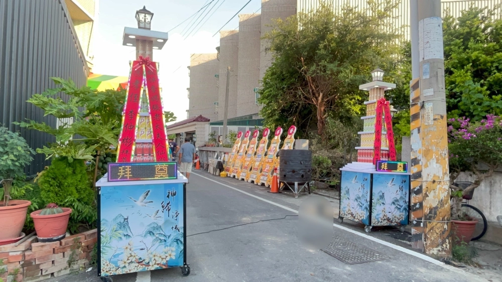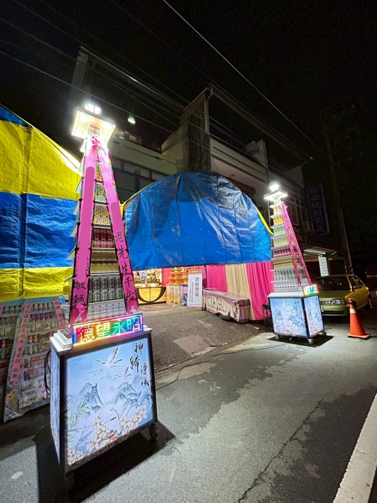     炫彩:層層多色漸層燈光,每一層板皆有燈條,適合夜間葬禮,優點為燈光形式絢麗吸引目光,缺點正好與白光優點相反,燈光較暗、布條姓名不明顯、用電瓦數較高,夜間燈光明顯白天較不顯目。