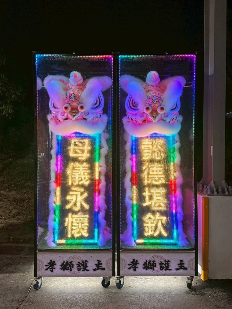喪用靈獅是近年來常見的喪禮擺設之一,靈獅寓意守孝護主,並且引領逝去的親人順利前往西方,不受外界邪靈干擾,確保靈魂安穩前行。