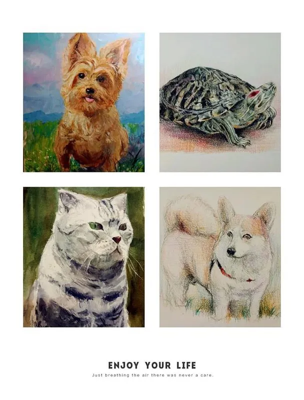 寵物肖像畫選用的作畫媒材主要有鉛筆、水彩、色鉛筆、壓克力、油畫等等,基本上是以寫實風格為主,如果有想要一些風格主題上的變化,也可以討論看看,工作室會以最專業的方式來呈現寵物最有特色的一面。