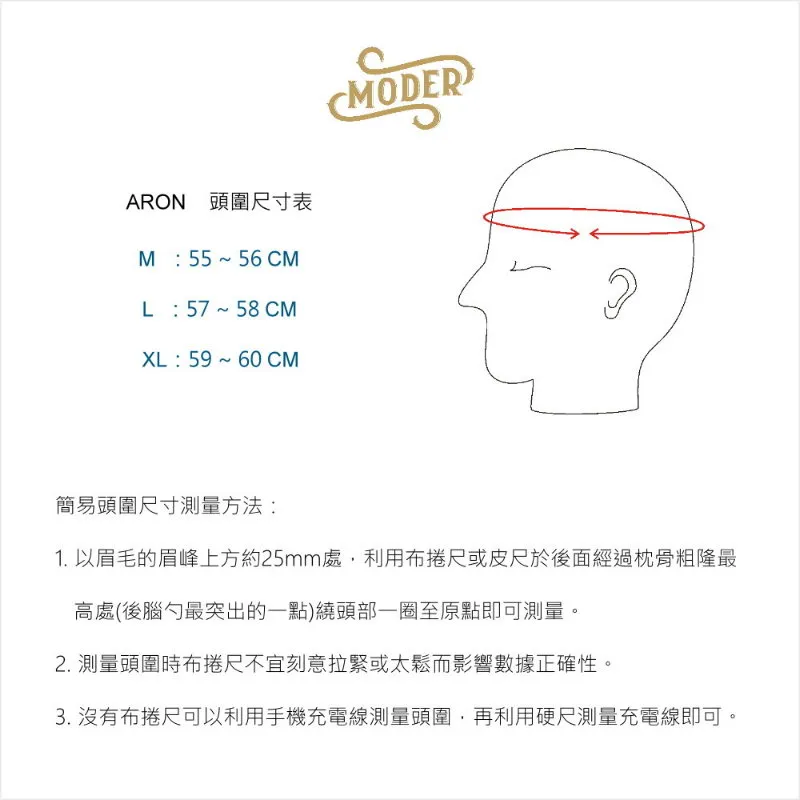 頭圍尺寸: M (55-56cm)、L (57-58cm)、XL(59-60cm),請參閱下方頭圍尺寸表及試戴報告表。