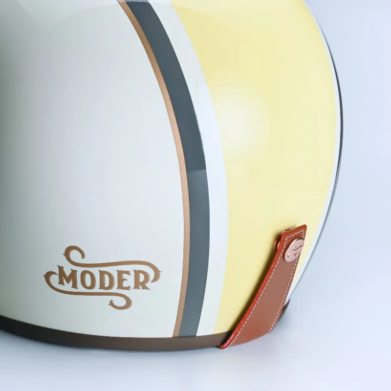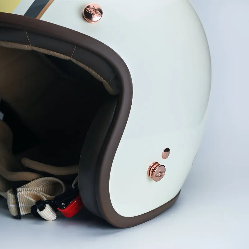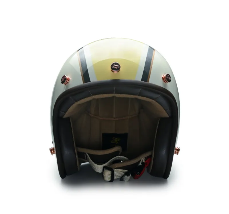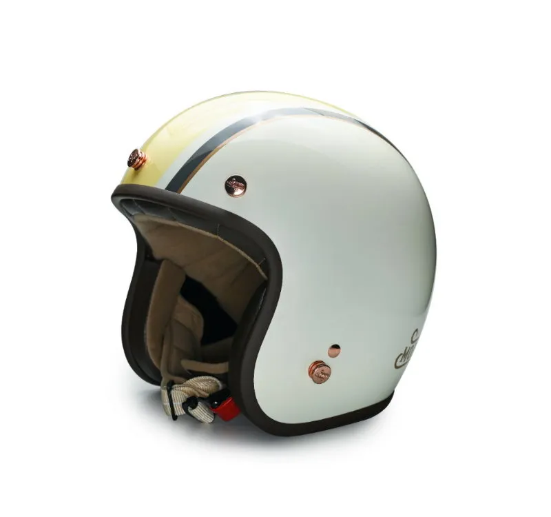 新品MERLIN以清爽輕盈的色調,加上優雅的英式復古風格和諧共生,新開發的方形極細版邊條,柔質可可色皮革,搭配最親膚的布料內襯,首創紅銅色雕刻釦鐶點綴,可調式乳白色頤帶,金屬賽車等級安全排釦,處處細節皆與眾不同,演繹專屬您今年春夏的模樣。
