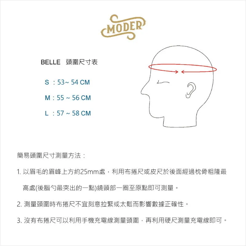 頭圍尺寸:S (53-54cm)、M (55-56cm)、L (57-58cm),選購前請參考下列頭圍測量圖表