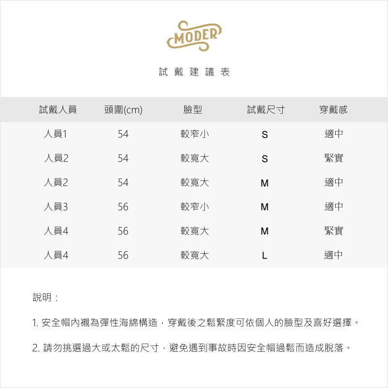 頭圍尺寸:S (53-54cm)、M (55-56cm)、L (57-58cm),選購前請參考以下頭圍尺寸建議圖表。