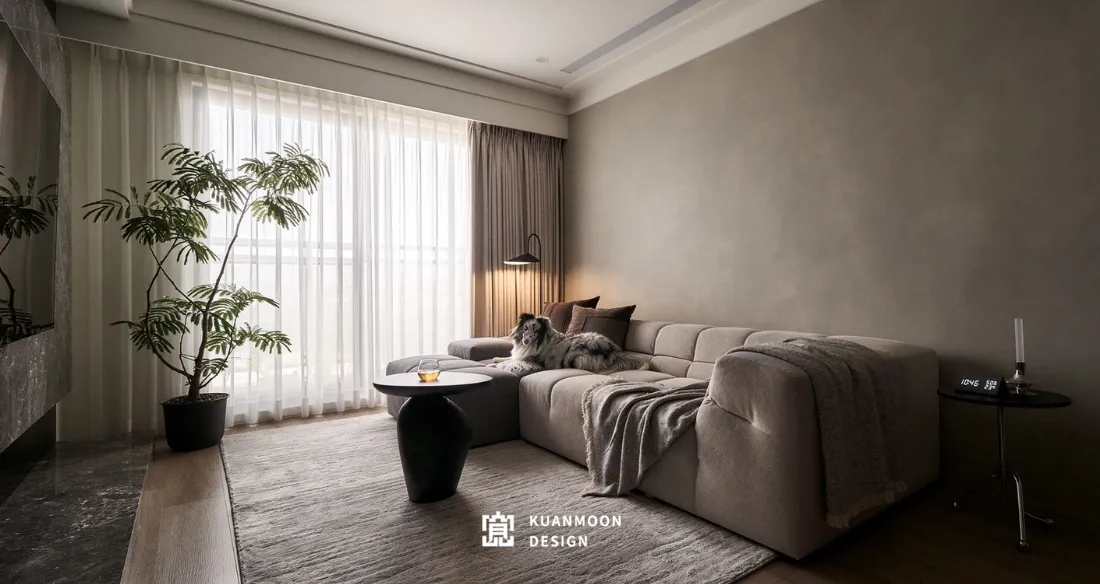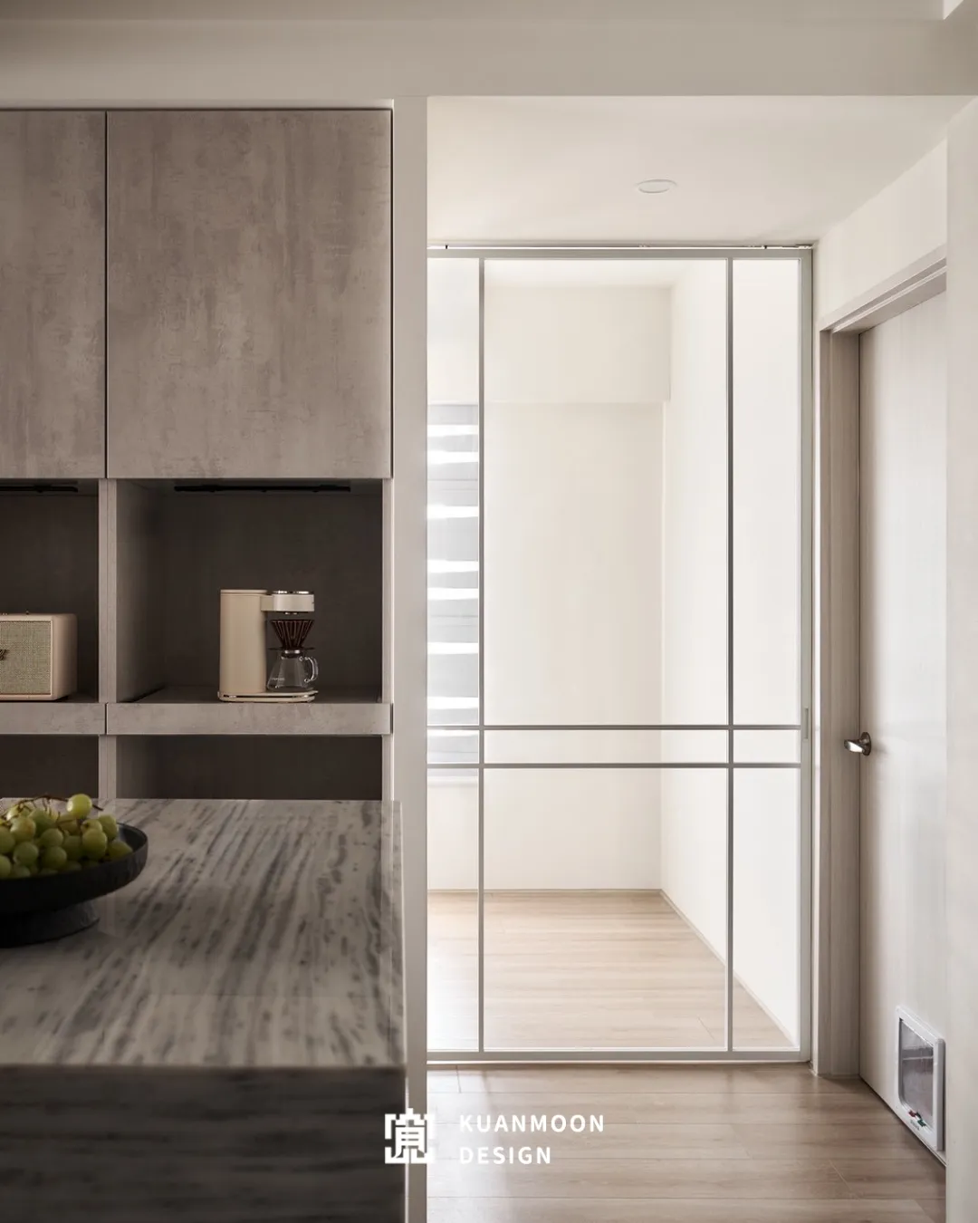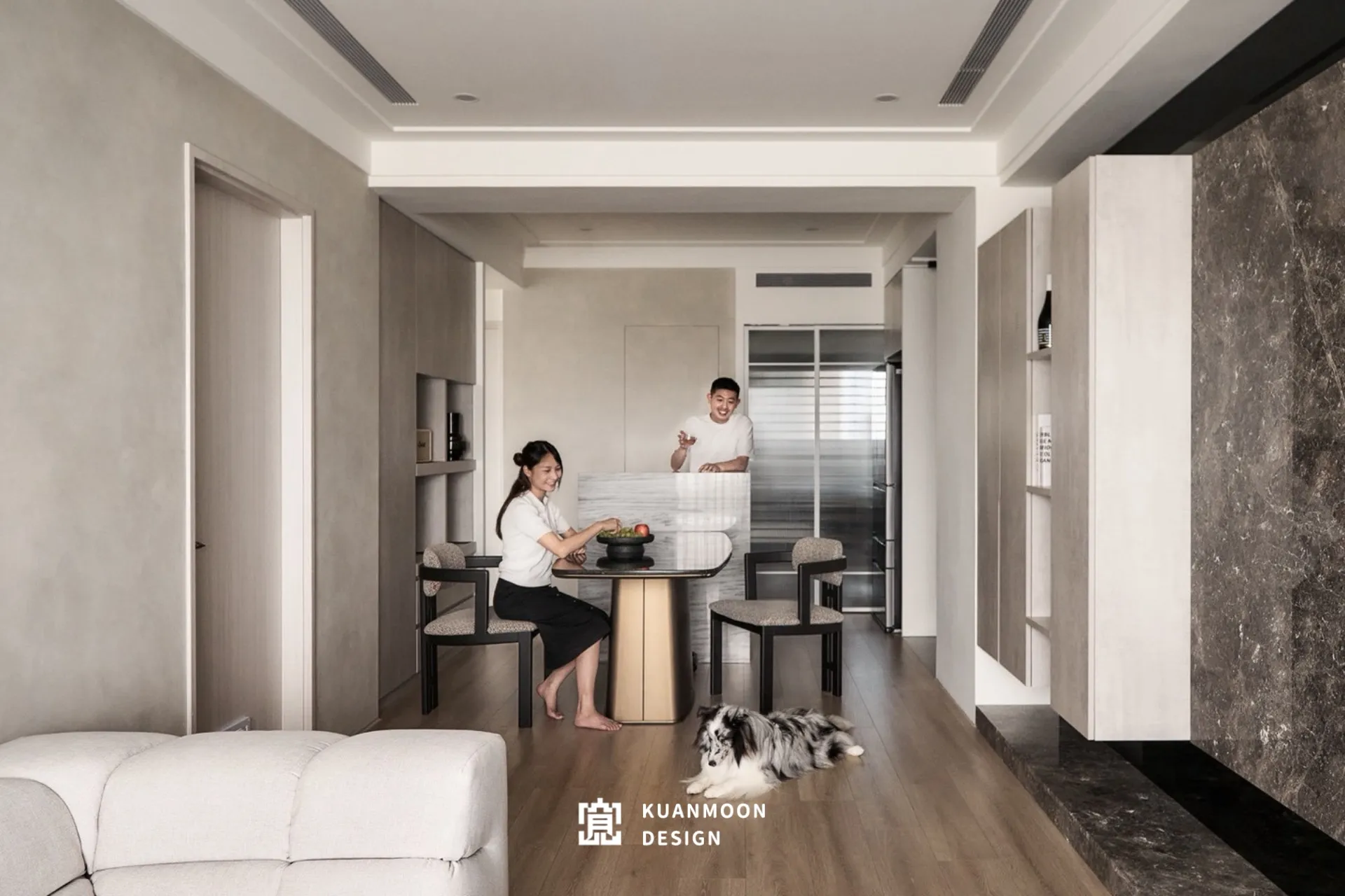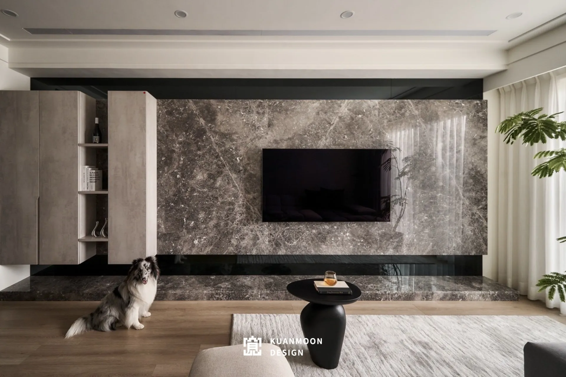 空間中使用大理石、系統板材、藝術塗料及建築貼膜,結合家具、牆面與地板的配色,呈現出層次豐富的現代混搭質感。房間門則改造為寵物門,並運用貼膜改變顏色,使整體風格更統一;沙發與牆面藝術塗料的選色,呼應屋主對沈靜色調的偏好。